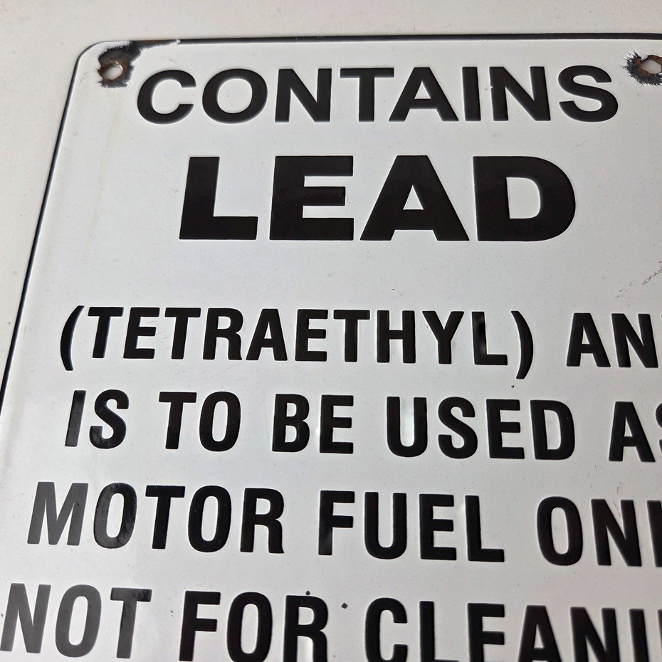 - Vintage Contains Lead porcelain sign.