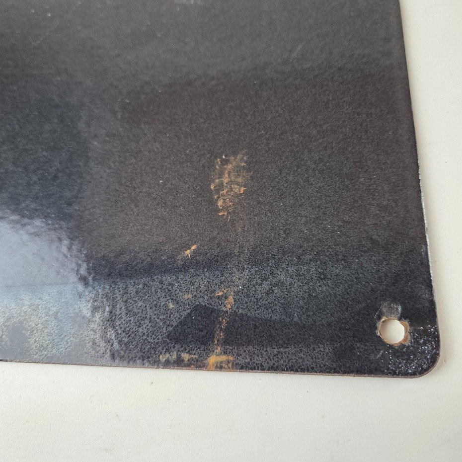 This vintage porcelain sign features the Contains Lead lettering at the top. Measuring 7″ by 8 3/4″, this sign is in excellent condition and would make a great addition to any collector’s display. The sign is made of porcelain and has excellent black color and gloss.