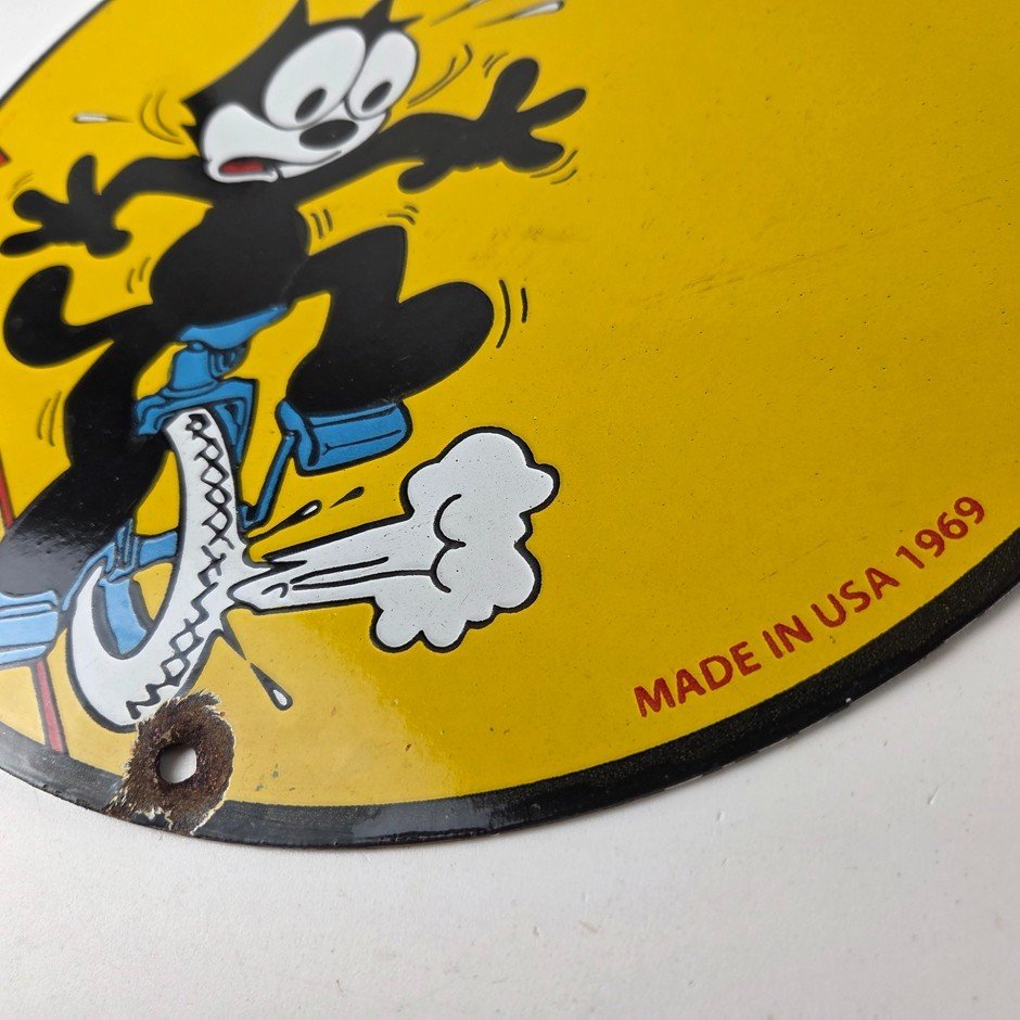This vintage porcelain sign is a neat piece of advertising memorabilia with Felix the Cat. It features the iconic Continental Tires lettering and is designed for use in gas service stations and mechanic shops. The sign is made of high-quality porcelain and is in good condition. The sign is perfect for collectors of gas and oil memorabilia, as well as people who need to fill their garage or shop.
