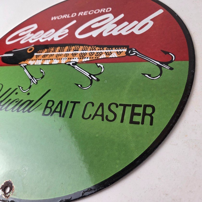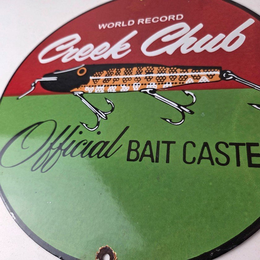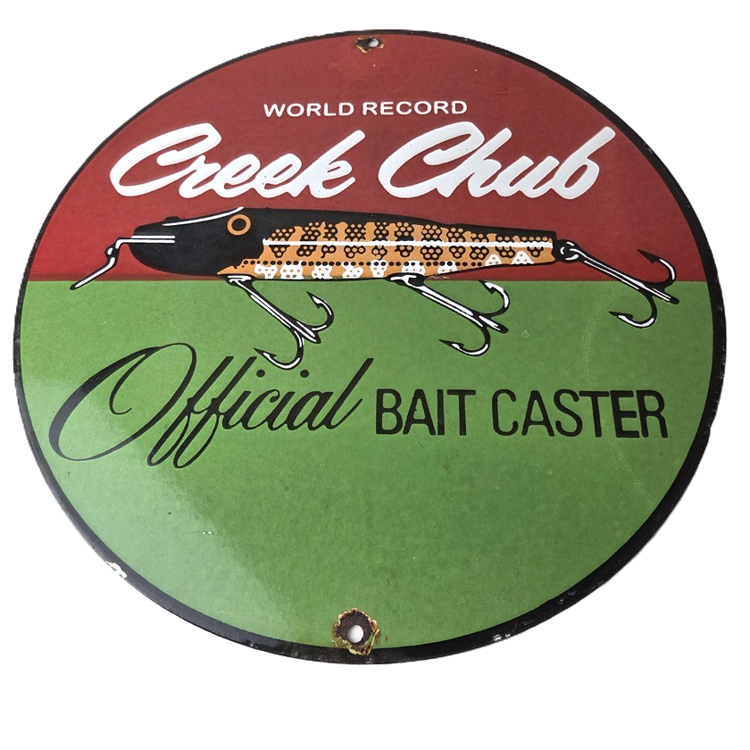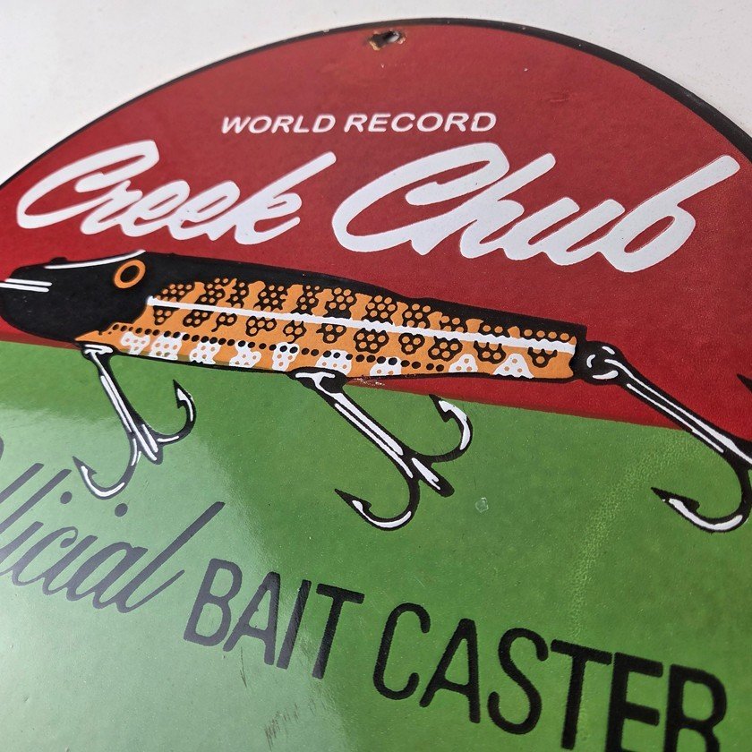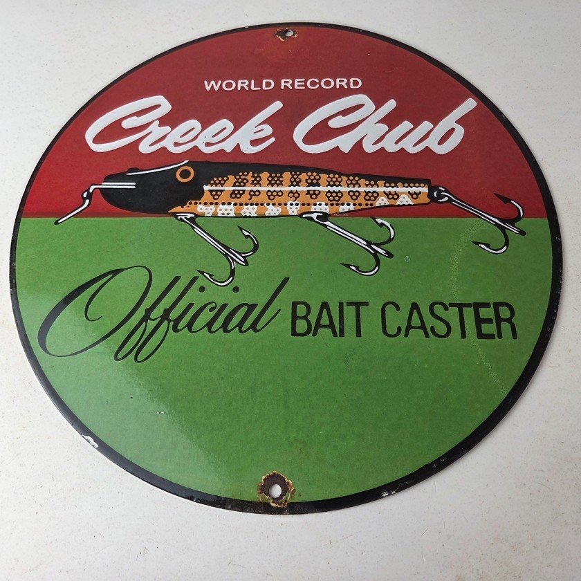 This vintage Creek Chub Bait Caster porcelain sign features a colorful design with the iconic Creek Chub Bait Caster lure. Perfect for any outdoor fishing enthusiast or collector of gas and oil memorabilia, this sign would make a great addition to a cabin or garage. The sign is made of porcelain and features red, green, orange, and black colors.