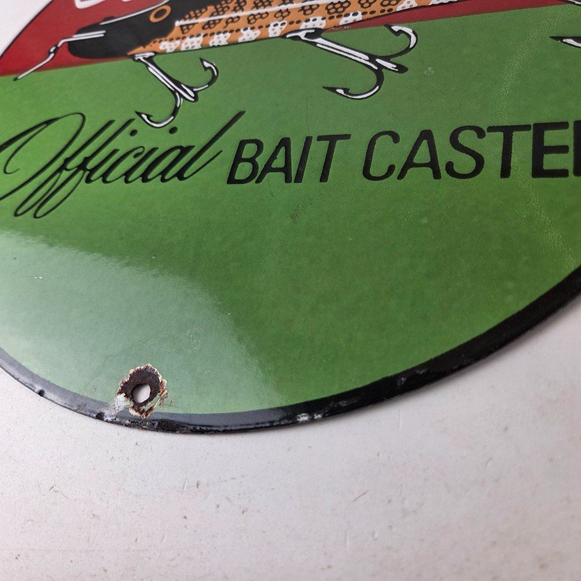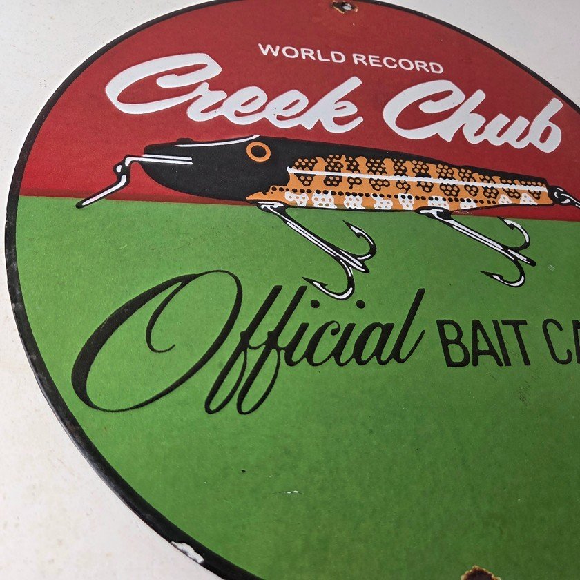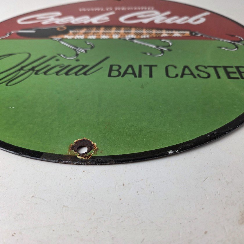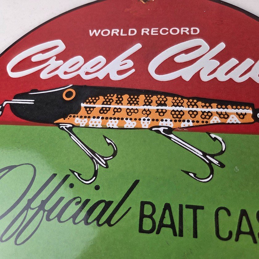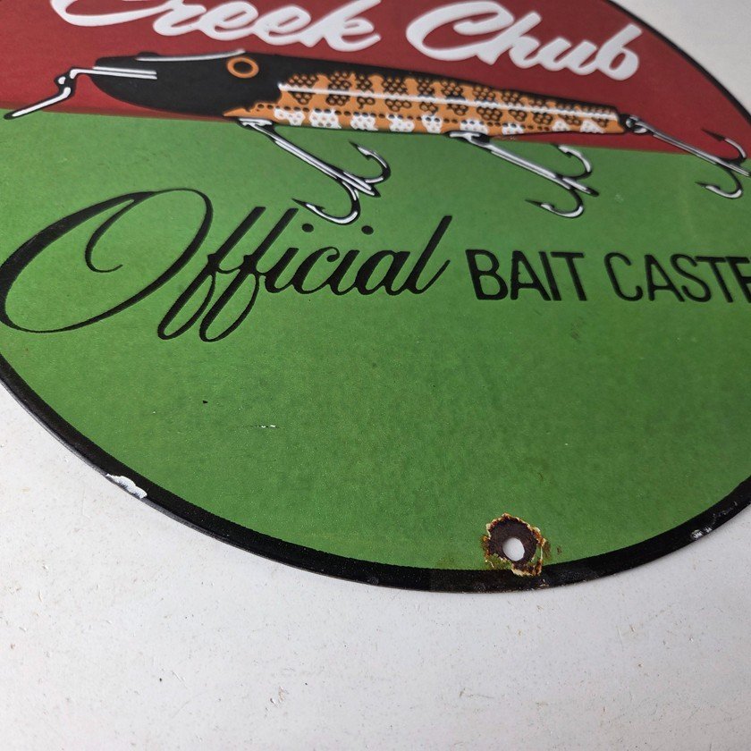 This vintage Creek Chub Bait Caster porcelain sign features a colorful design with the iconic Creek Chub Bait Caster lure. Perfect for any outdoor fishing enthusiast or collector of gas and oil memorabilia, this sign would make a great addition to a cabin or garage. The sign is made of porcelain and features red, green, orange, and black colors.