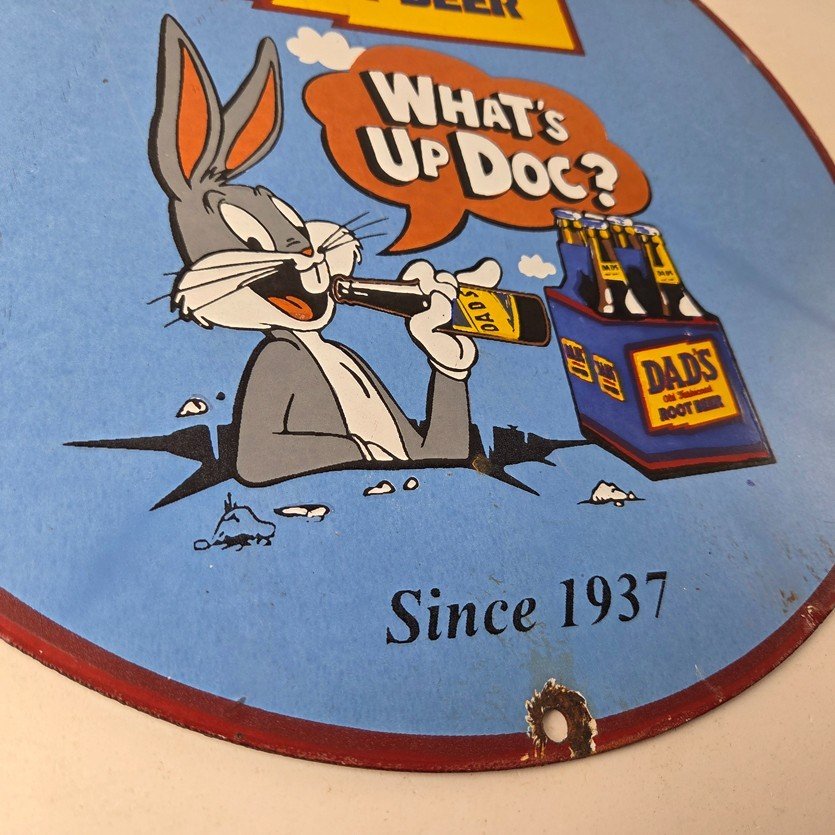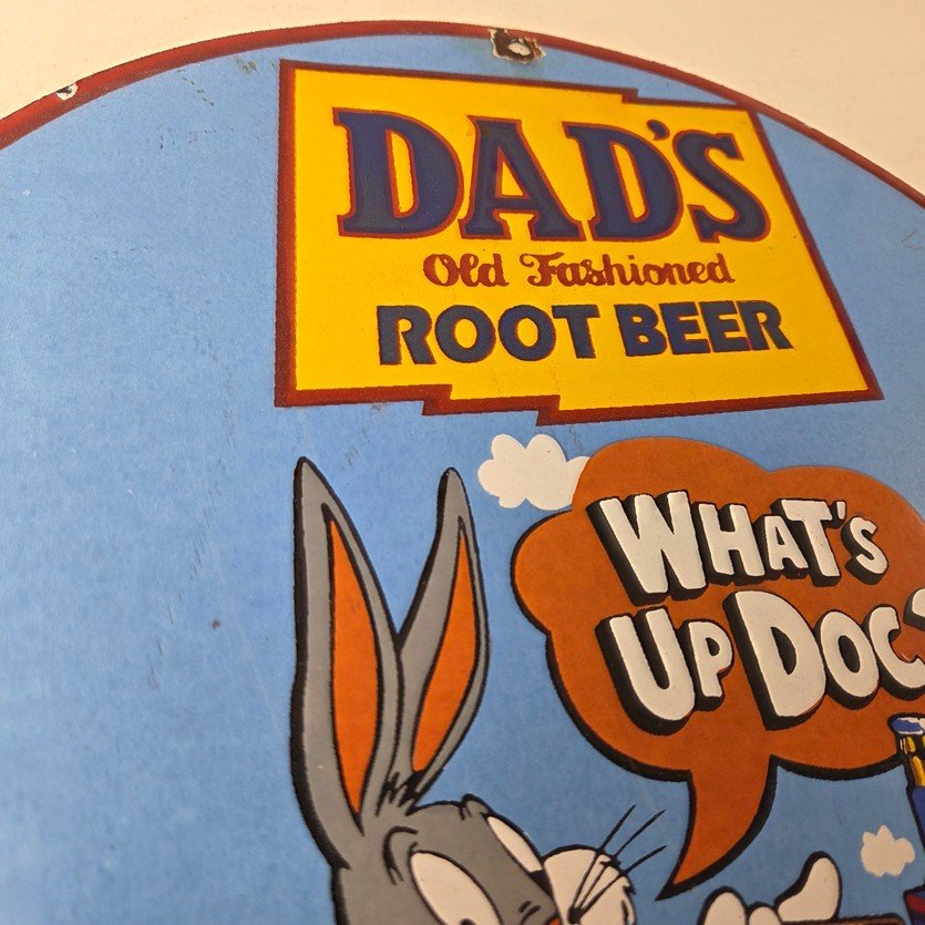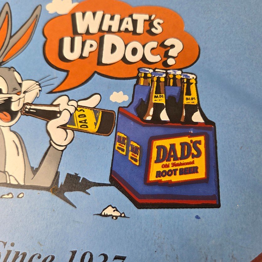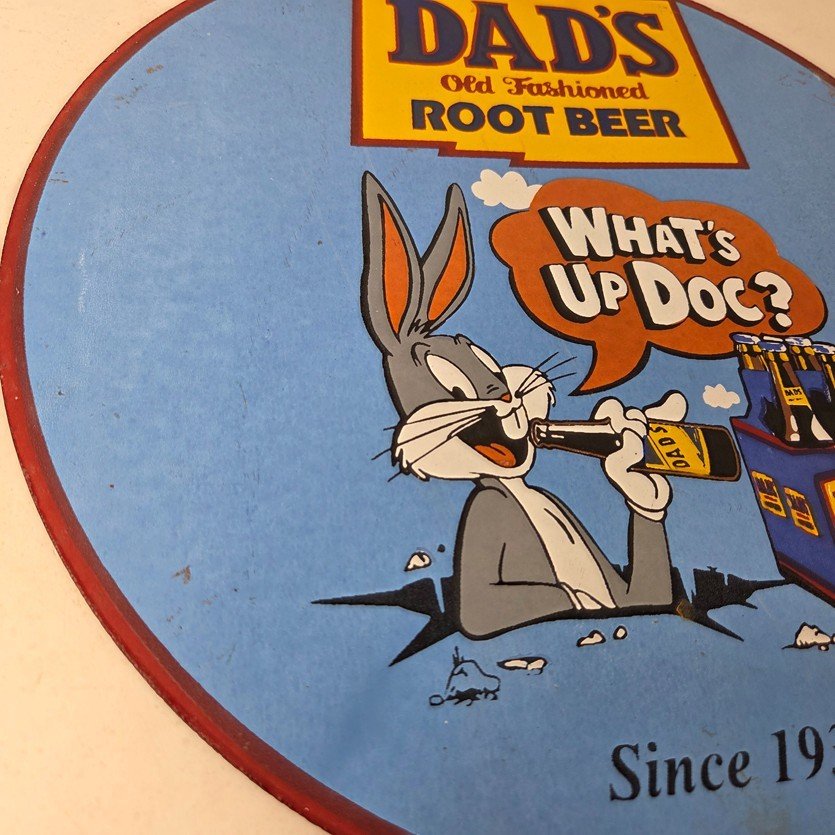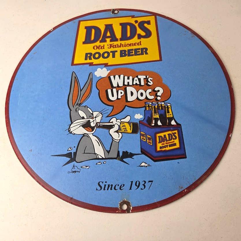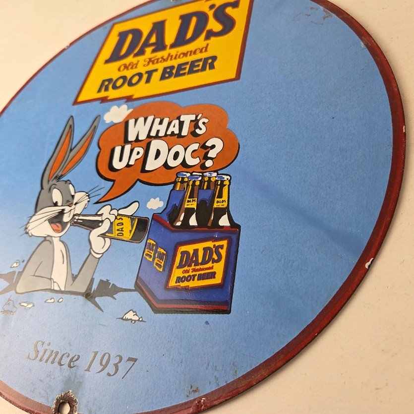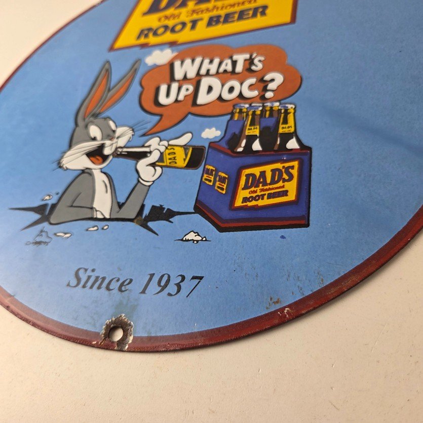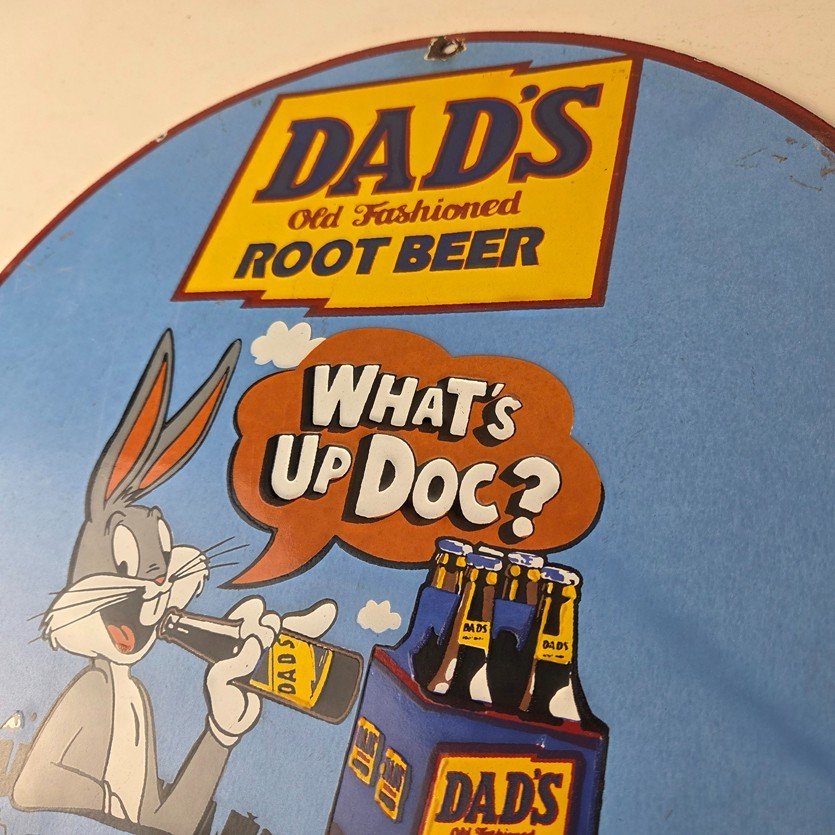 This vintage Dad’s Root Beer porcelain sign features the iconic rabbit with the Old Fashioned graphic soda theme. Add a vintage touch to your gas station or soda beverage collection with this Root Beer sign. Measuring 12″ in size, this sign has excellent colors and porcelain.