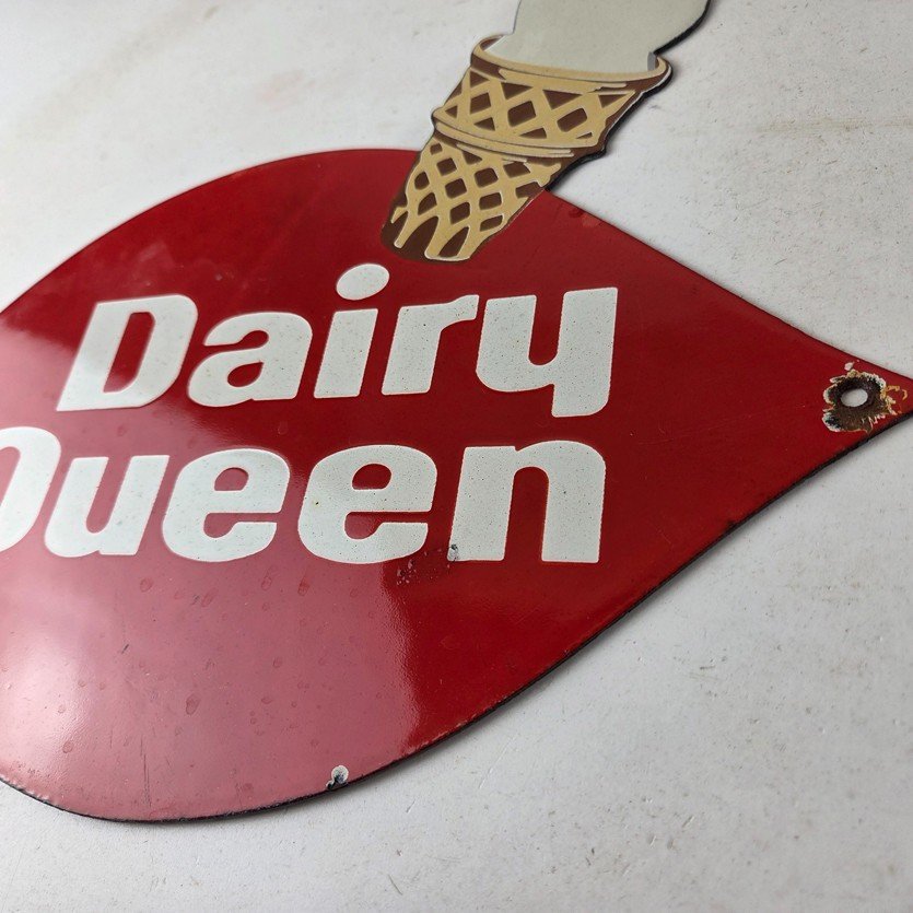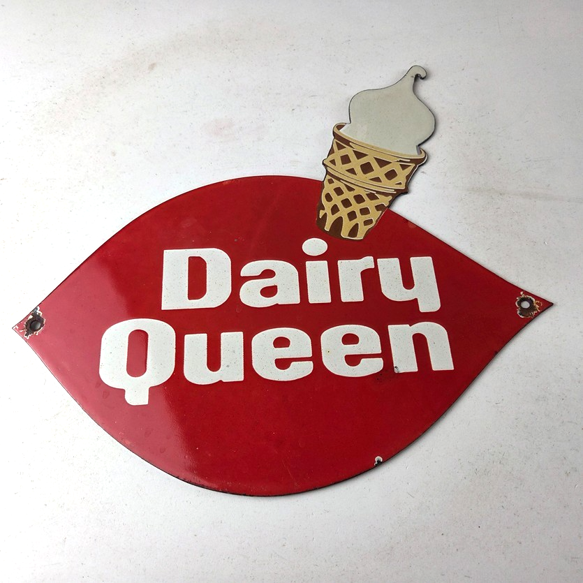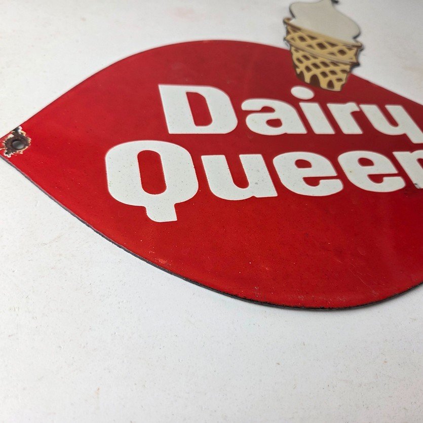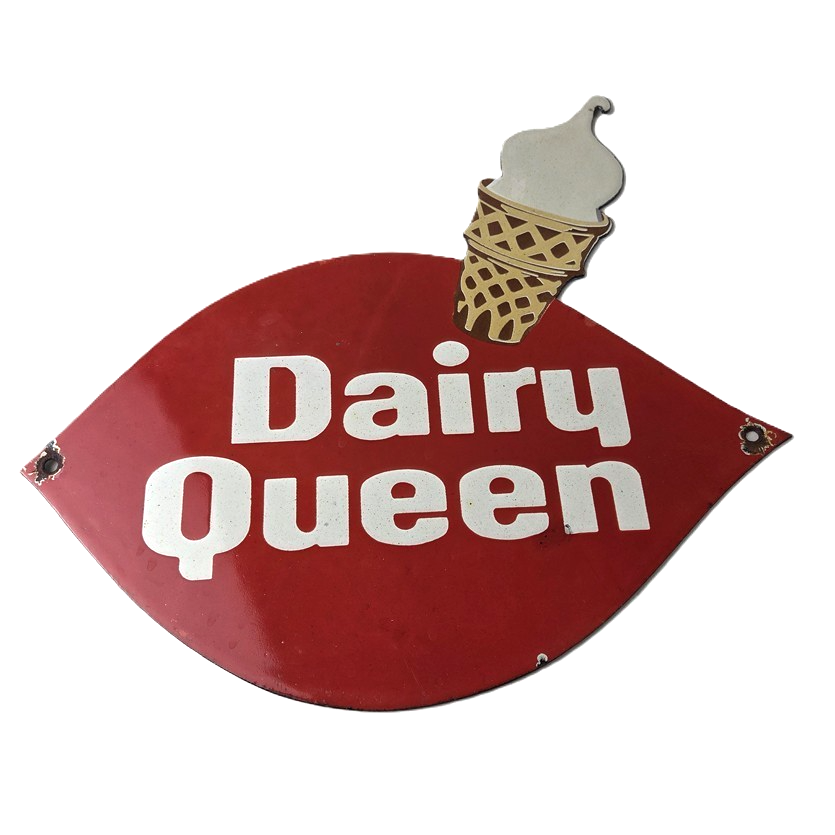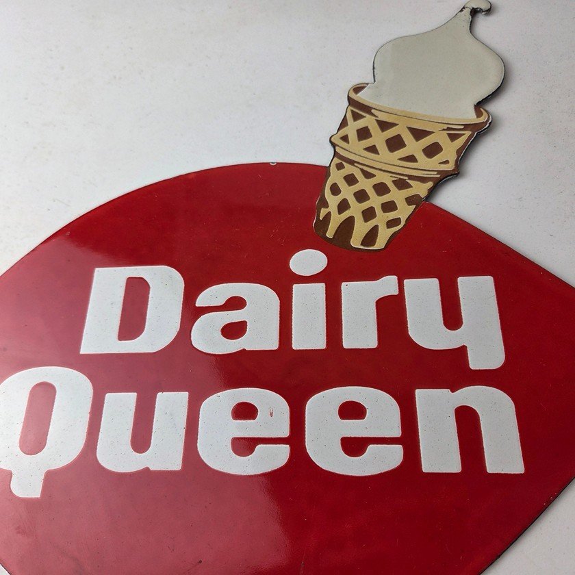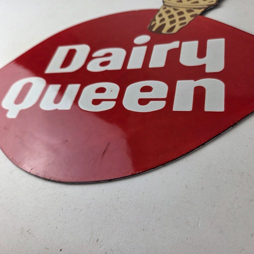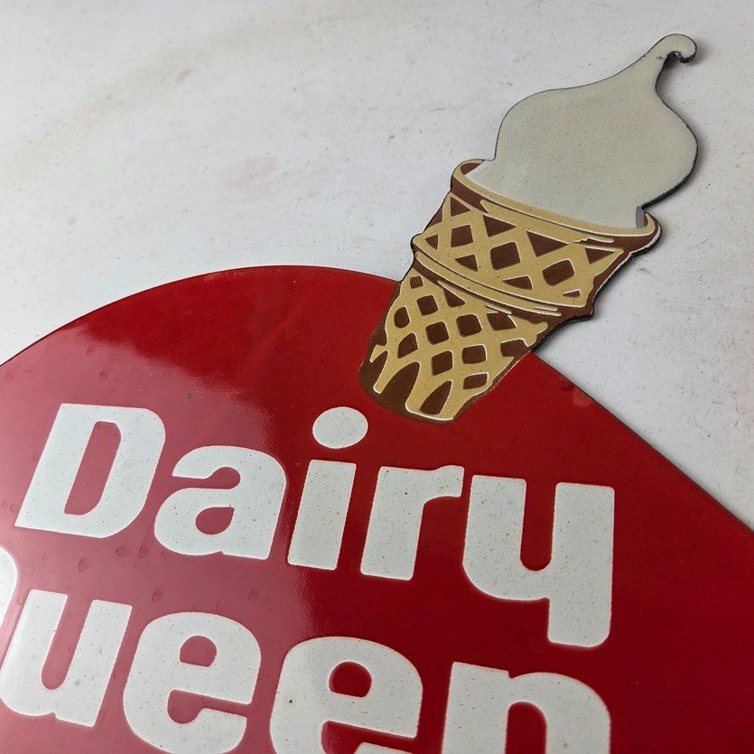 This vintage Dairy Queen porcelain sign features the iconic Dairy Queen lettering with the Ice Cream Cone at the top. This sign is perfect for any DQ fan or collector of memorabilia. This sign has high-quality porcelain on both sides and measures at 12″ x 10″.