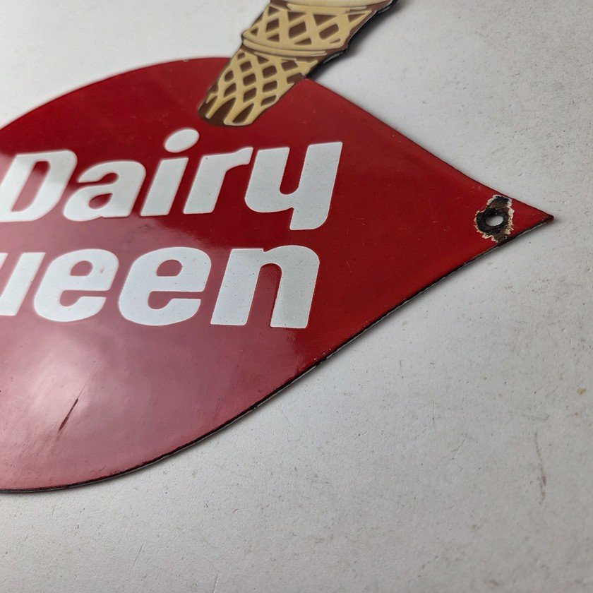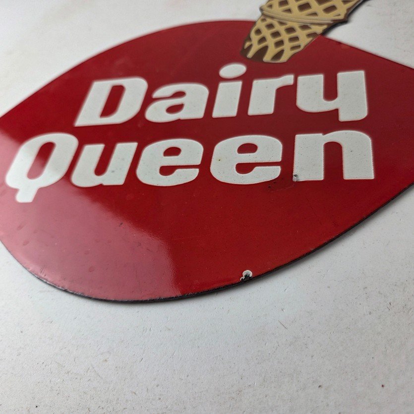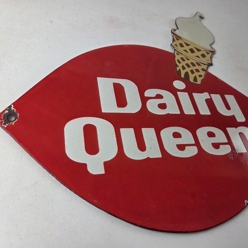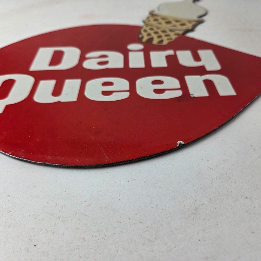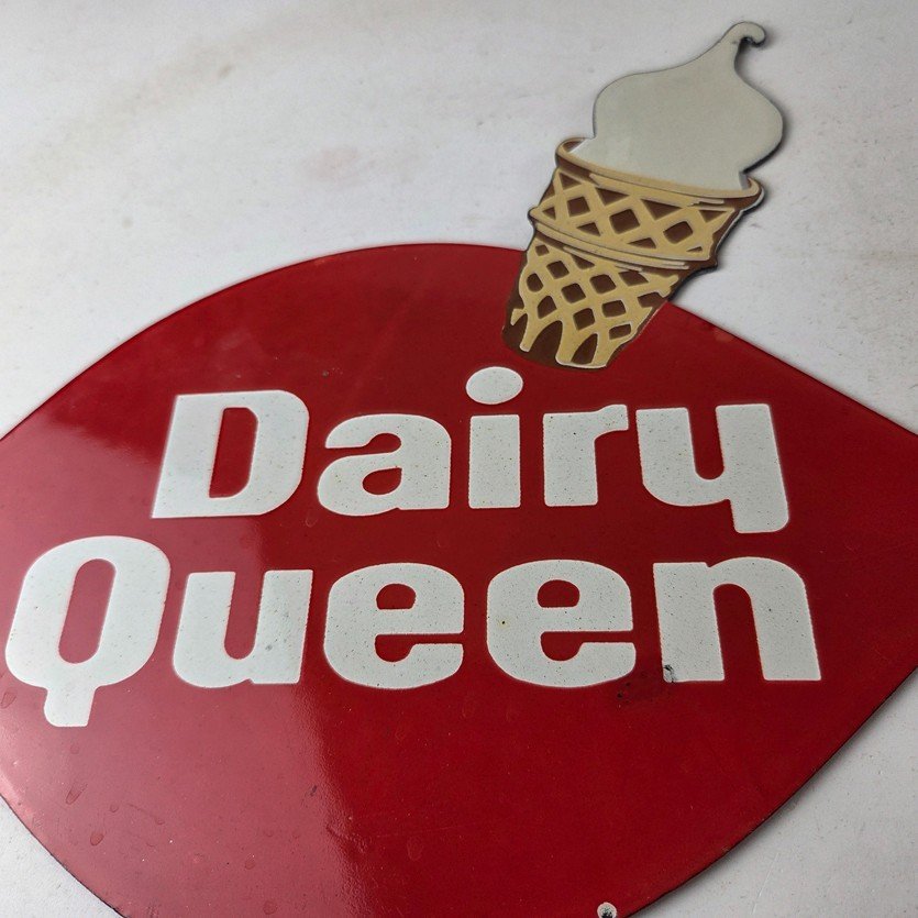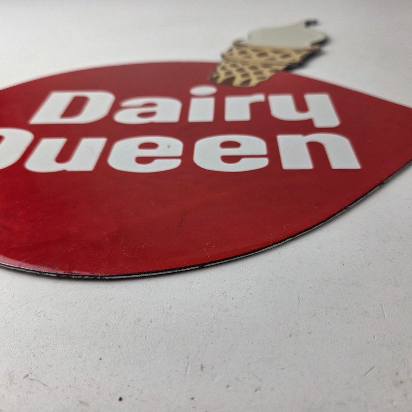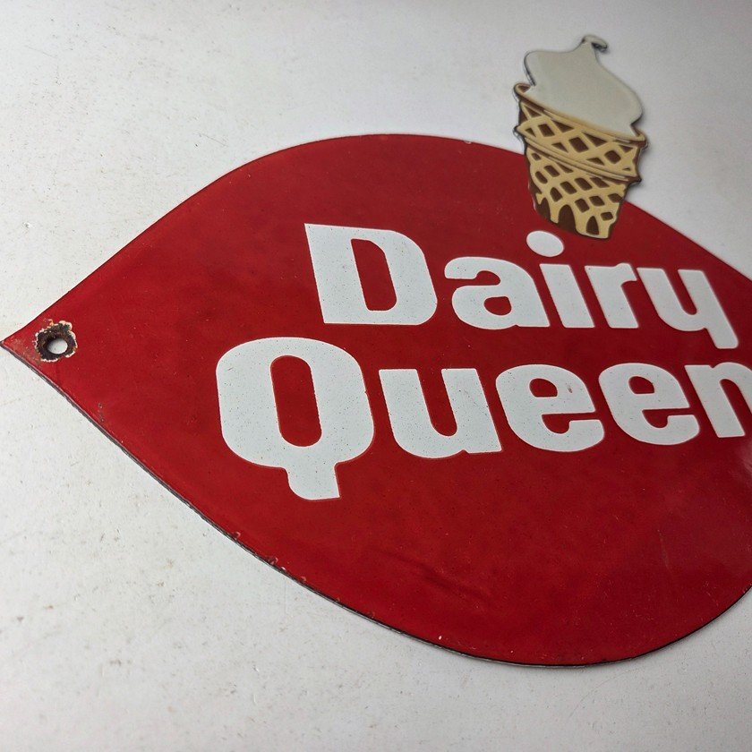 This vintage Dairy Queen porcelain sign features the iconic Dairy Queen lettering with the Ice Cream Cone at the top. This sign is perfect for any DQ fan or collector of memorabilia. This sign has high-quality porcelain on both sides and measures at 12″ x 10″.