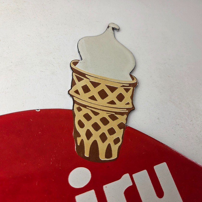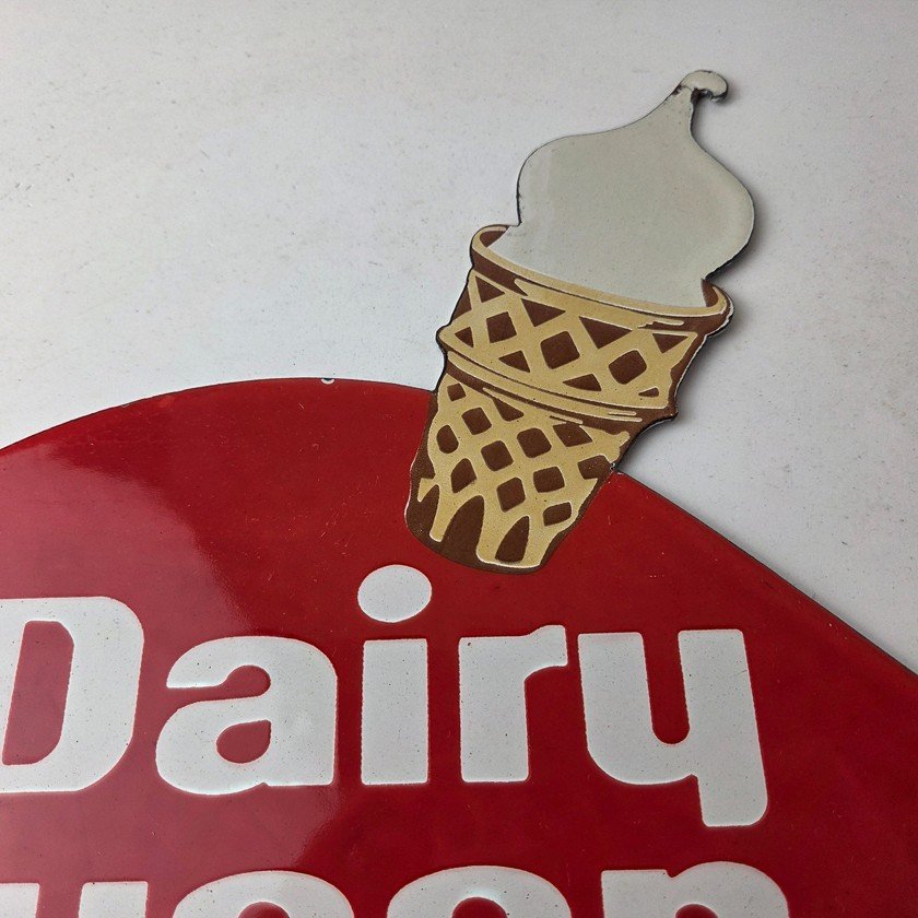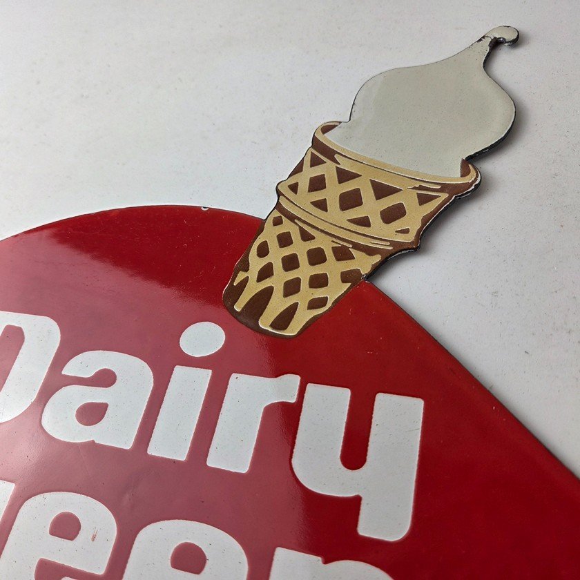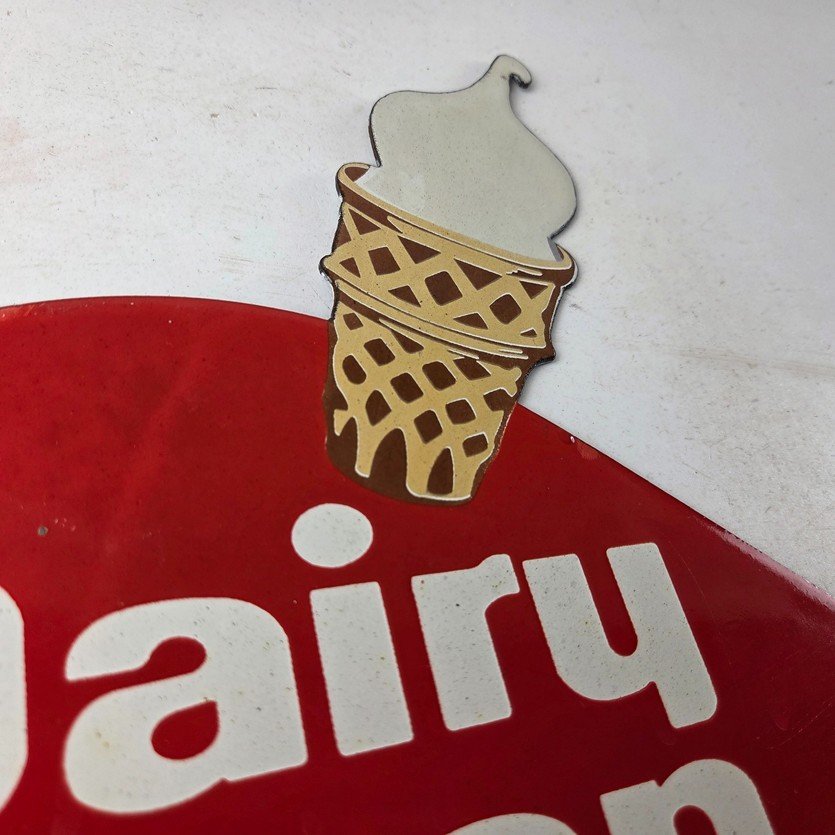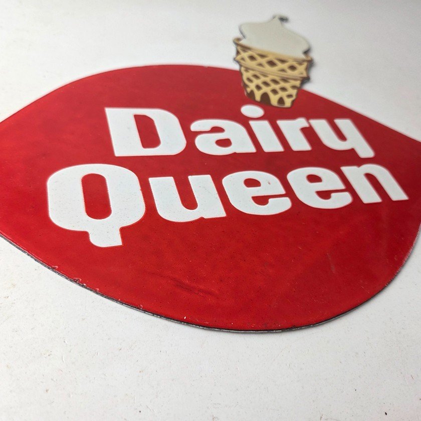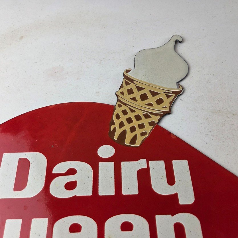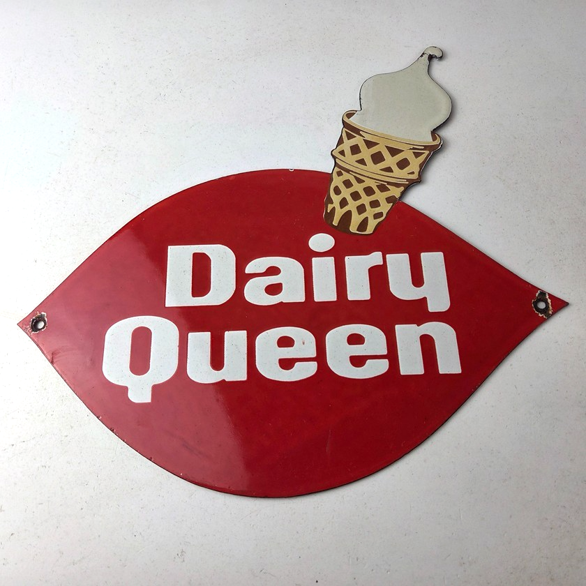 This vintage Dairy Queen porcelain sign features the iconic Dairy Queen lettering with the Ice Cream Cone at the top. This sign is perfect for any DQ fan or collector of memorabilia. This sign has high-quality porcelain on both sides and measures at 12″ x 10″.
