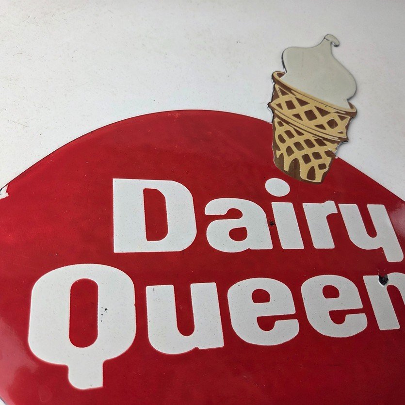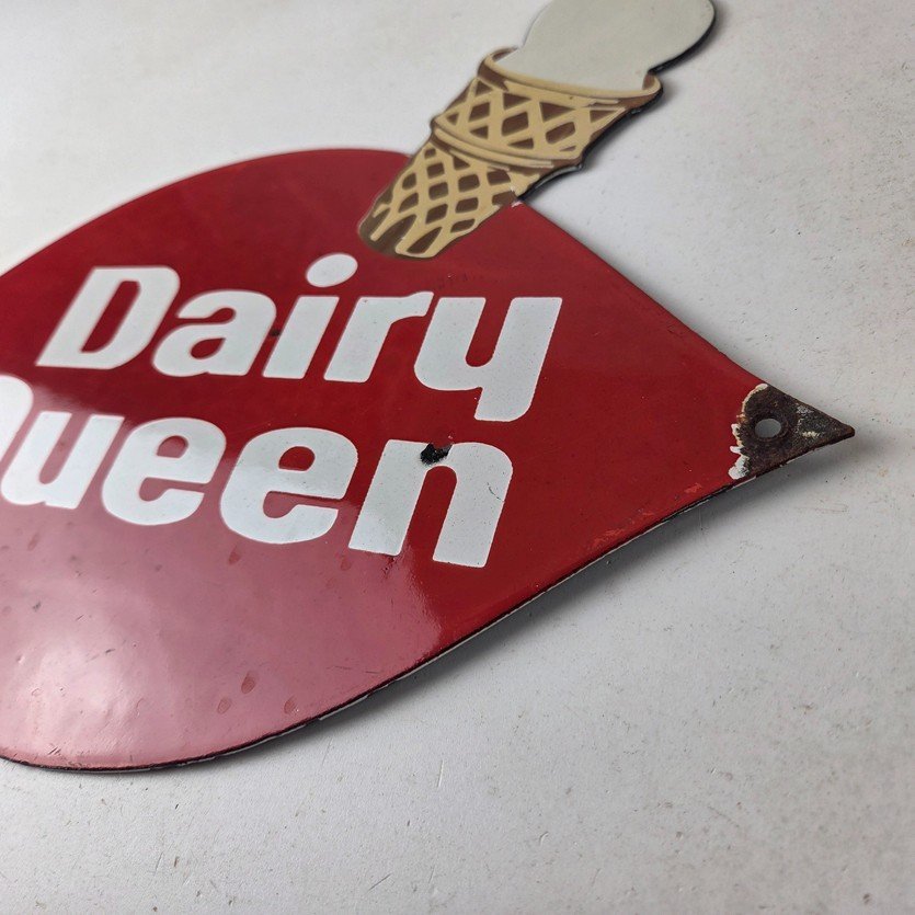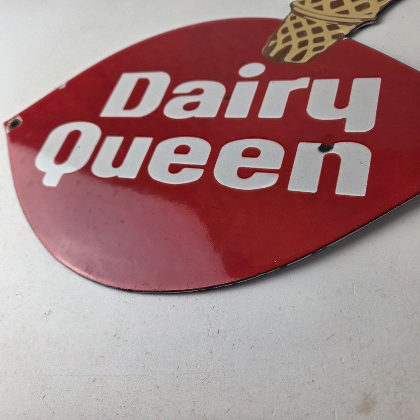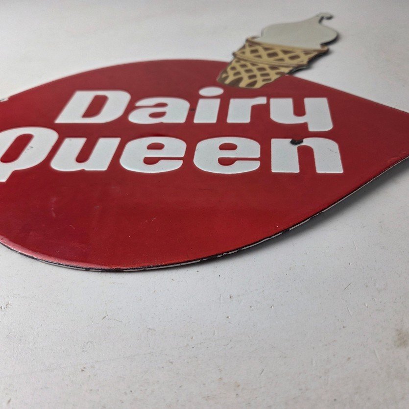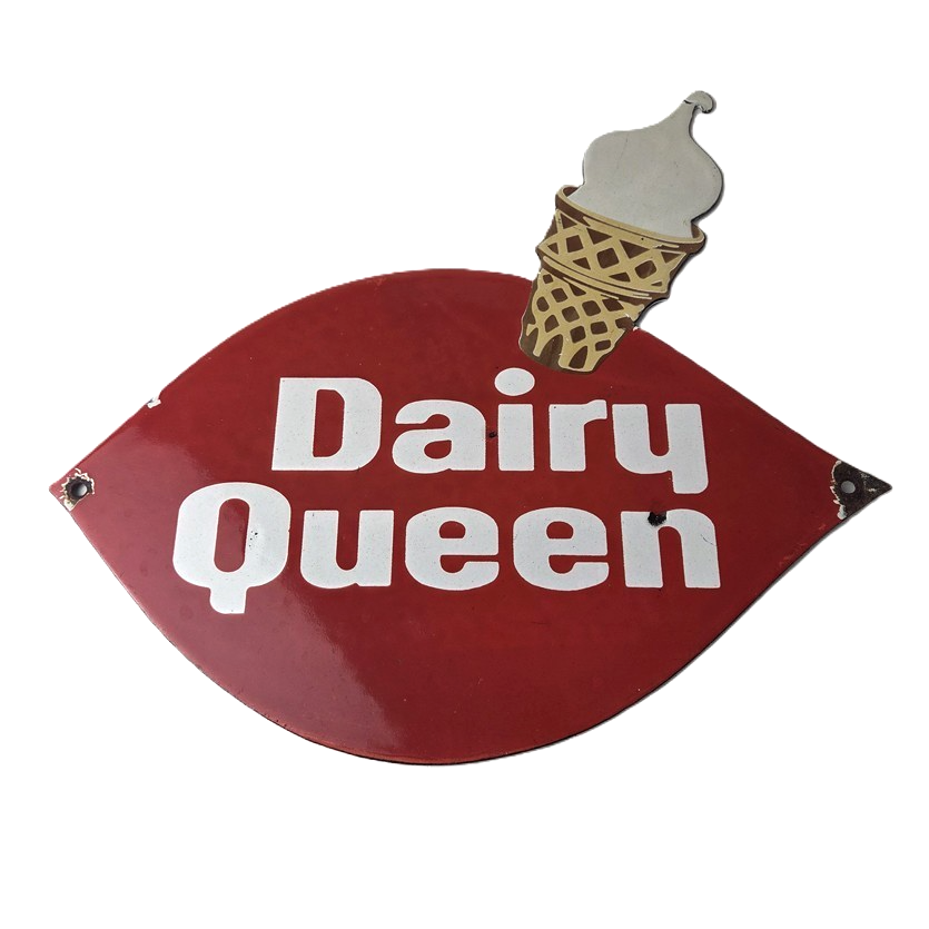 This vintage Dairy Queen porcelain sign features the iconic Dairy Queen lettering with the Ice Cream Cone at the top. This sign is perfect for any DQ fan or collector of memorabilia. This sign has high-quality porcelain on both sides and measures at 12″ x 10″.