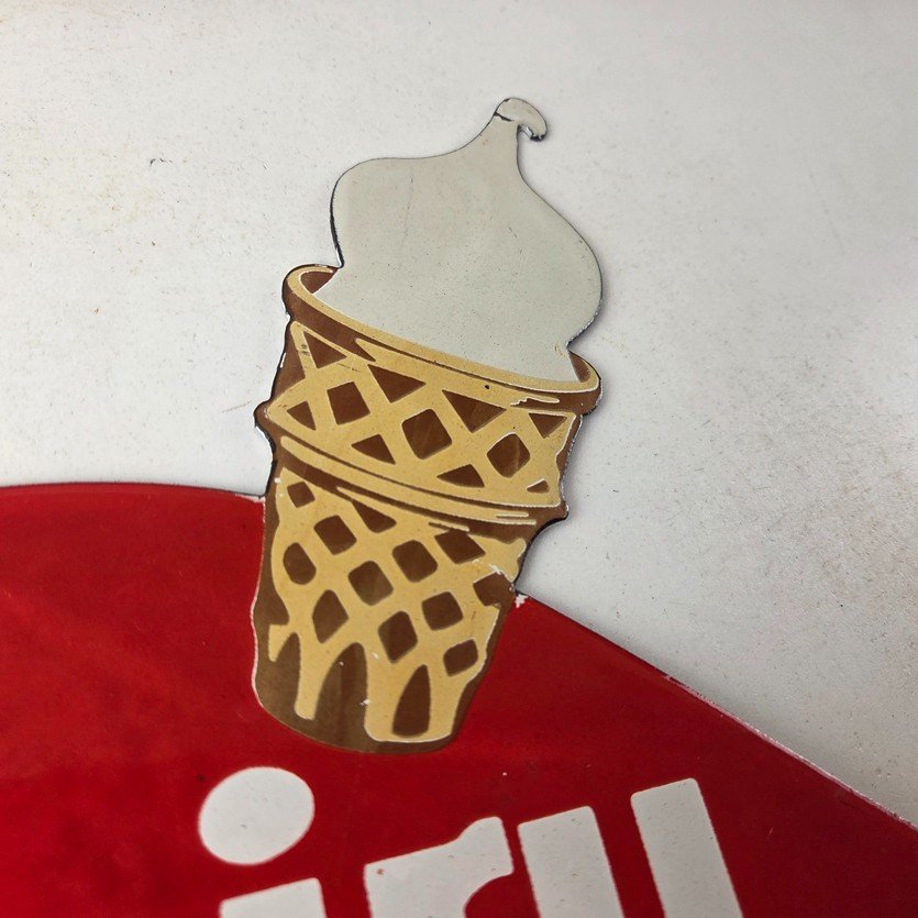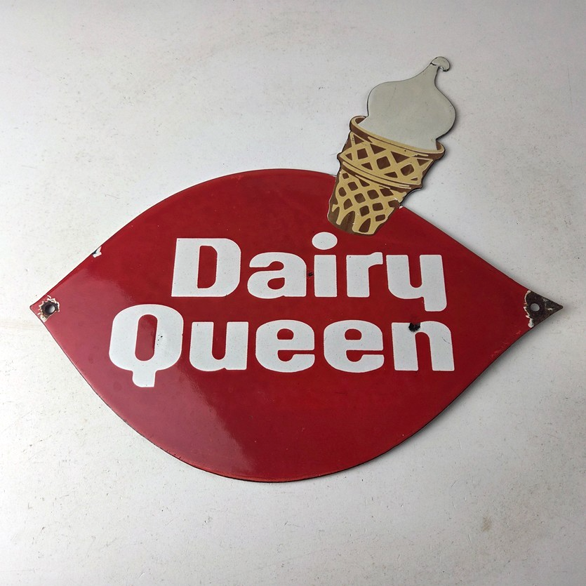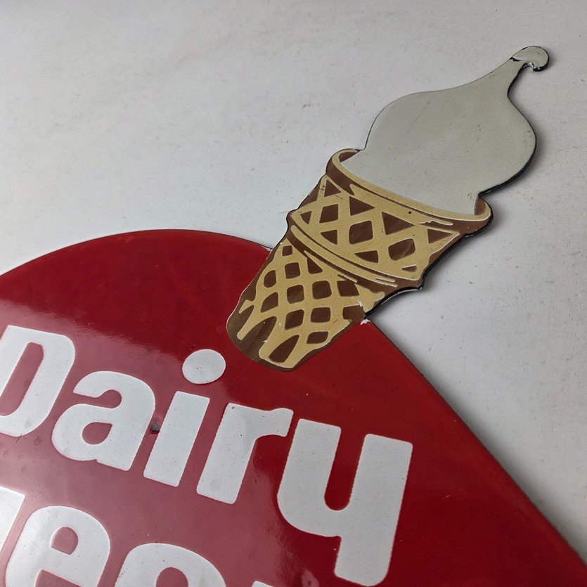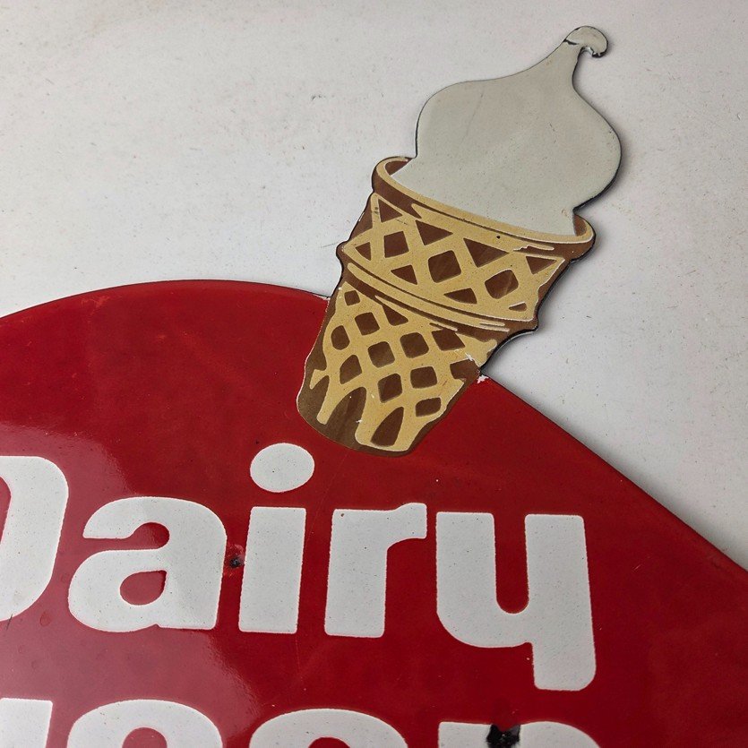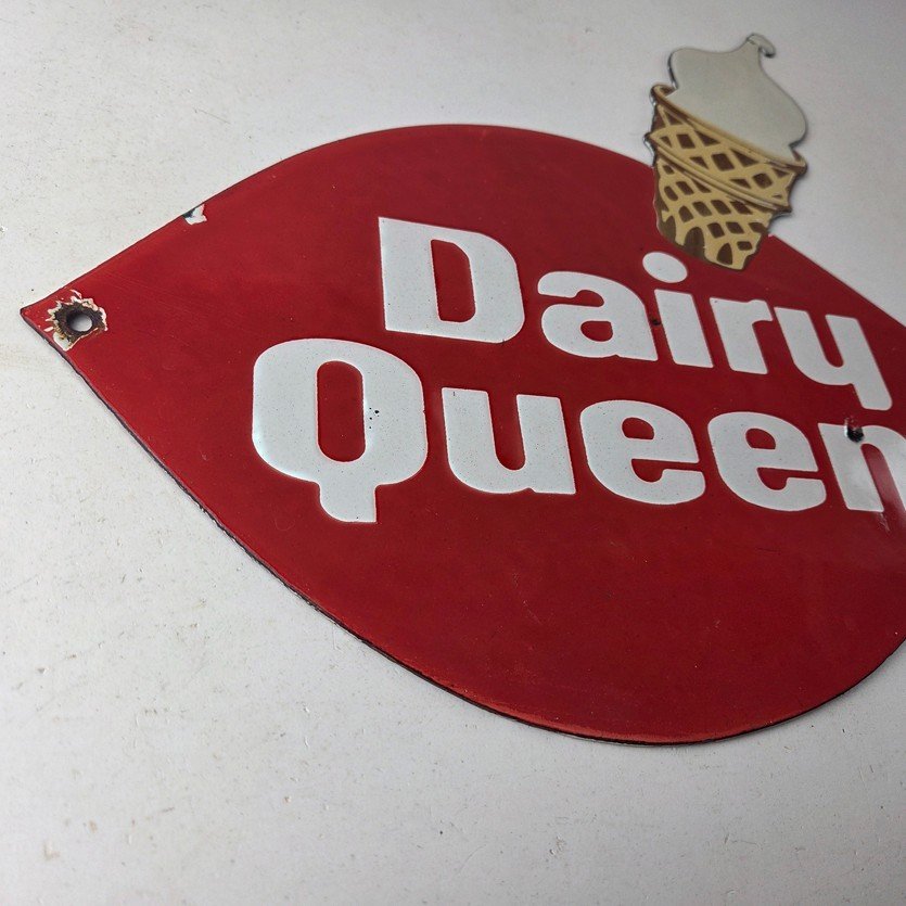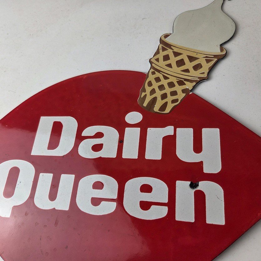 This vintage Dairy Queen porcelain sign features the iconic Dairy Queen lettering with the Ice Cream Cone at the top. This sign is perfect for any DQ fan or collector of memorabilia. This sign has high-quality porcelain on both sides and measures at 12″ x 10″.