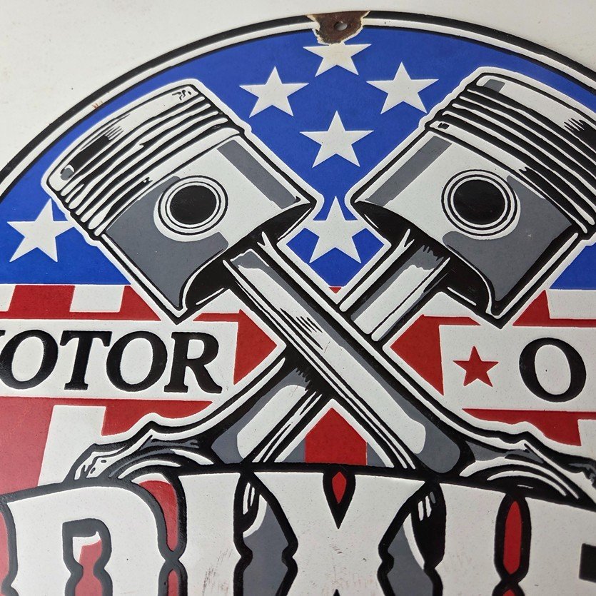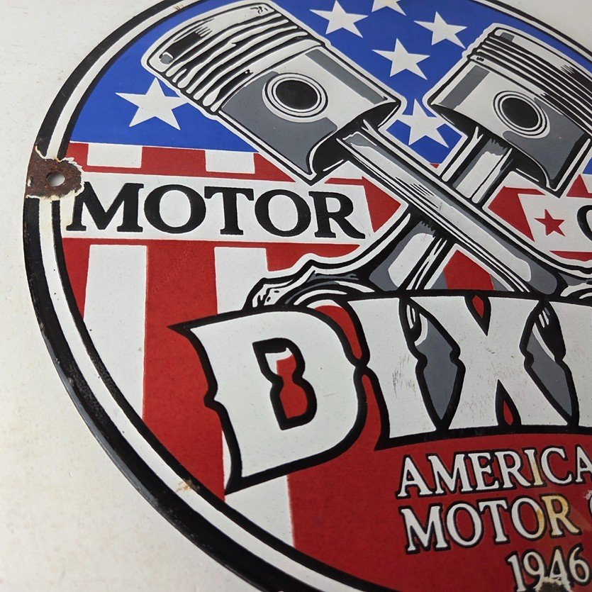 This vintage Dixie Gasoline porcelain sign features the American Flags and is the perfect addition to any gas and oil or advertising collectibles collection. This sign has excellent colors and porcelain.
