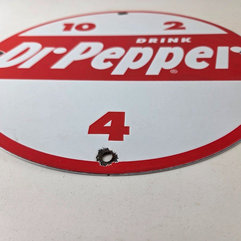 Add a vintage touch to your bar, man cave or soda collection with this stunning porcelain sign featuring the iconic Dr Pepper 10 2 4 advertising. The red color and gas & oil theme make it a perfect addition to any vintage advertisement collection.