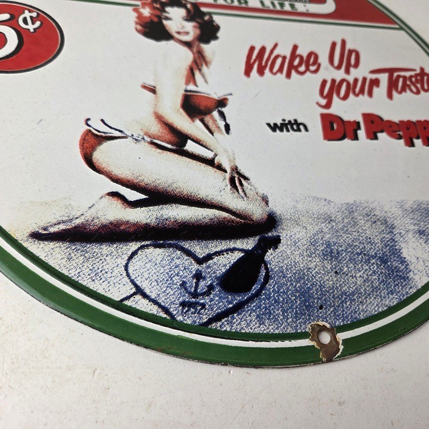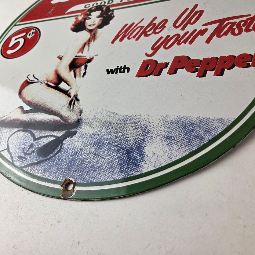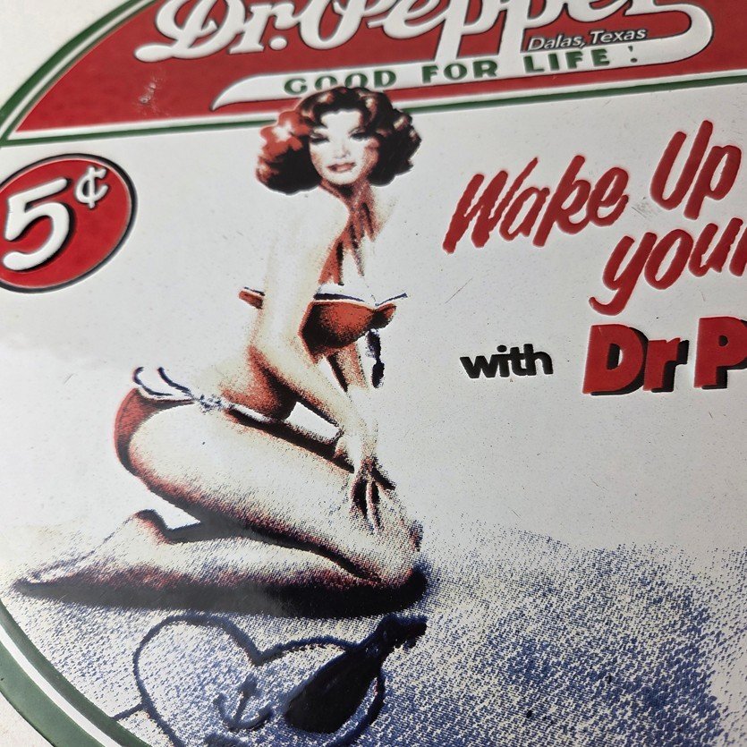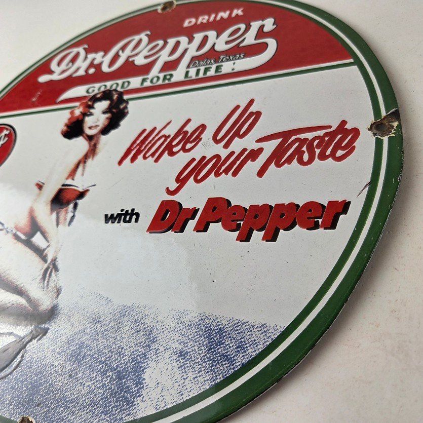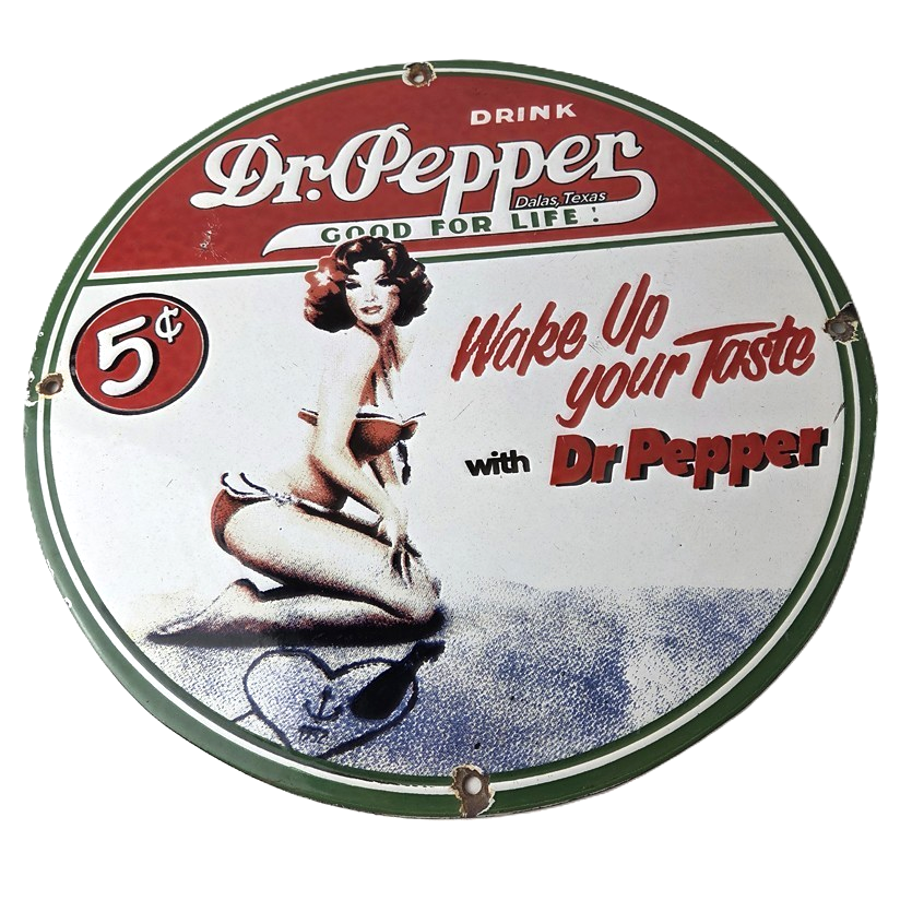 Add a vintage touch to your bar, man cave or soda collection with this stunning porcelain sign featuring the iconic Dr Pepper Pin Up Girl advertising. The excellent color and gas & oil theme make it a perfect addition to any vintage advertisement collection.