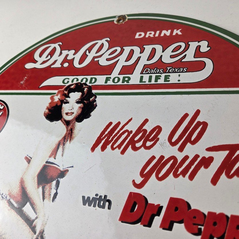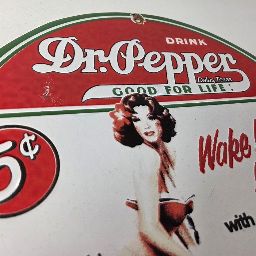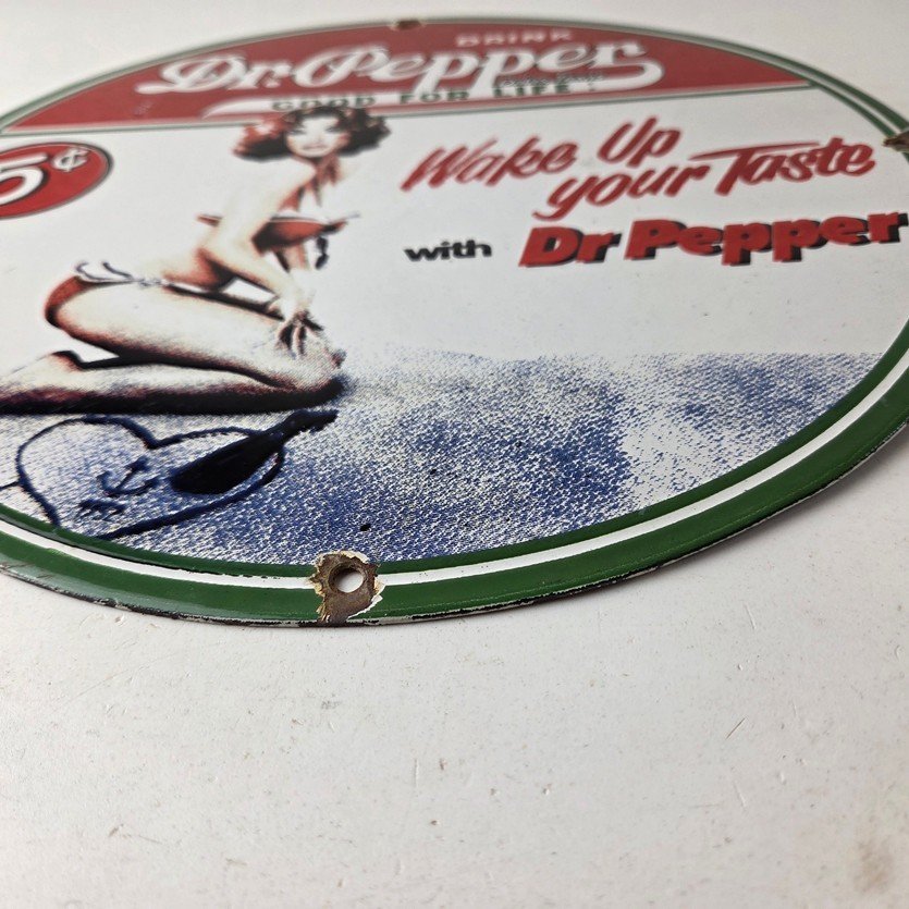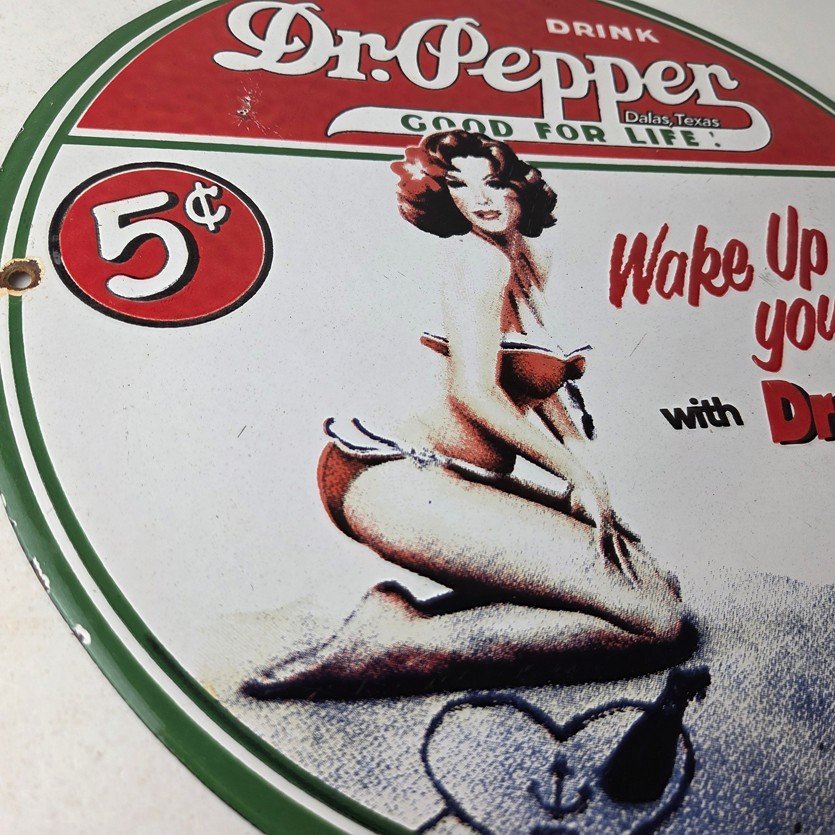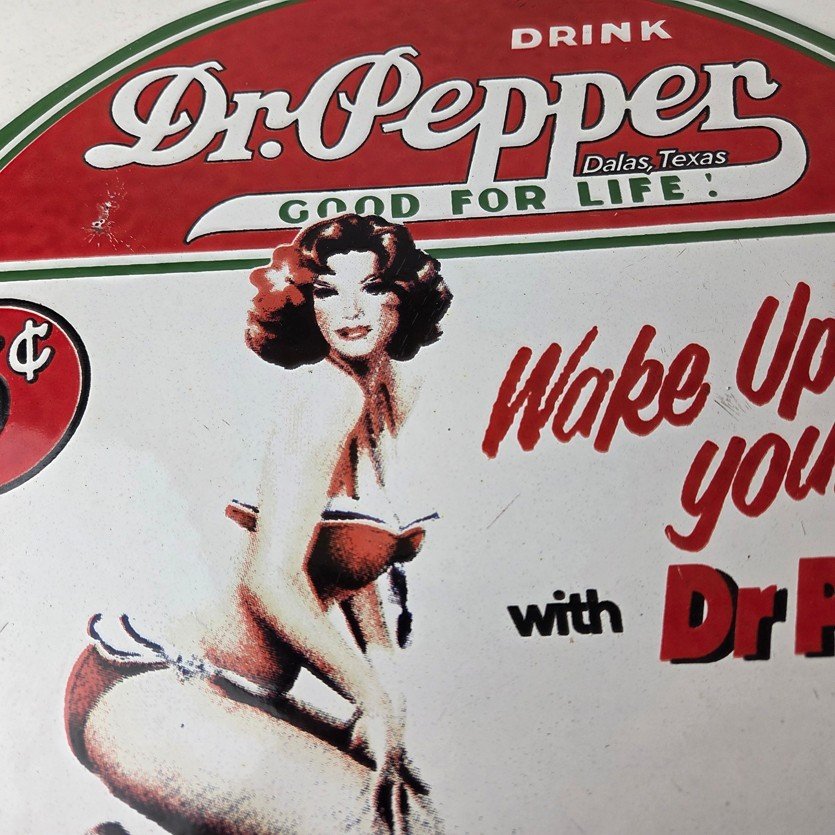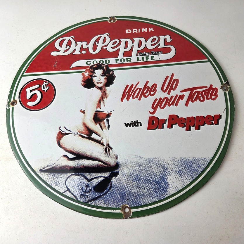 Add a vintage touch to your bar, man cave or soda collection with this stunning porcelain sign featuring the iconic Dr Pepper Pin Up Girl advertising. The excellent color and gas & oil theme make it a perfect addition to any vintage advertisement collection.