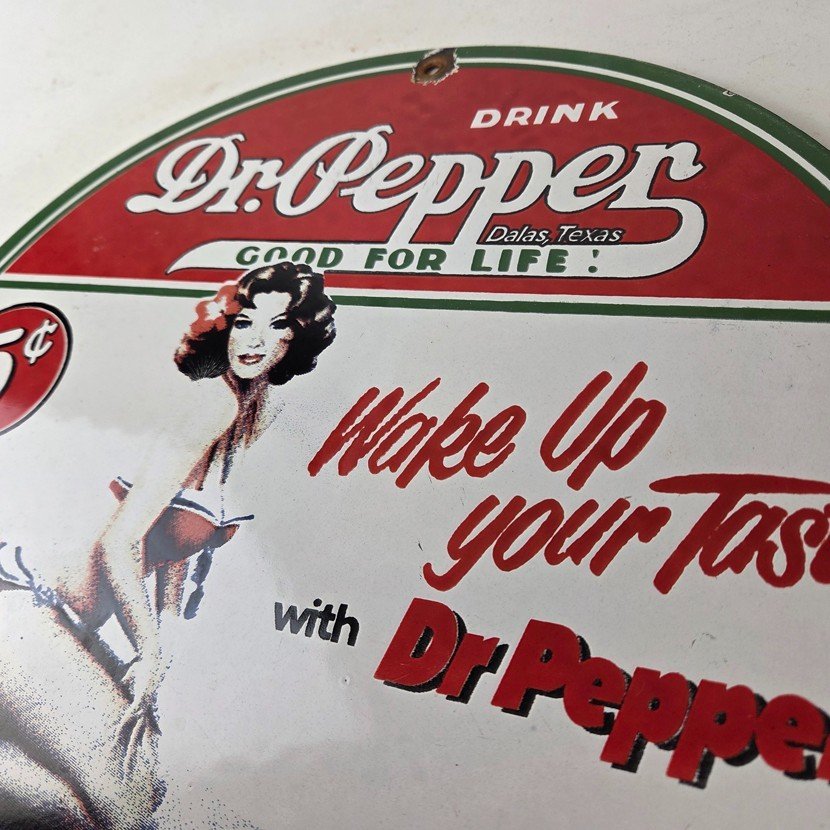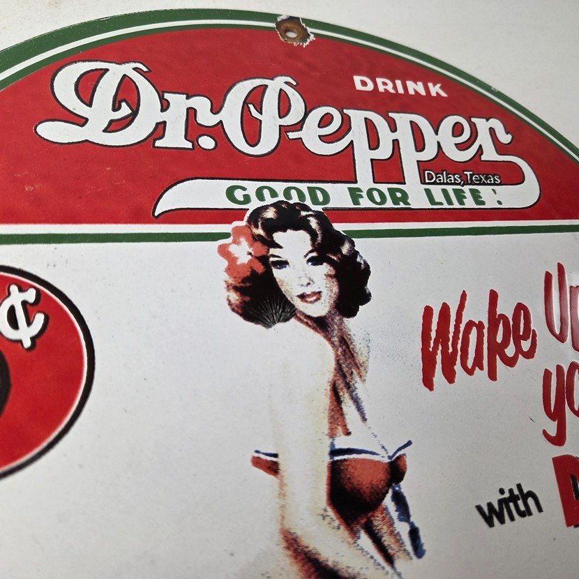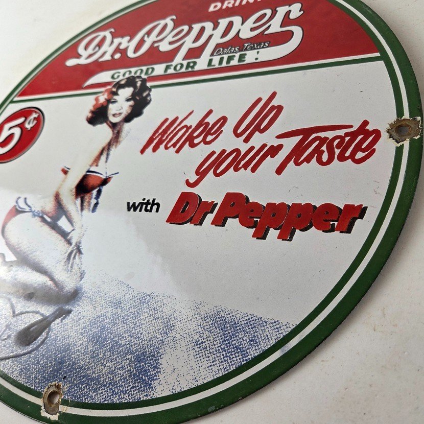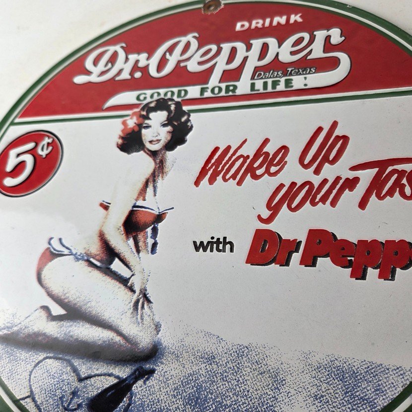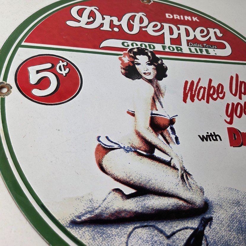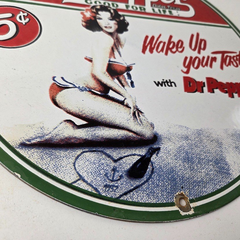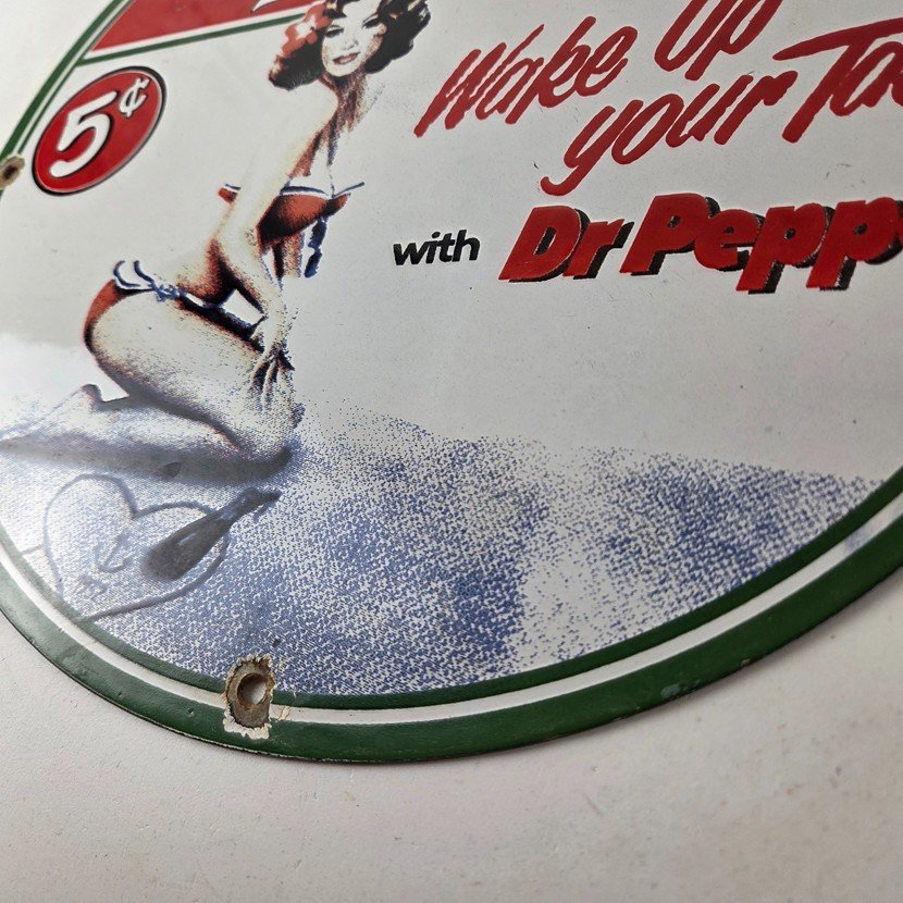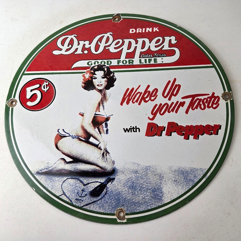 Add a vintage touch to your bar, man cave or soda collection with this stunning porcelain sign featuring the iconic Dr Pepper Pin Up Girl advertising. The excellent color and gas & oil theme make it a perfect addition to any vintage advertisement collection.