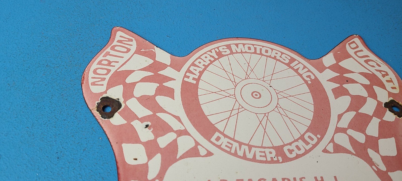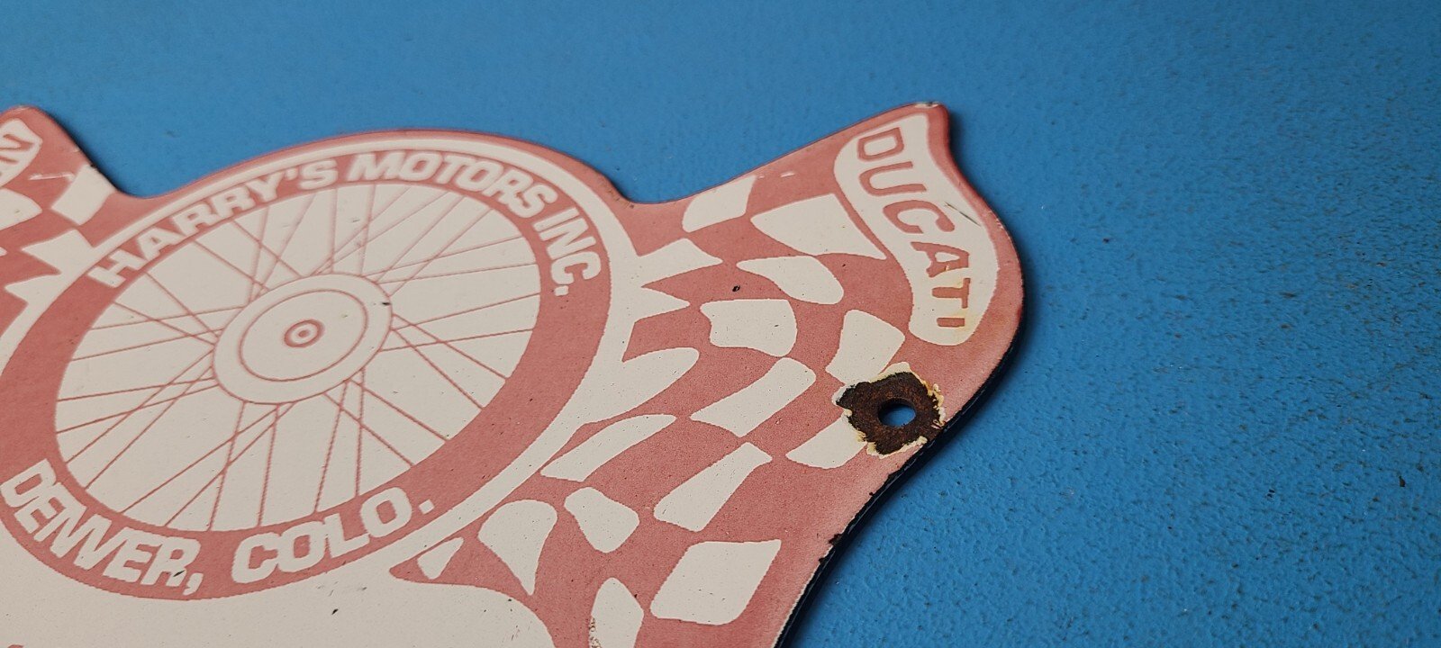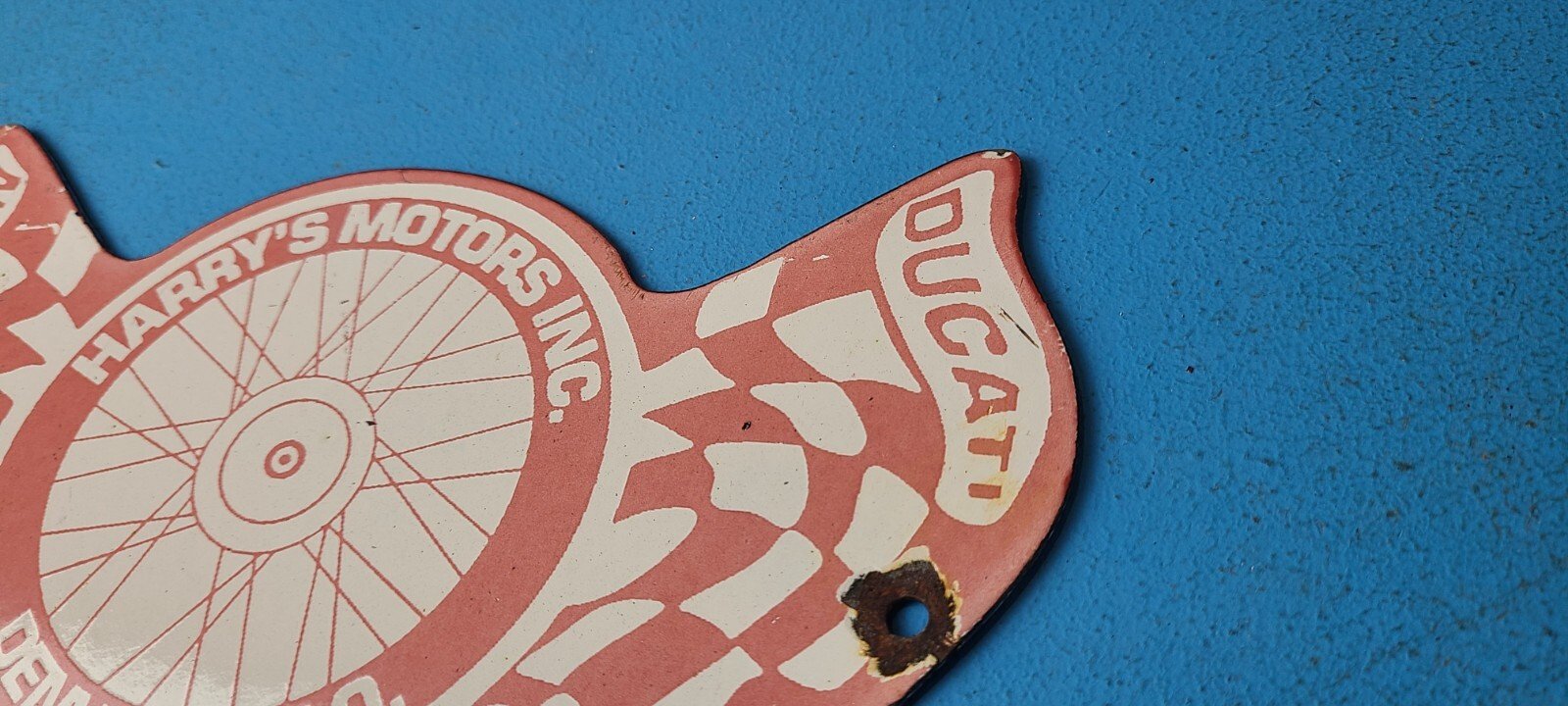 For sale is a vintage Ducati Motorcycles porcelain Harry’s Motors Inc., gas service station & pump plate sign. Please view the pictures as they are part of the description (a picture is worth a thousand words)! I try my best to take pictures of all the angles of this sign. This sign has excellent colors and gloss. Sign measures 9″ x 6″. Check out my other auctions, and feel free to ask questions. Perfect for gas collectors, automobile enthusiasts, sign collection, man cave, restaurant, bar, garage, displays anywhere. See my other gas & motor oil, aviation, automotive, soda & beverage signs. $10 for shipping anywhere in the U.S. with Priority Mail. Shipping will be $5.00 for each additional item! Thank you!