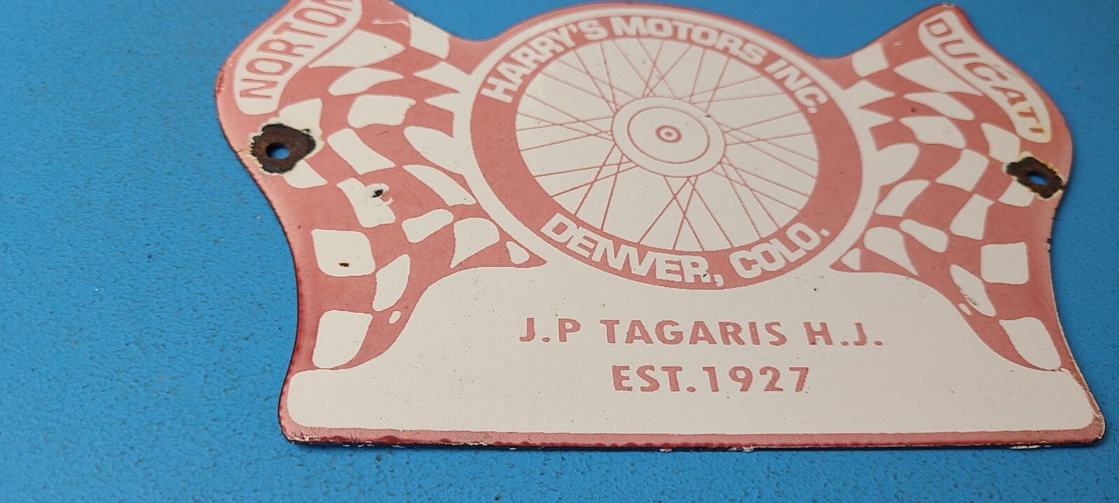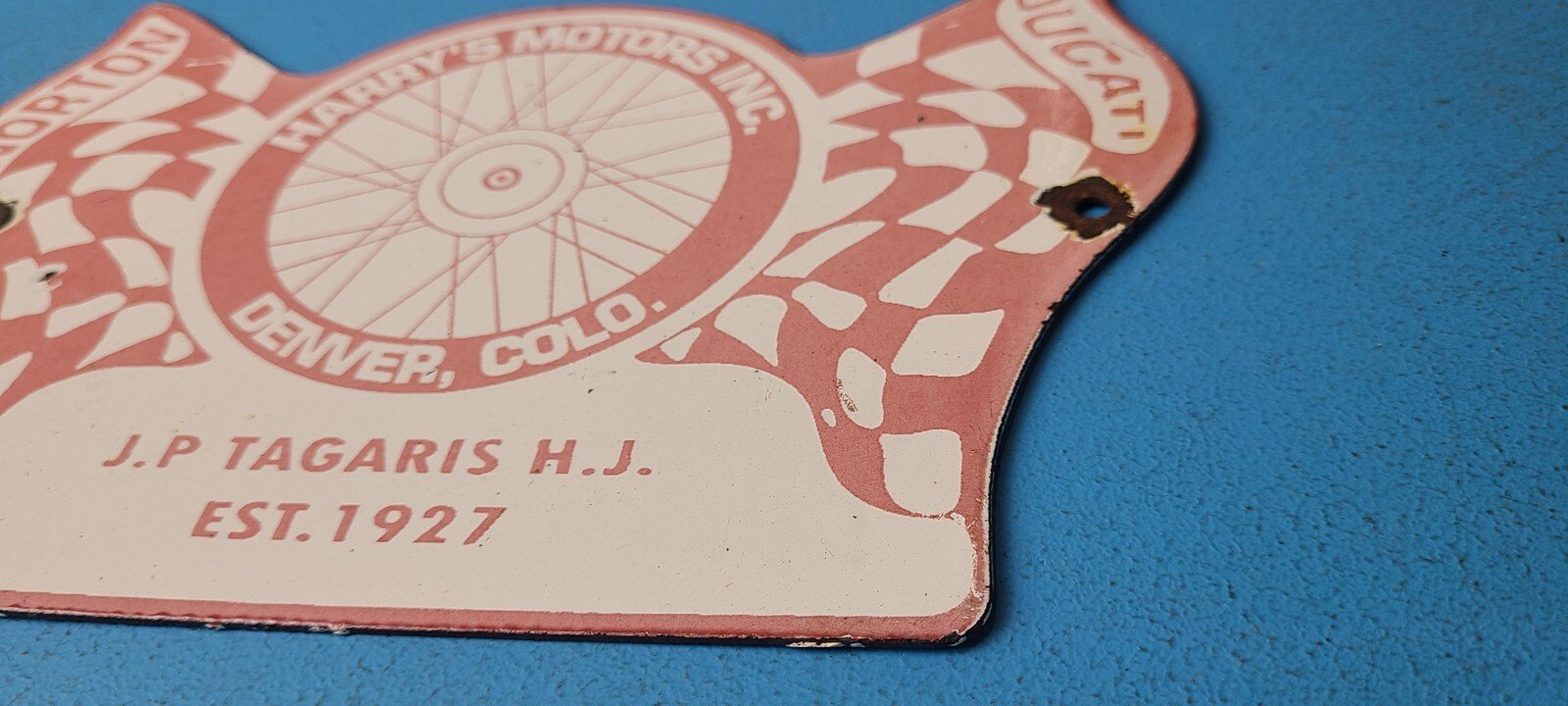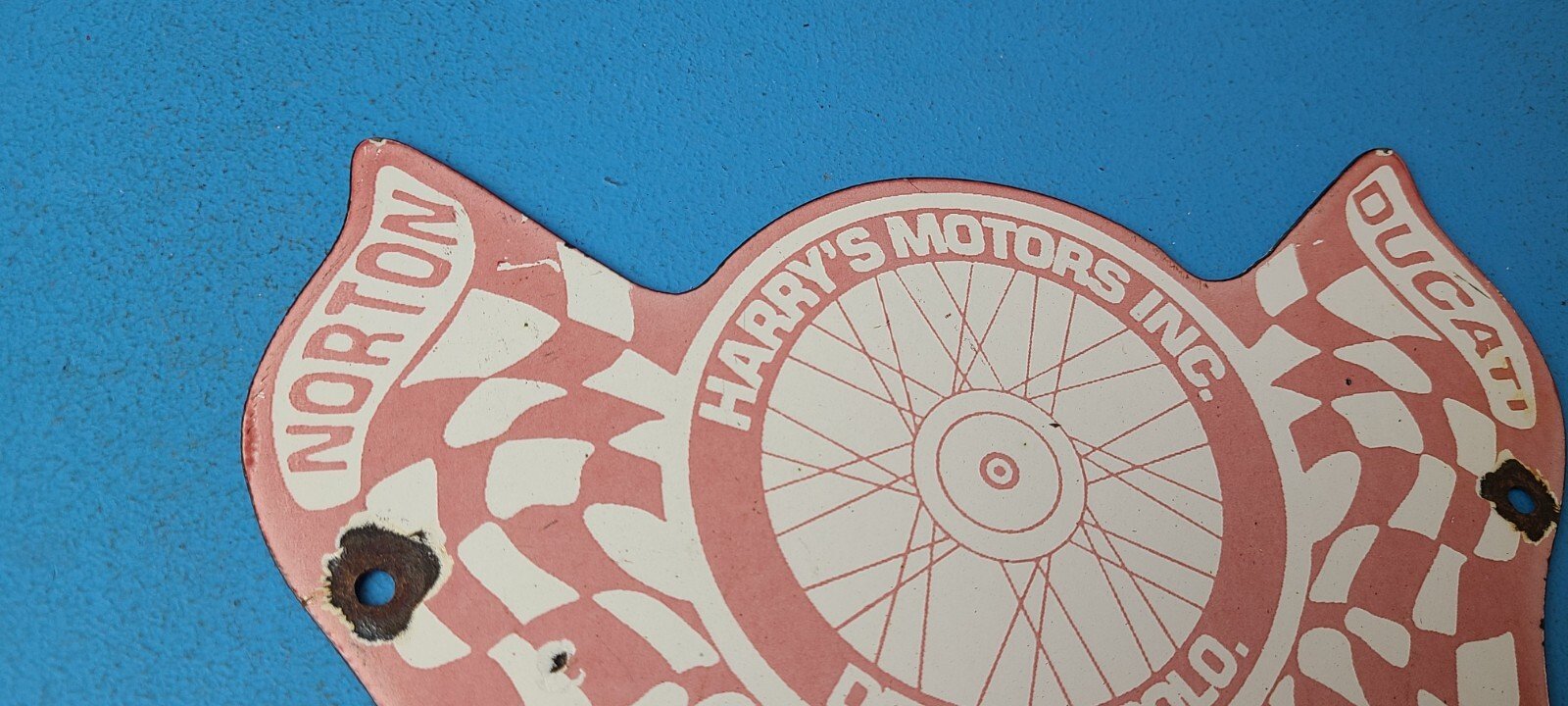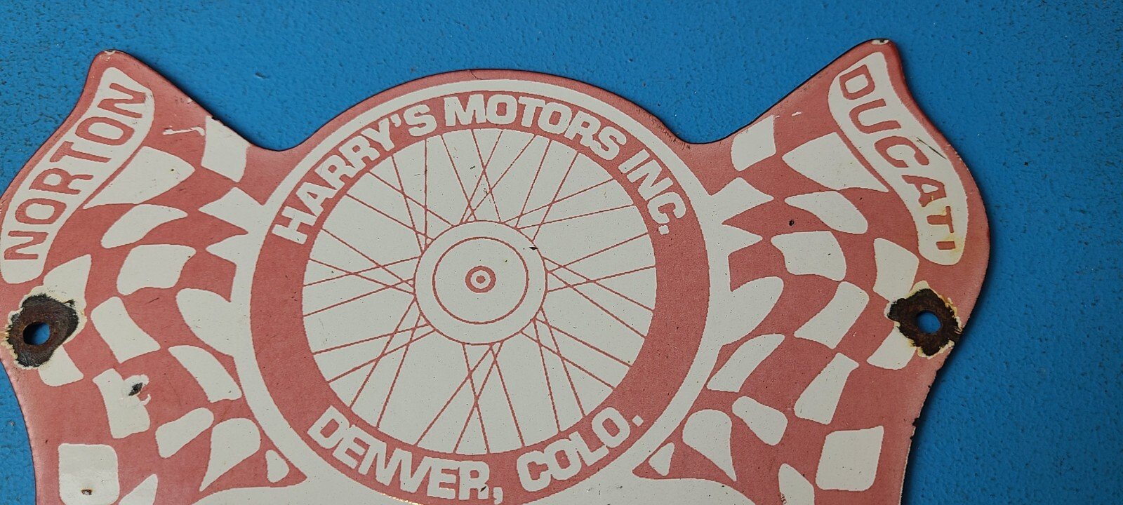 For sale is a vintage Ducati Motorcycles porcelain Harry’s Motors Inc., gas service station & pump plate sign. Please view the pictures as they are part of the description (a picture is worth a thousand words)! I try my best to take pictures of all the angles of this sign. This sign has excellent colors and gloss. Sign measures 9″ x 6″. Check out my other auctions, and feel free to ask questions. Perfect for gas collectors, automobile enthusiasts, sign collection, man cave, restaurant, bar, garage, displays anywhere. See my other gas & motor oil, aviation, automotive, soda & beverage signs. $10 for shipping anywhere in the U.S. with Priority Mail. Shipping will be $5.00 for each additional item! Thank you!