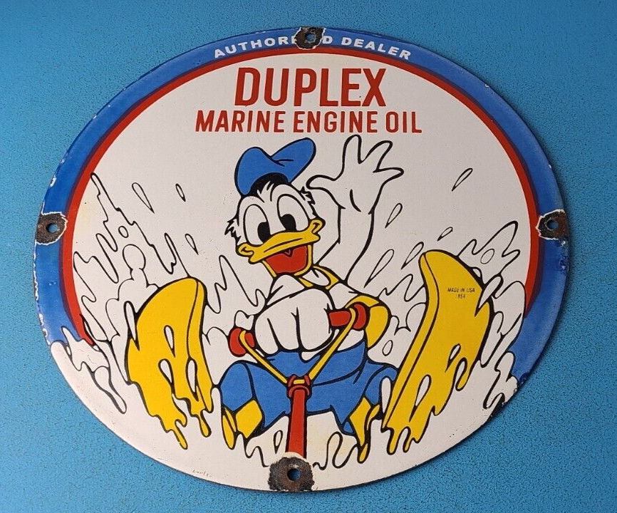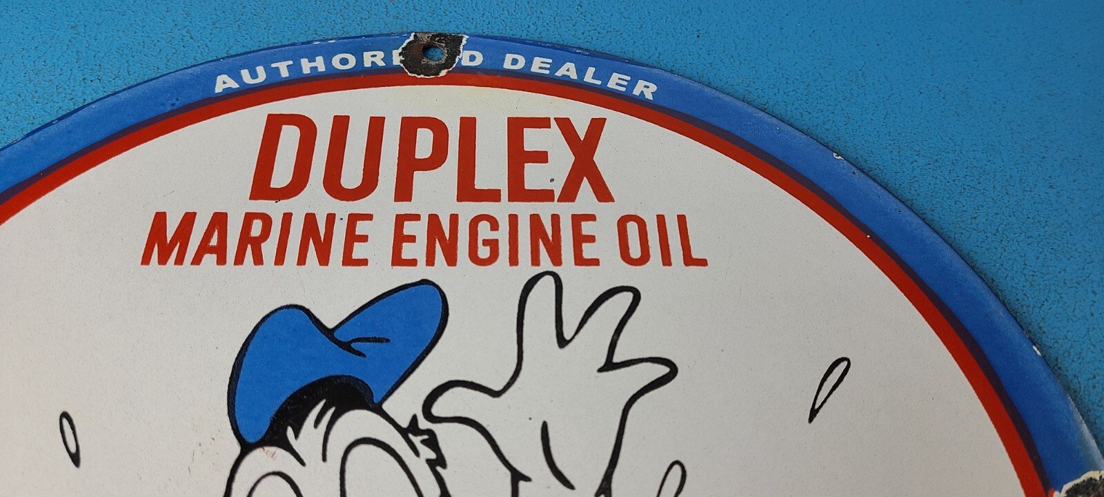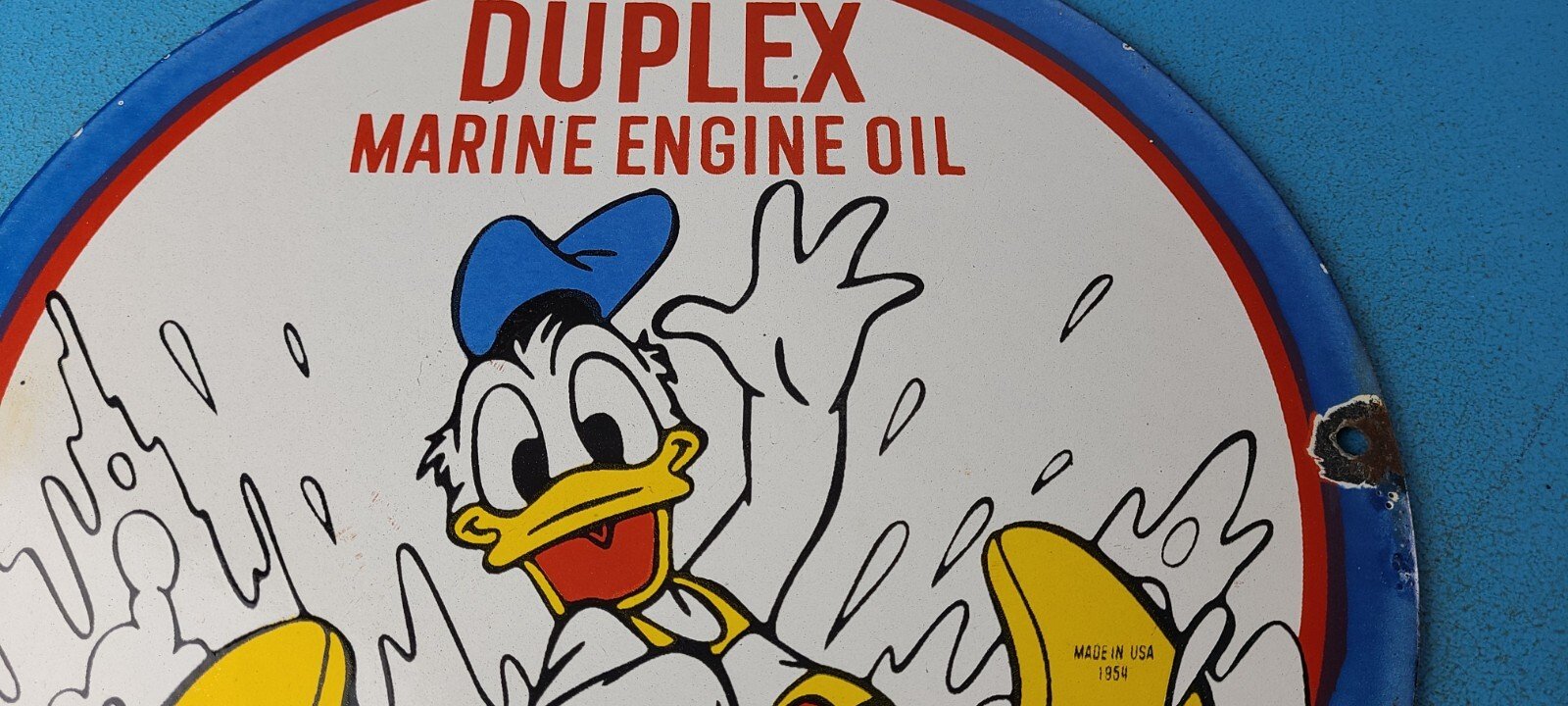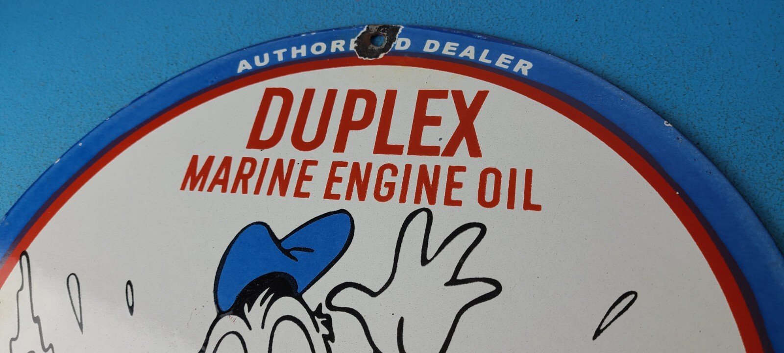 For sale is a vintage Duplex Marine Engine Oil porcelain gas service station & pump plate sign. Please view the pictures as they are part of the description (a picture is worth a thousand words)! I try my best to take pictures of all the angles of this sign. This sign has excellent colors and gloss. Sign measures 12″. Check out my other auctions, and feel free to ask questions. Perfect for gas collectors, automobile enthusiasts, sign collection, man cave, restaurant, bar, garage, displays anywhere. See my other gas & motor oil, aviation, automotive, soda & beverage signs. $10 for shipping anywhere in the U.S. with Priority Mail. Shipping will be $5.00 for each additional item!
