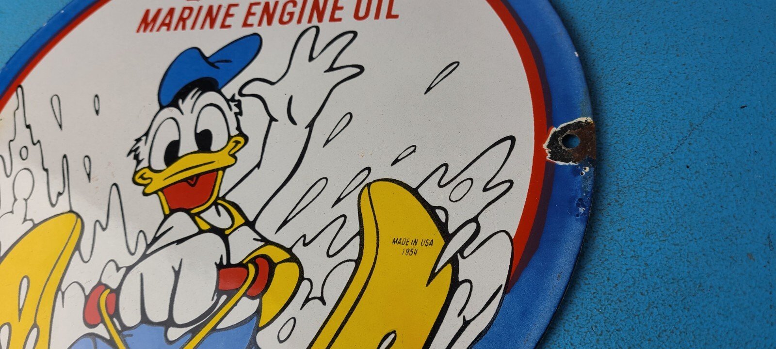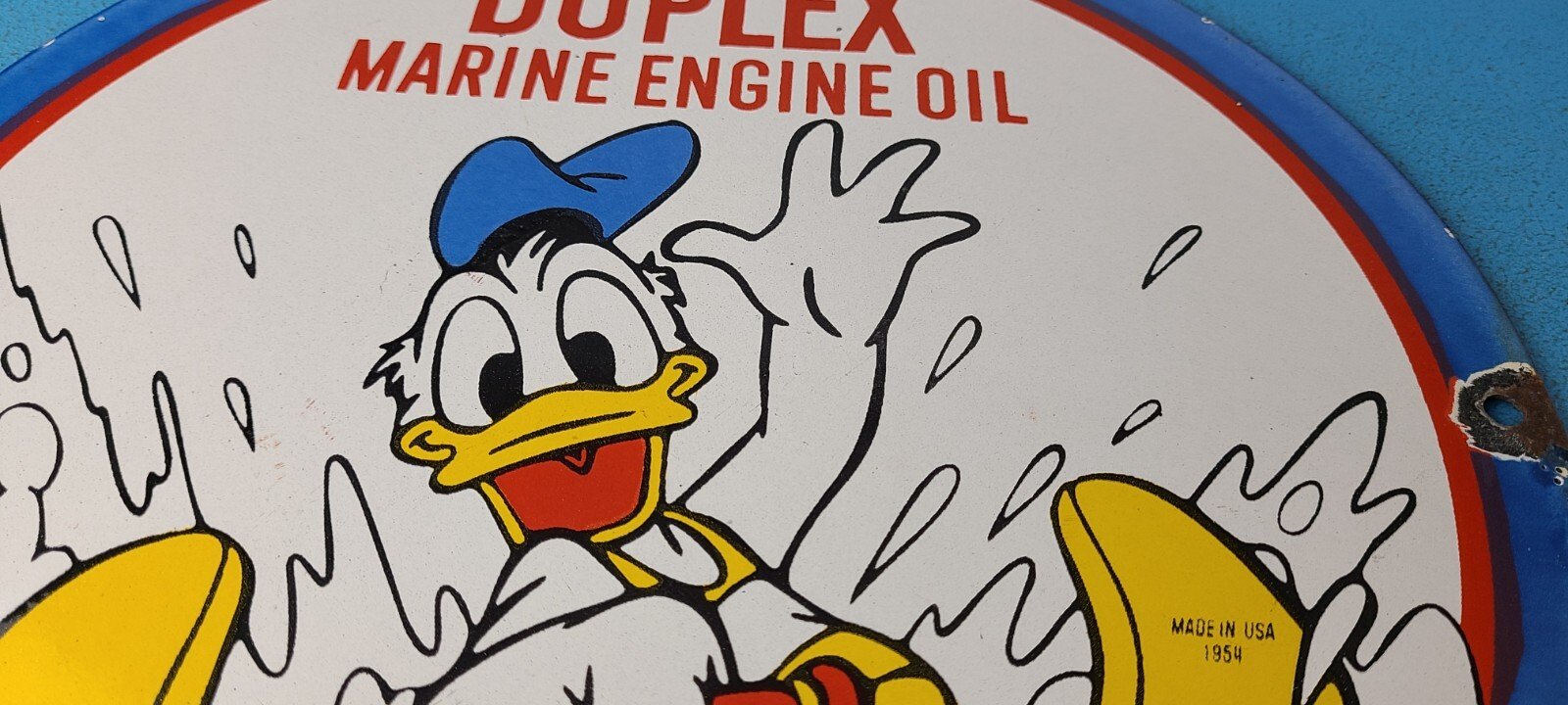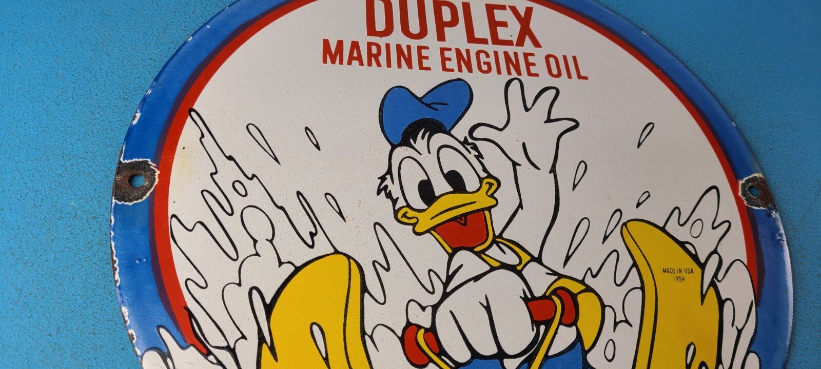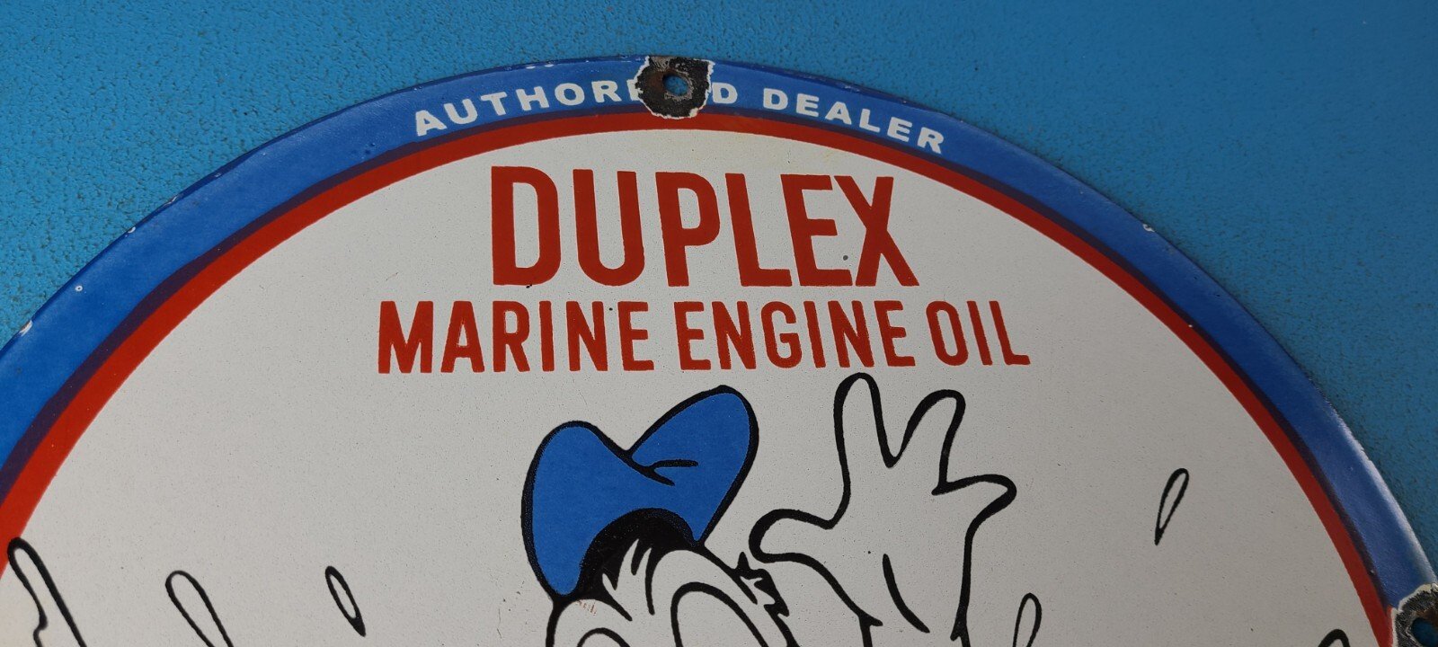 For sale is a vintage Duplex Marine Engine Oil porcelain gas service station & pump plate sign. Please view the pictures as they are part of the description (a picture is worth a thousand words)! I try my best to take pictures of all the angles of this sign. This sign has excellent colors and gloss. Sign measures 12″. Check out my other auctions, and feel free to ask questions. Perfect for gas collectors, automobile enthusiasts, sign collection, man cave, restaurant, bar, garage, displays anywhere. See my other gas & motor oil, aviation, automotive, soda & beverage signs. $10 for shipping anywhere in the U.S. with Priority Mail. Shipping will be $5.00 for each additional item!