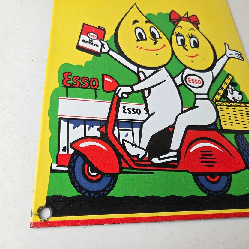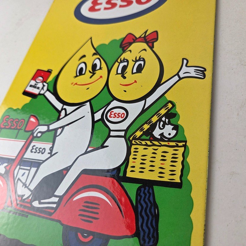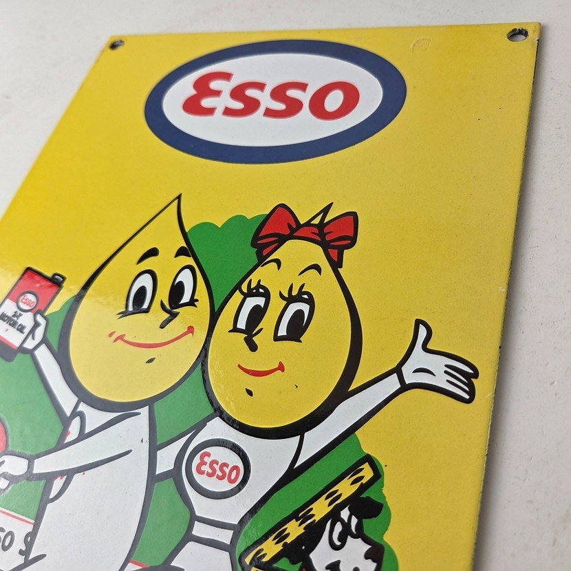 This vintage sign from Esso Gasoline features the Esso Oil Drop boy and girl and is perfect for collectors of gas and oil memorabilia. Whether you’re a fan of vintage advertising or simply appreciate the history of Esso Gasoline, this sign is sure to be a conversation starter. It’s a great addition to any man cave, garage, or collection.