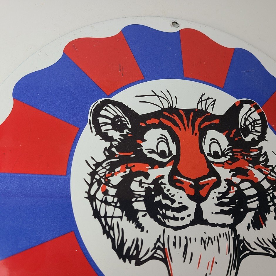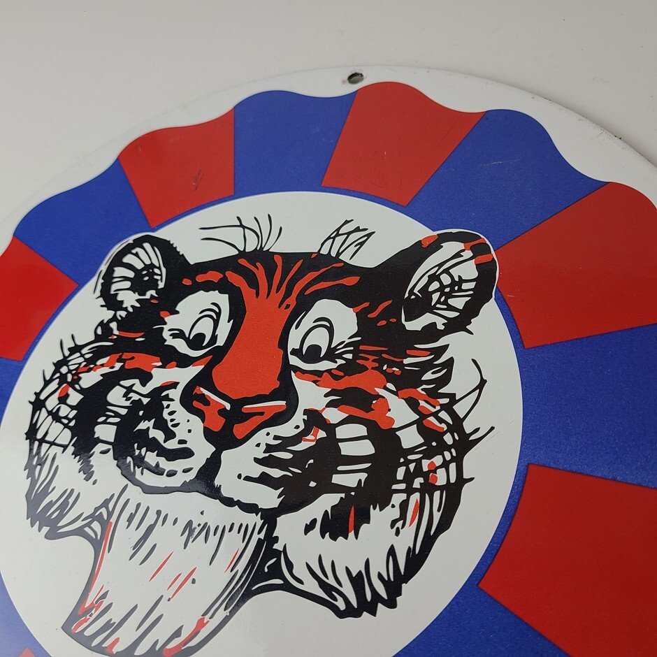 This vintage sign from Esso Gasoline features their iconic tiger and is perfect for collectors of gas and oil memorabilia. Whether you’re a fan of vintage advertising or simply appreciate the history of Esso Gasoline, this sign is sure to be a conversation starter. It’s a great addition to any man cave, garage, or collection.