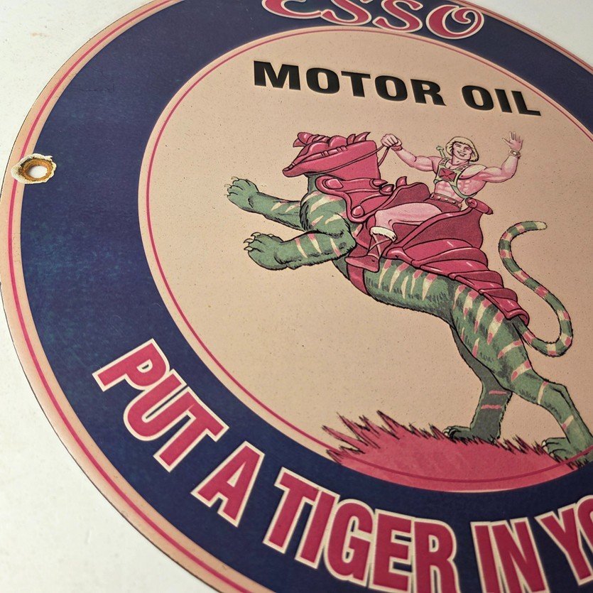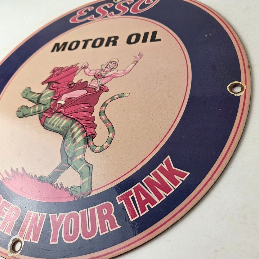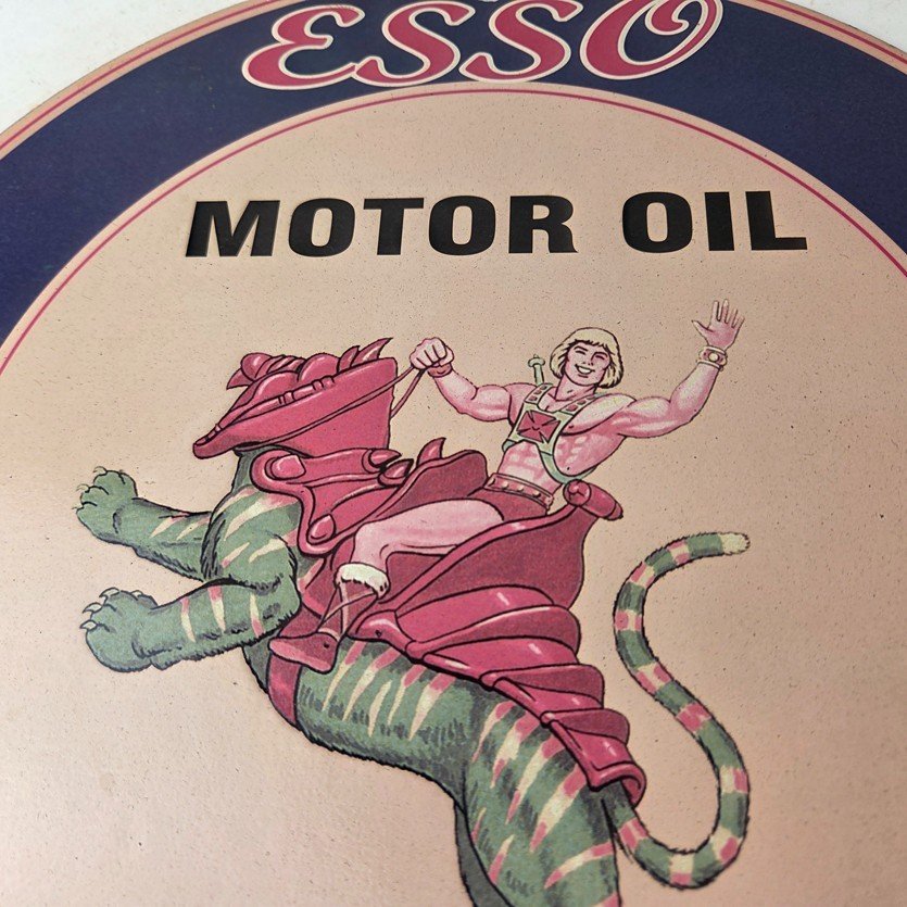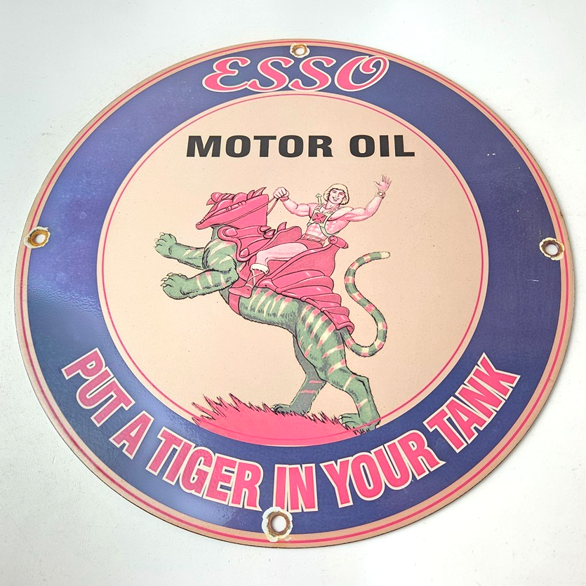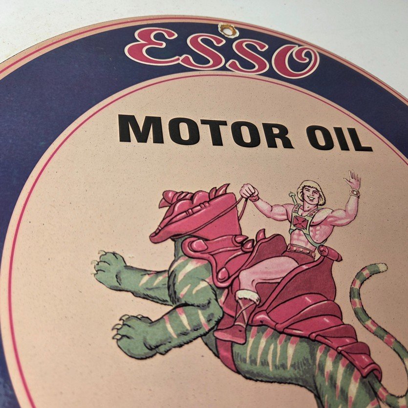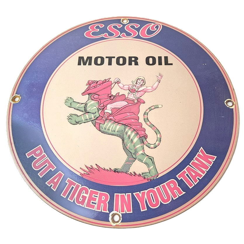 This vintage sign from Esso Gasoline features their iconic He-Man advertising. Whether you’re a fan of vintage advertising or simply appreciate the history of Esso Gasoline, this sign is sure to be a conversation starter. It’s a great addition to any man cave, garage, or collection.