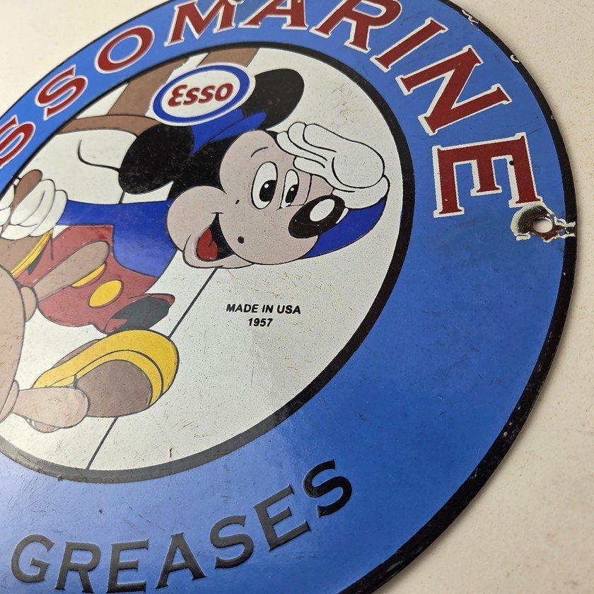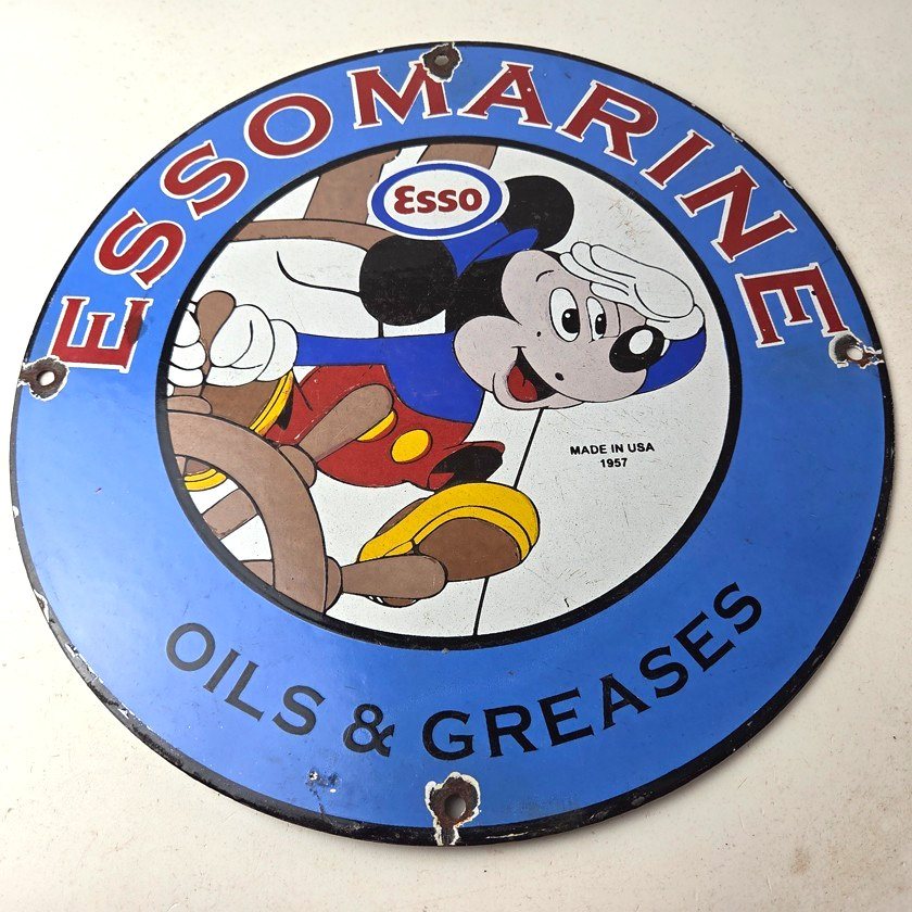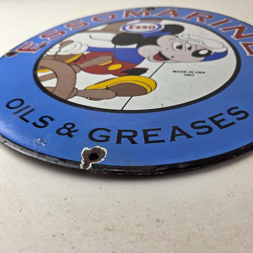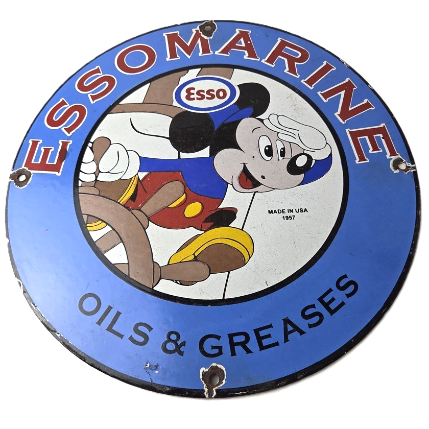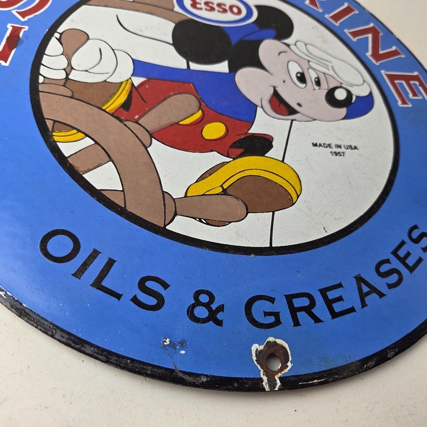 This vintage sign from Esso Gasoline features their iconic Marine Oils and Greases and is perfect for collectors of gas and oil memorabilia. Whether you’re a fan of vintage advertising or simply appreciate the history of Esso Gasoline, this sign is sure to be a conversation starter. It’s a great addition to any man cave, garage, or collection.
