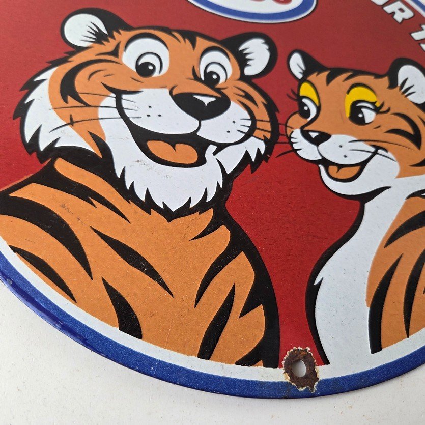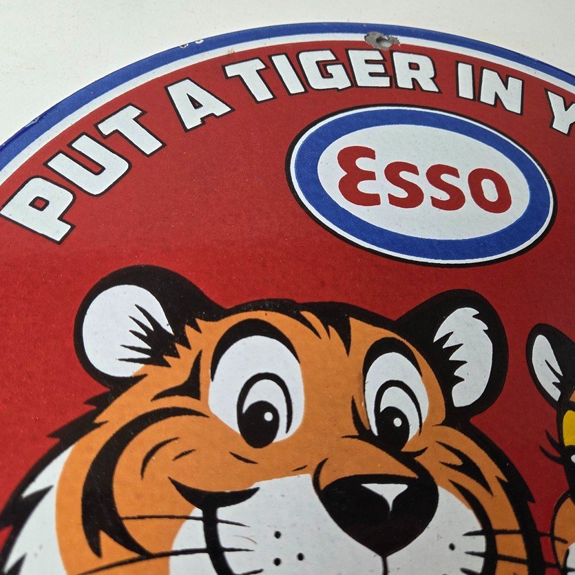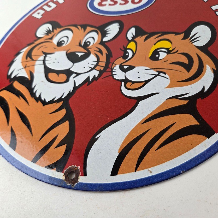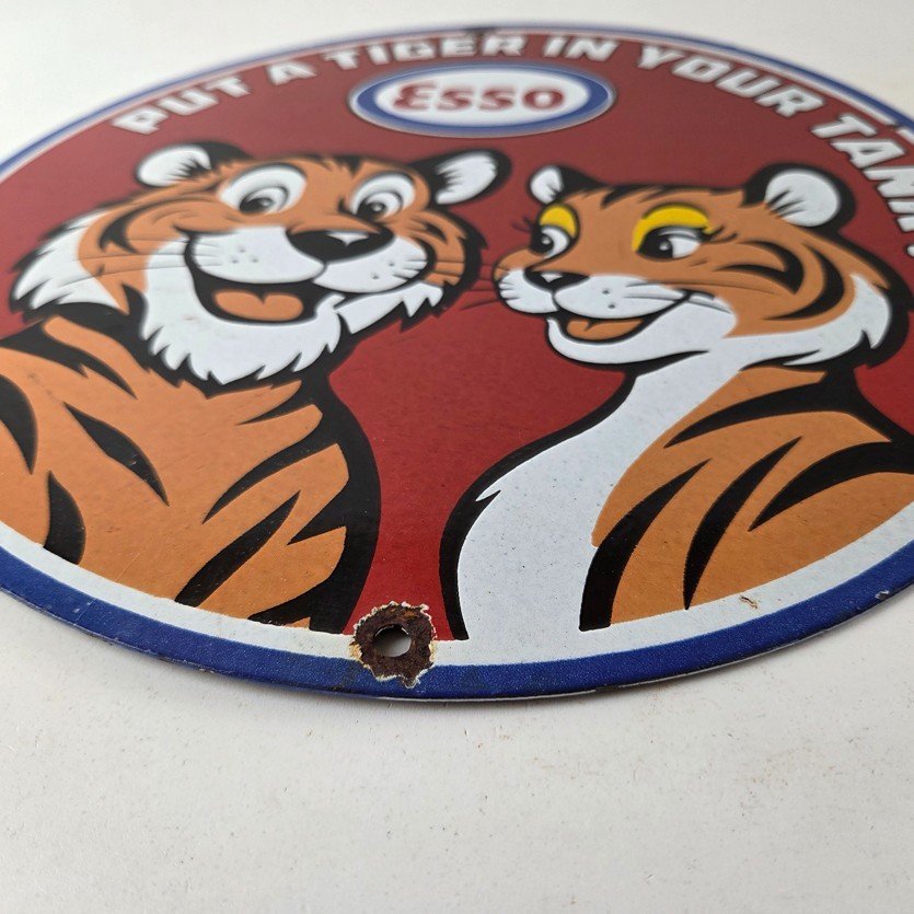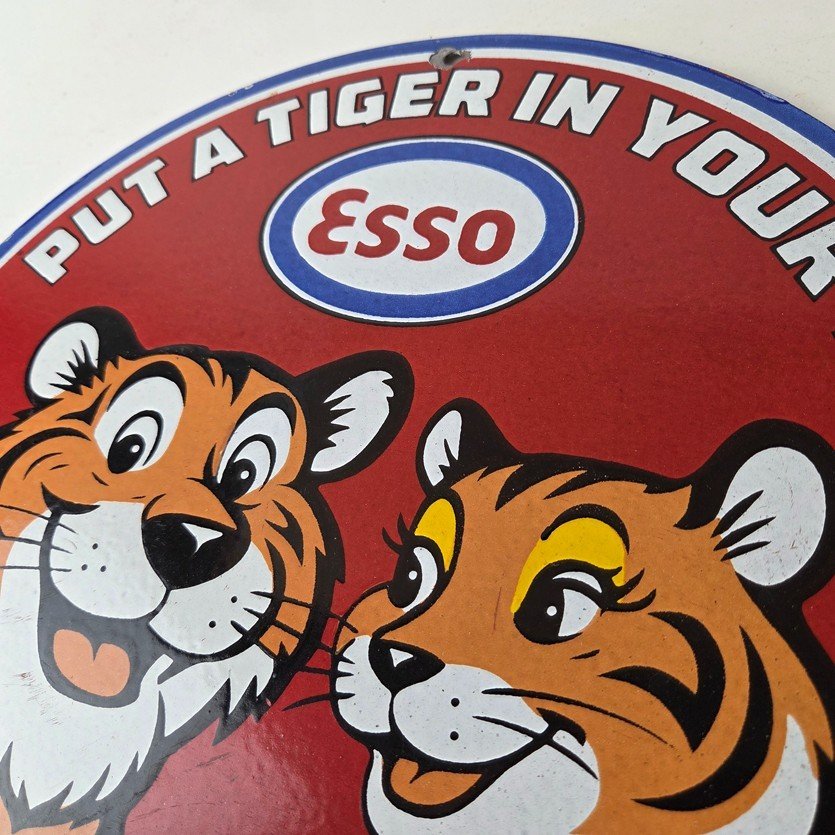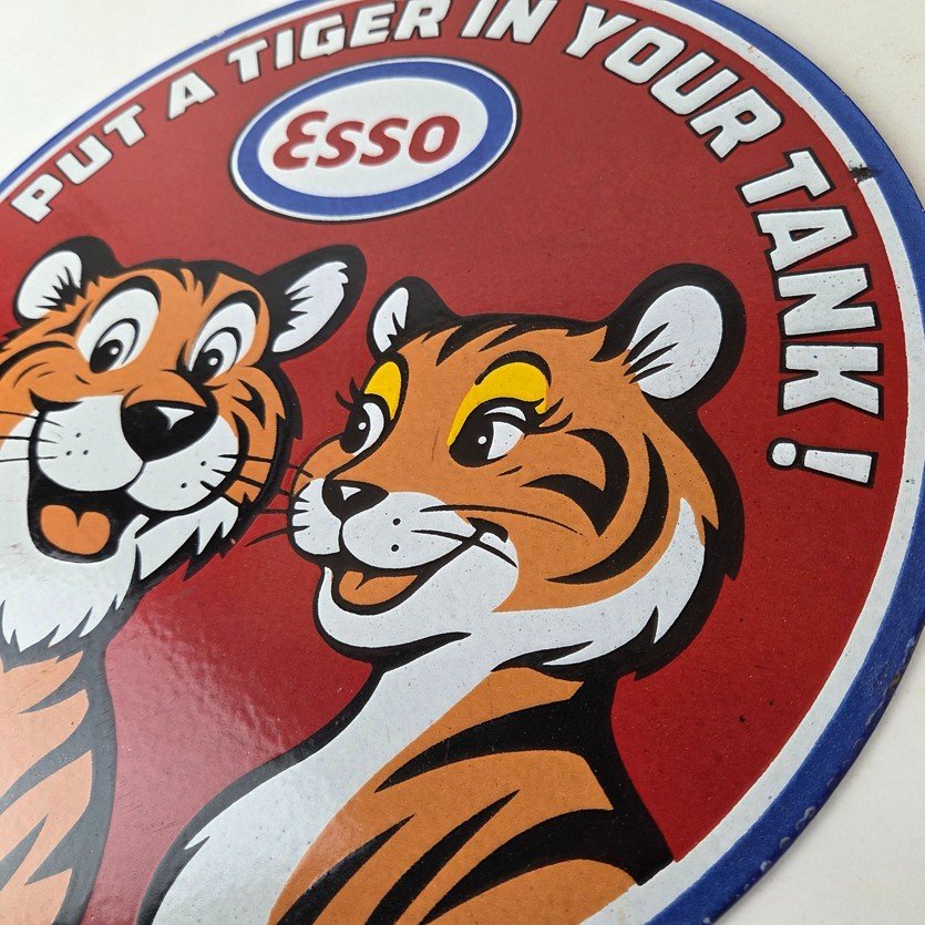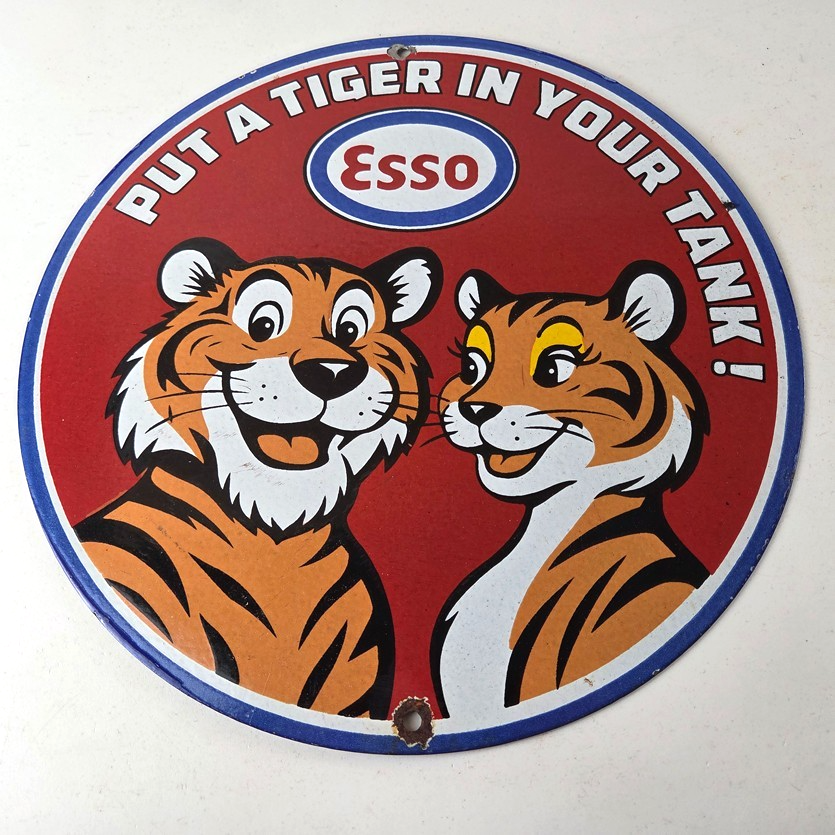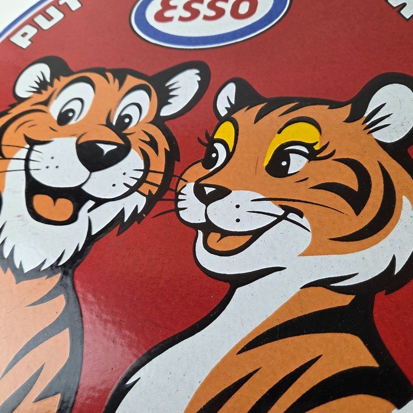 This vintage sign from Esso Gasoline features their iconic tigers and is perfect for collectors of gas and oil memorabilia. Whether you’re a fan of vintage advertising or simply appreciate the history of Esso Gasoline, this sign is sure to be a conversation starter. It’s a great addition to any man cave, garage, or collection.