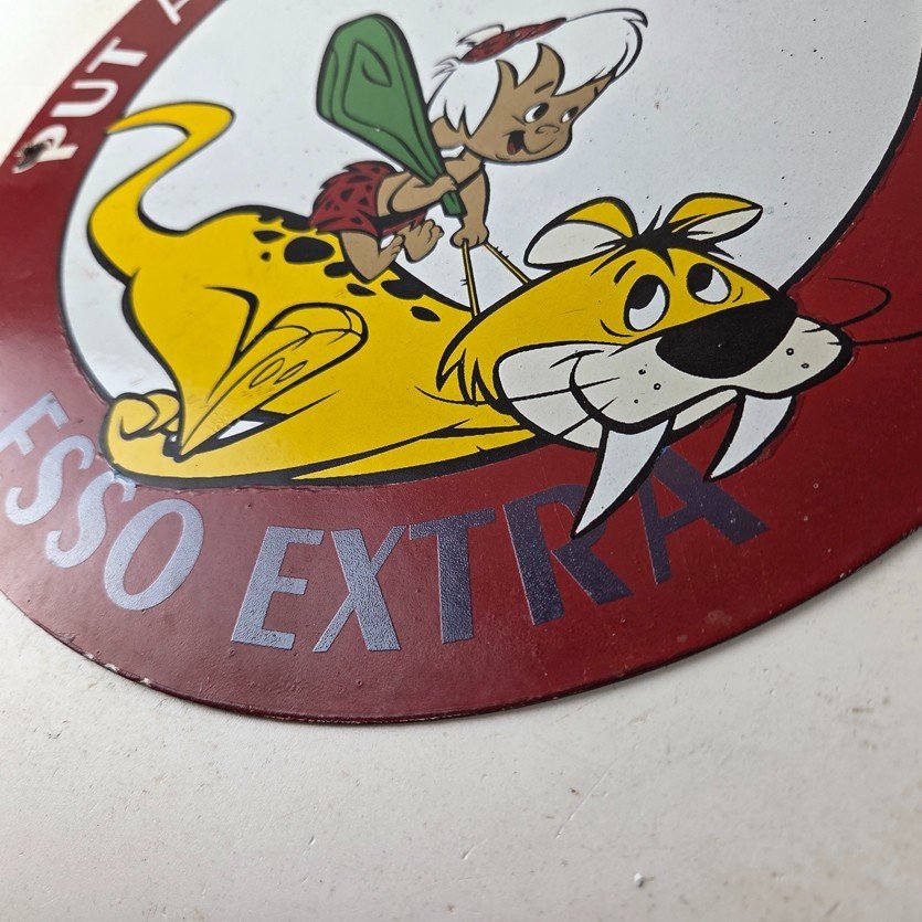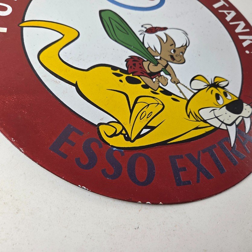 This vintage sign from Esso Gasoline features their iconic Flintstones Bam Bam and is perfect for collectors of gas and oil memorabilia. Whether you’re a fan of vintage advertising or simply appreciate the history of Esso Gasoline, this sign is sure to be a conversation starter. It’s a great addition to any man cave, garage, or collection.