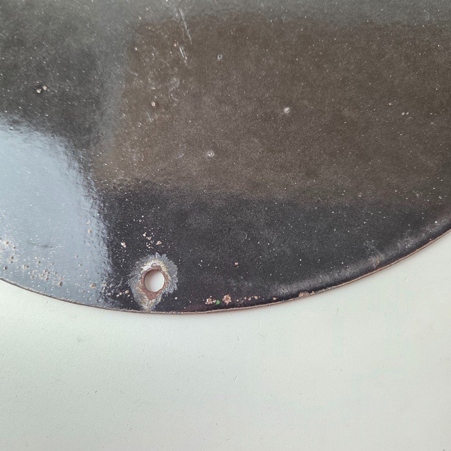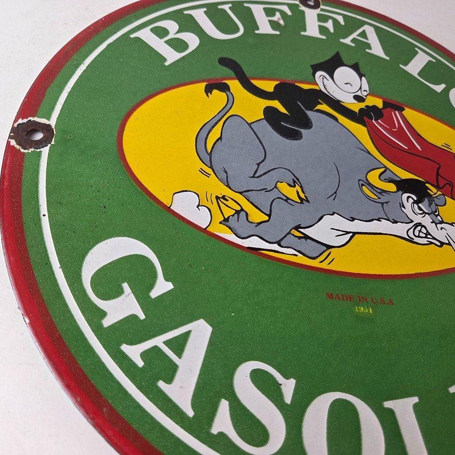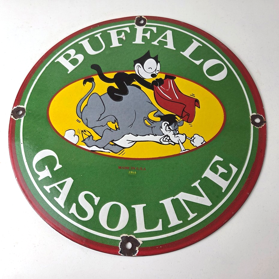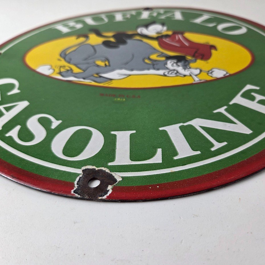 This vintage Buffalo Gasoline porcelain sign features a striking design with bold colors and is made of porcelain material. It is perfect for display in a garage, shop, or man cave. The sign measures 12″ and is in excellent condition, with no major chips or cracks. It was made in the United States and has excellent porcelain and colors.