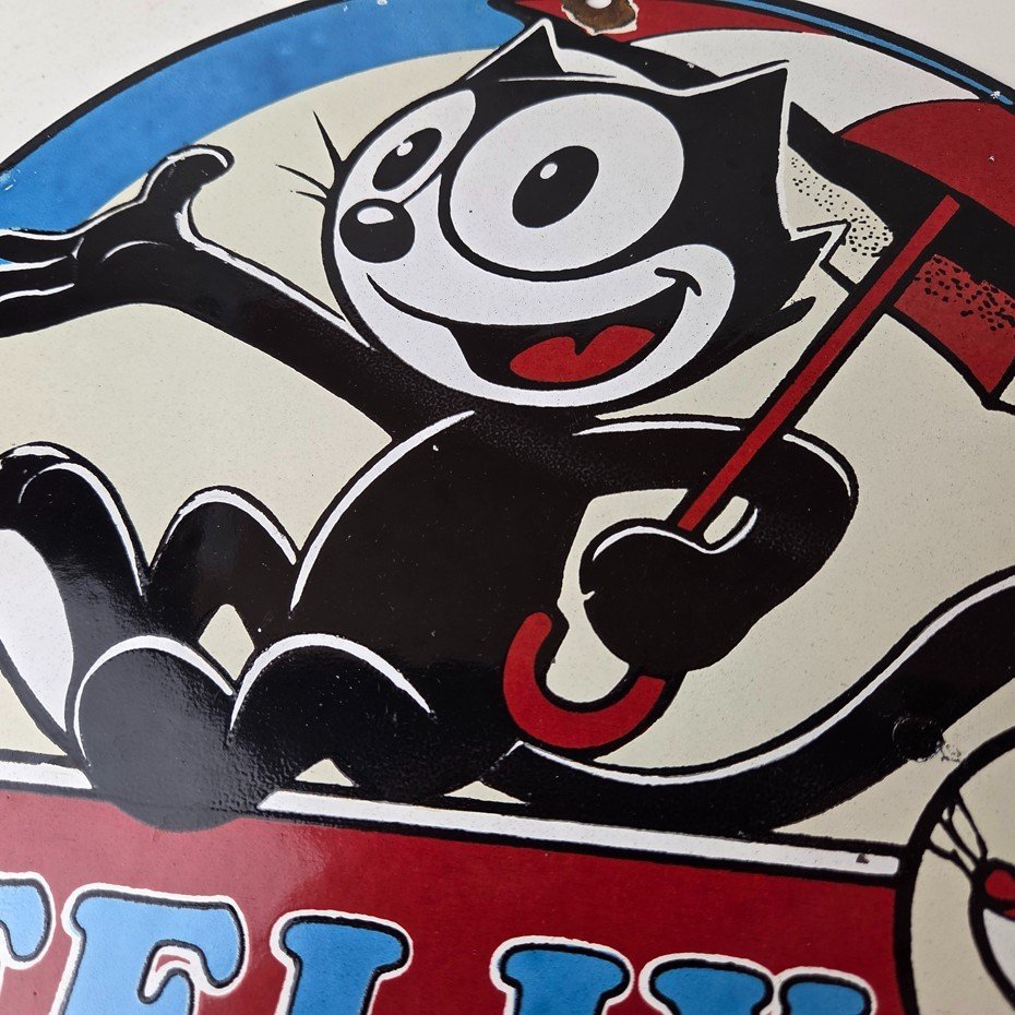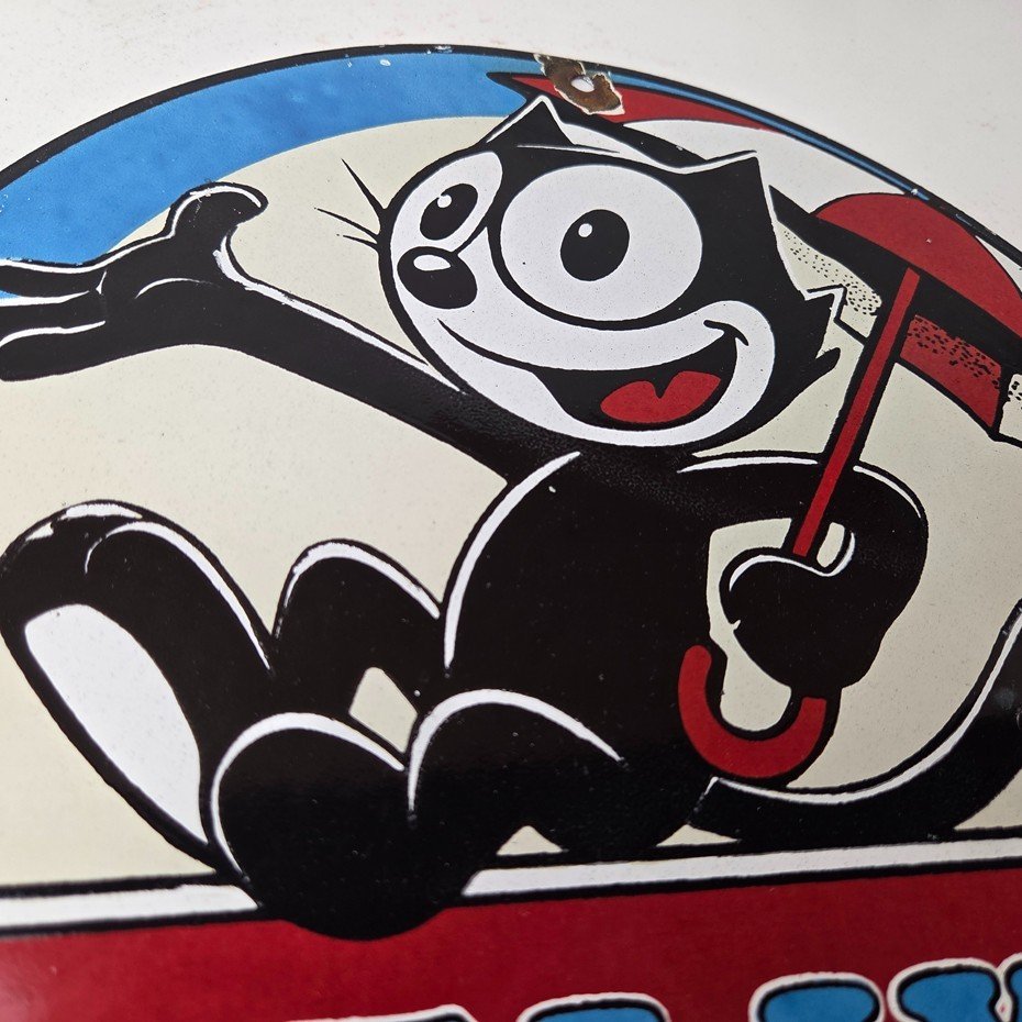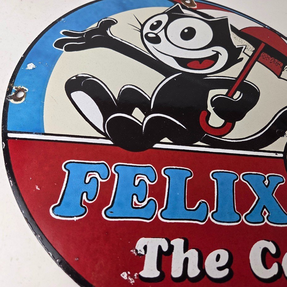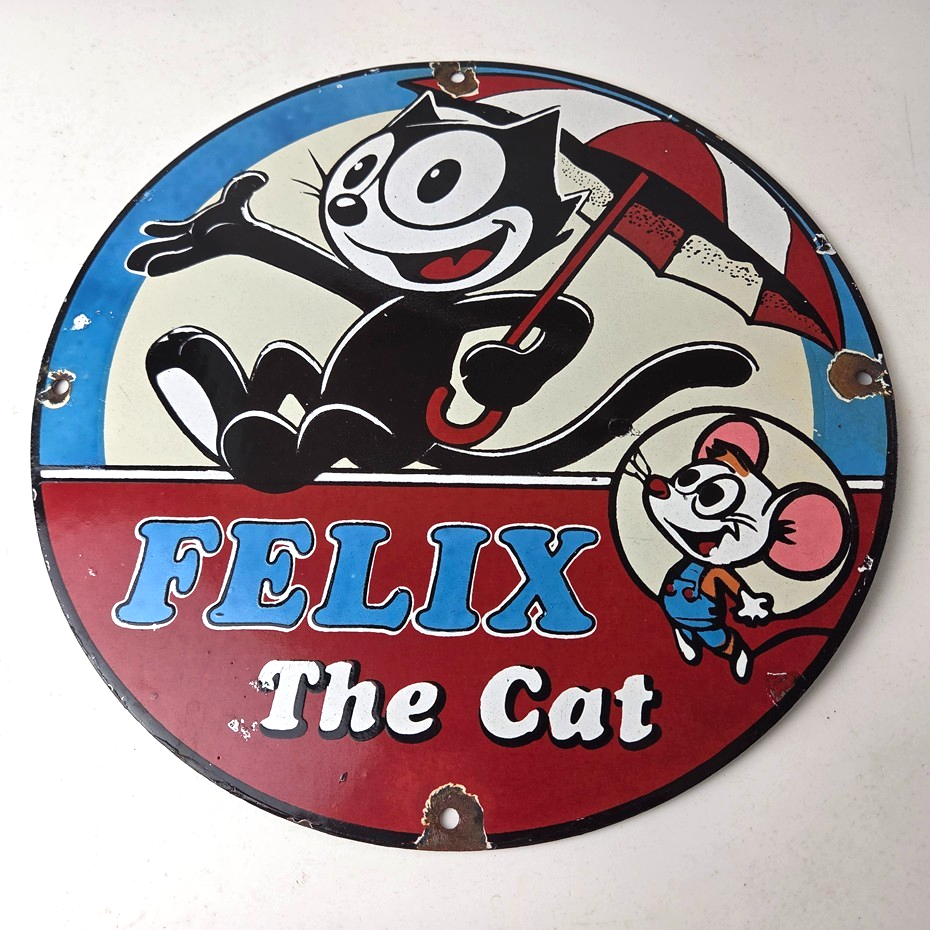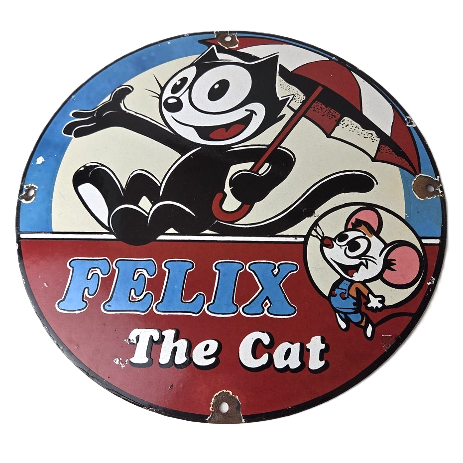 This vintage Felix the Cat porcelain sign features Felix the Cat and advertises their comic book cartoon graphics. The sign measures 12″ across and is made of porcelain.