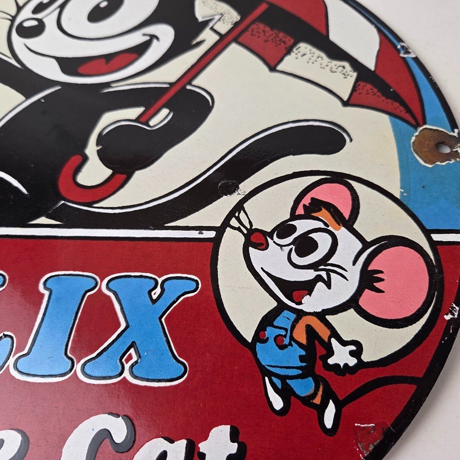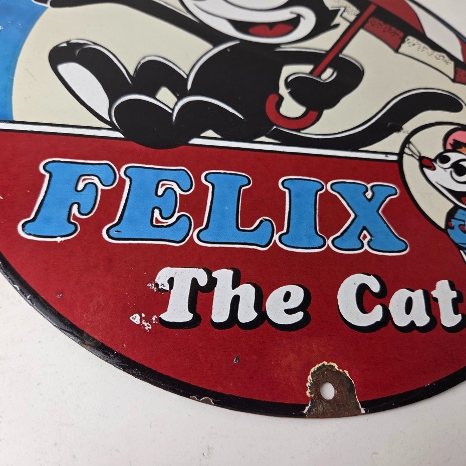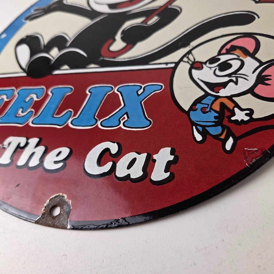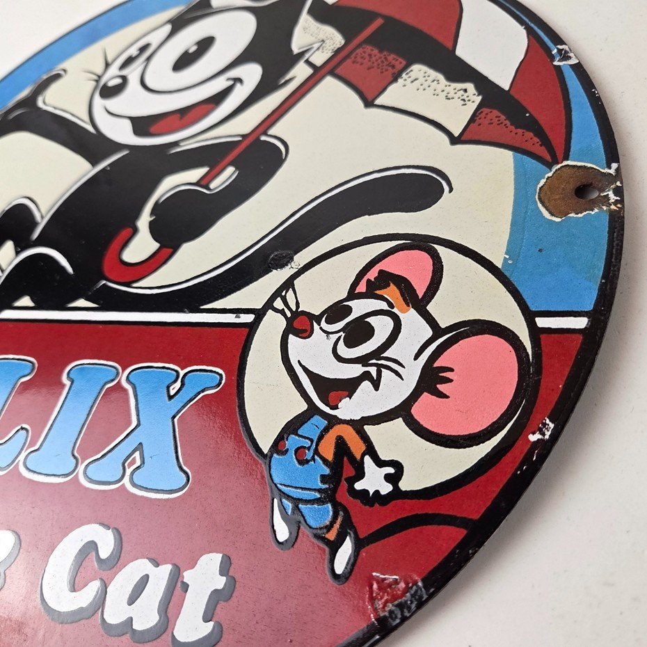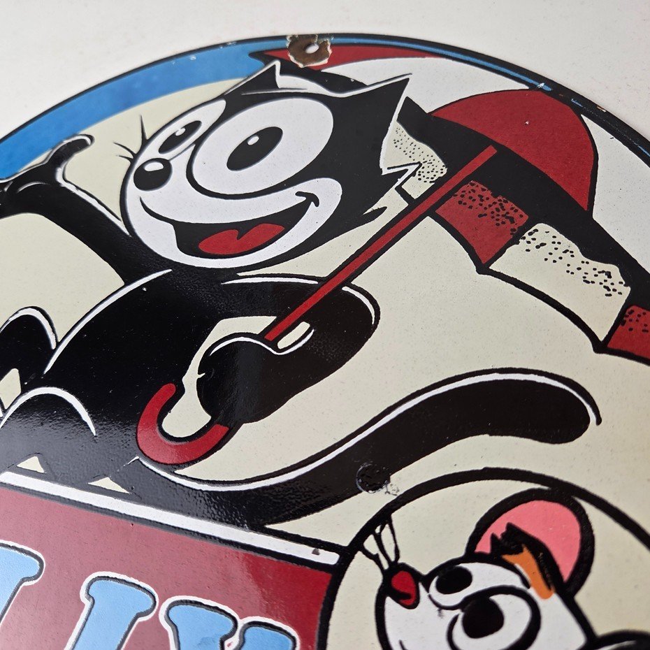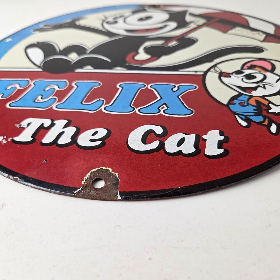 This vintage Felix the Cat porcelain sign features Felix the Cat and advertises their comic book cartoon graphics. The sign measures 12″ across and is made of porcelain.