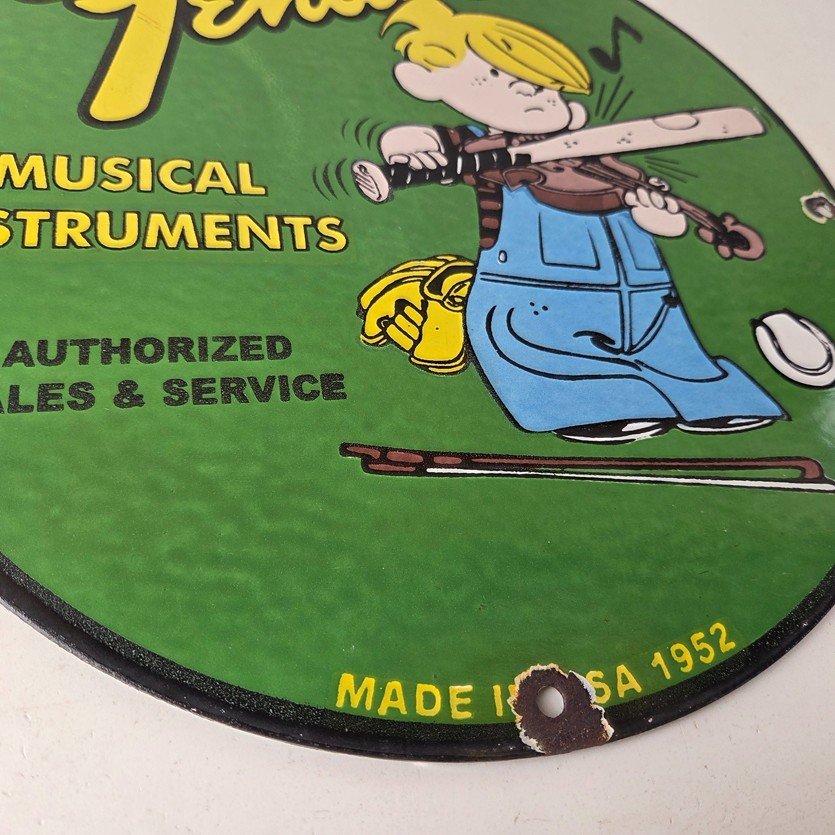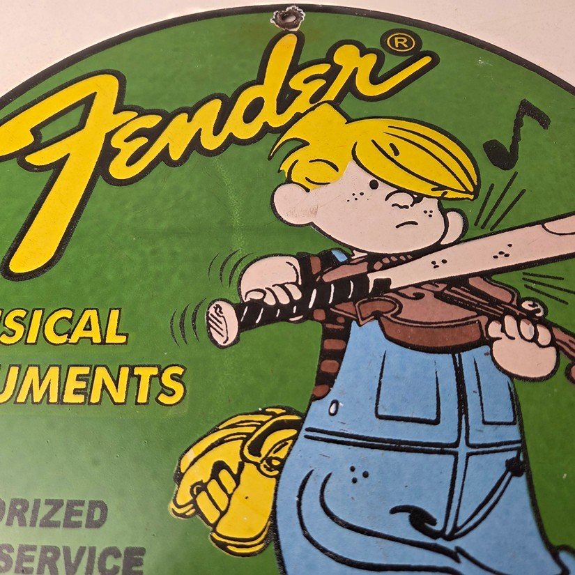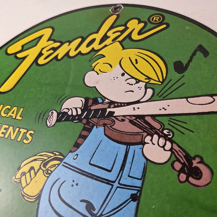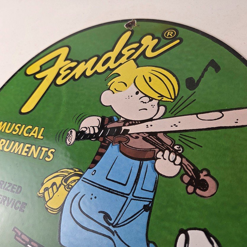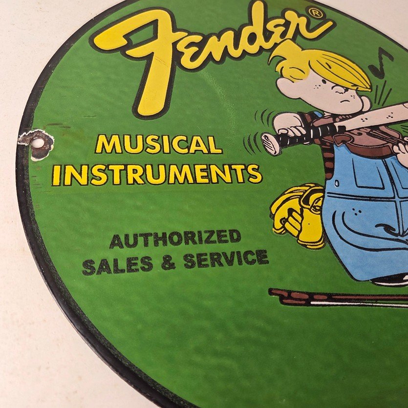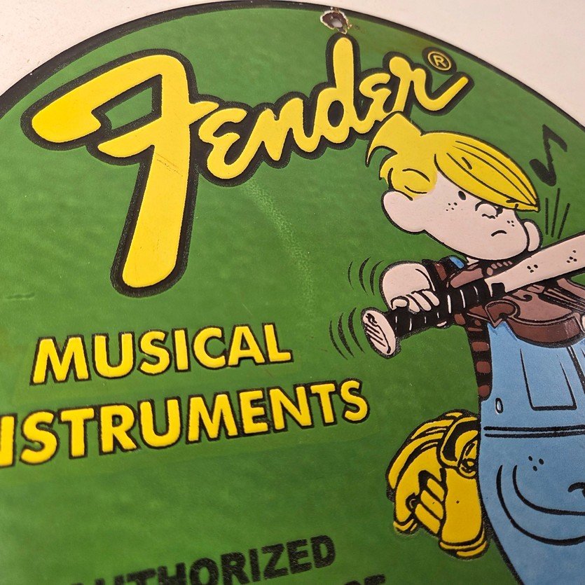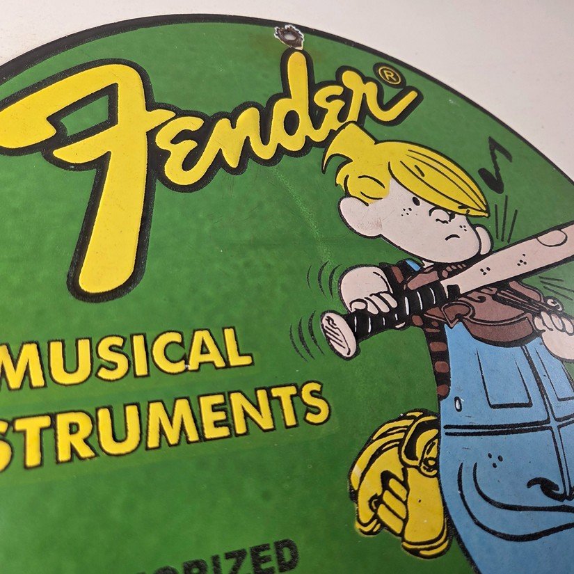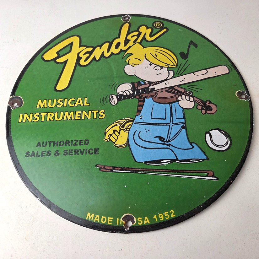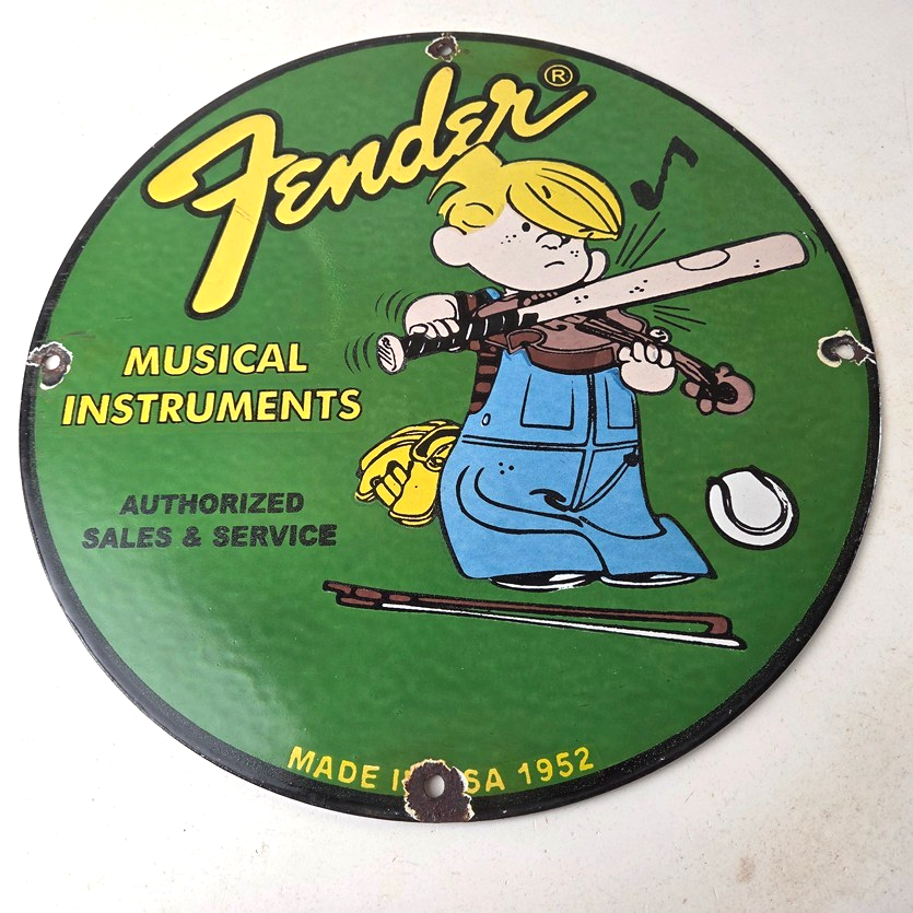 This vintage porcelain sign features a Fender Guitar with large Fender lettering. The sign is 12″ in size and boasts vibrant colors and gloss. This sign will make a great addition to any collection and is sure to be a conversation starter. This sign will enhance your mancave, collection, shop, or garage.
