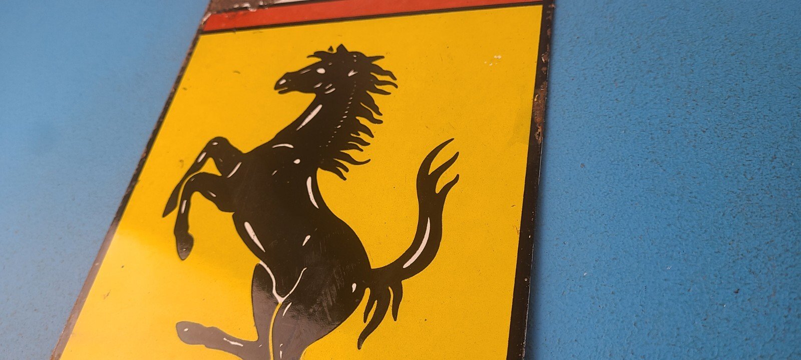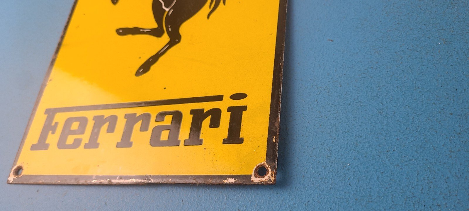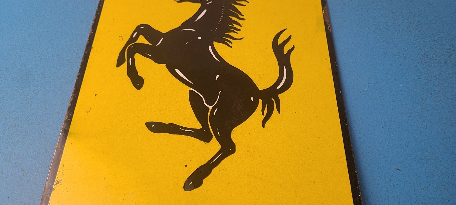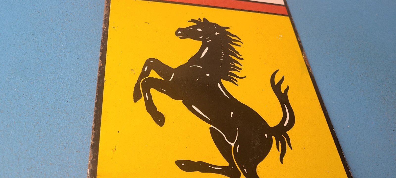 This vintage Ferrari Automobiles porcelain sign features the iconic Ferrari brand and showcases the Ferrari Stallion in the center. Measuring at 12″ x 7″, this porcelain gas sign is perfect for collectors and enthusiasts of gas & oil themed merchandise and memorabilia.