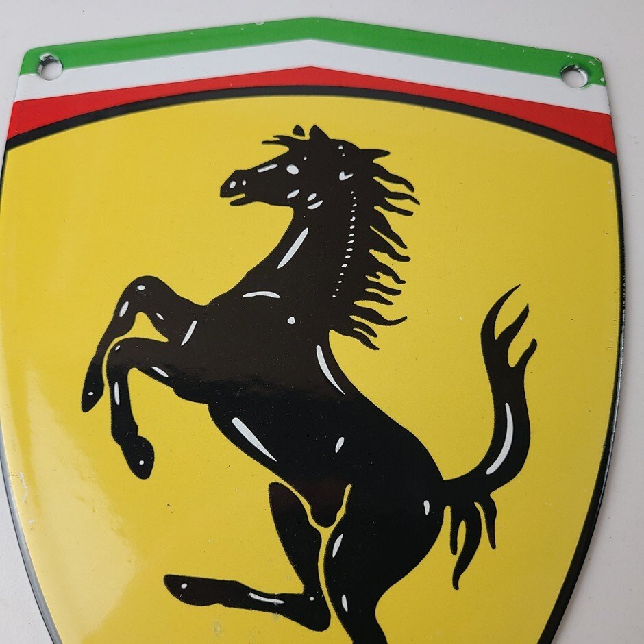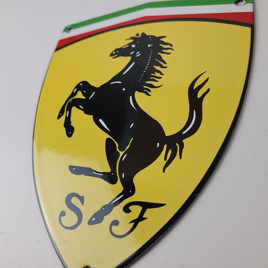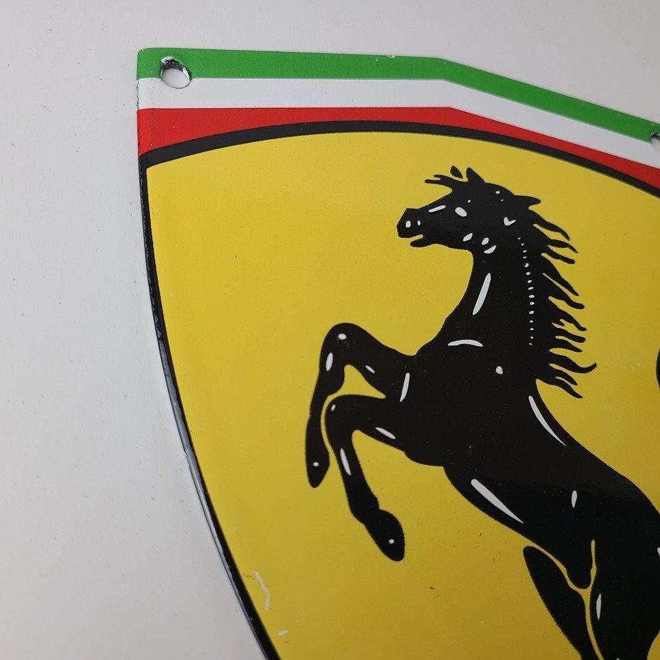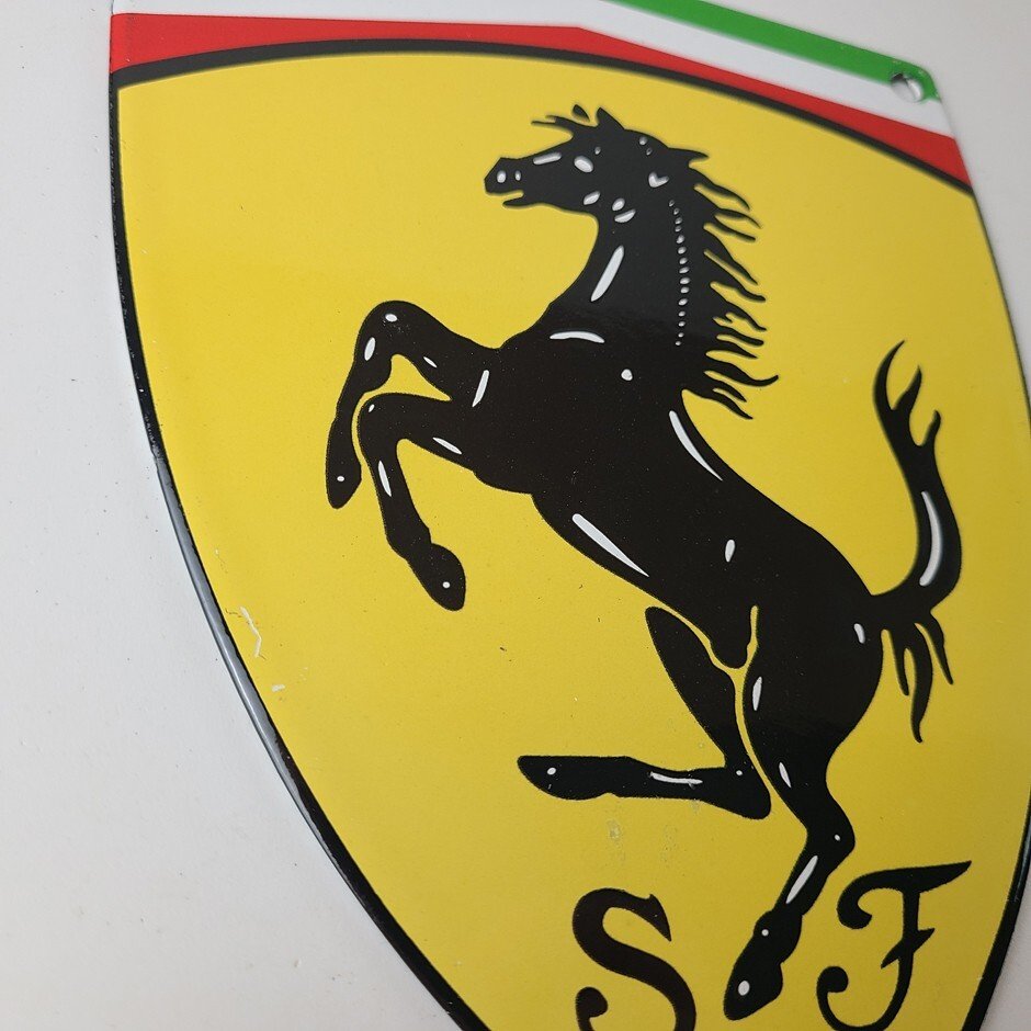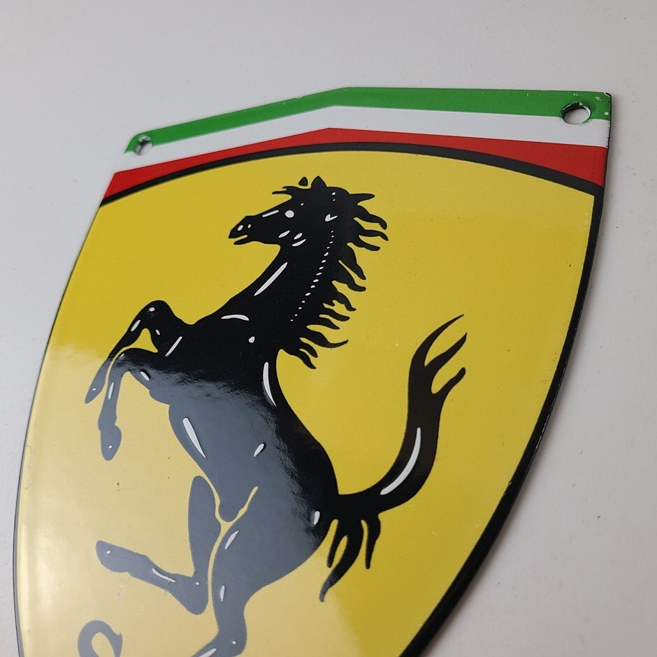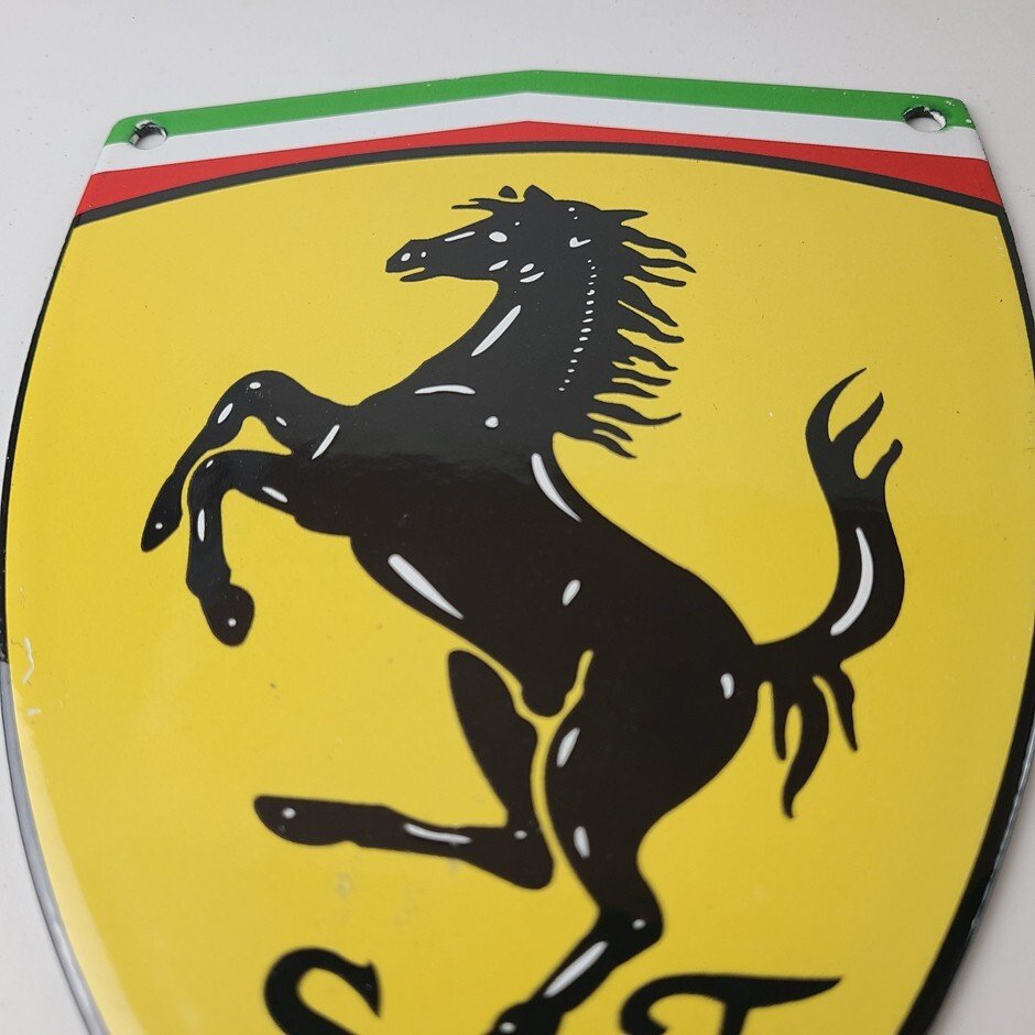 This vintage Ferrari Automobiles porcelain sign features the iconic Ferrari brand and showcases the Ferrari Stallion in the center. Measuring at 5 7/8″ x 7 7/8″, this porcelain gas sign is perfect for collectors and enthusiasts of gas & oil themed merchandise and memorabilia.