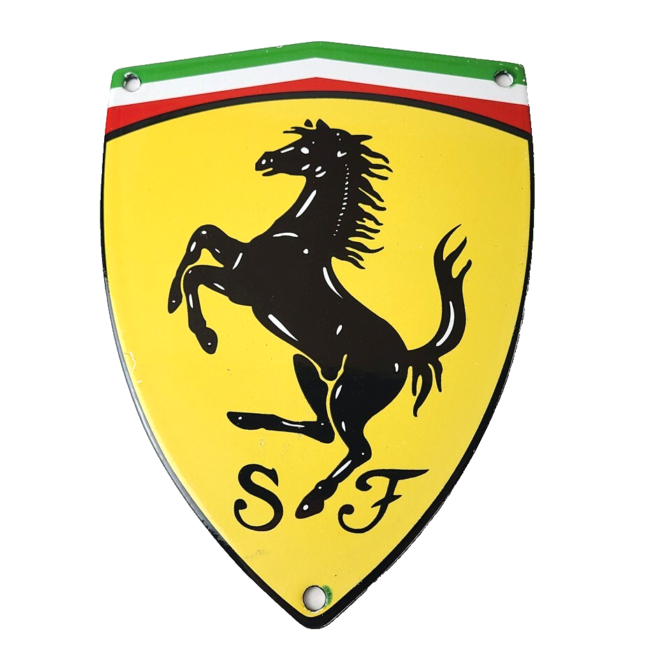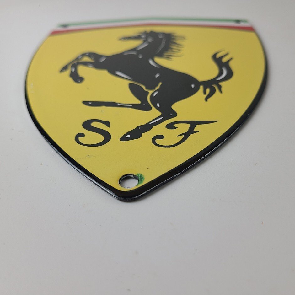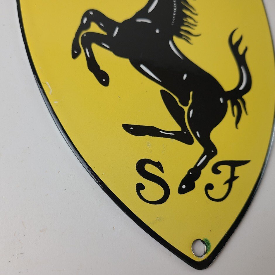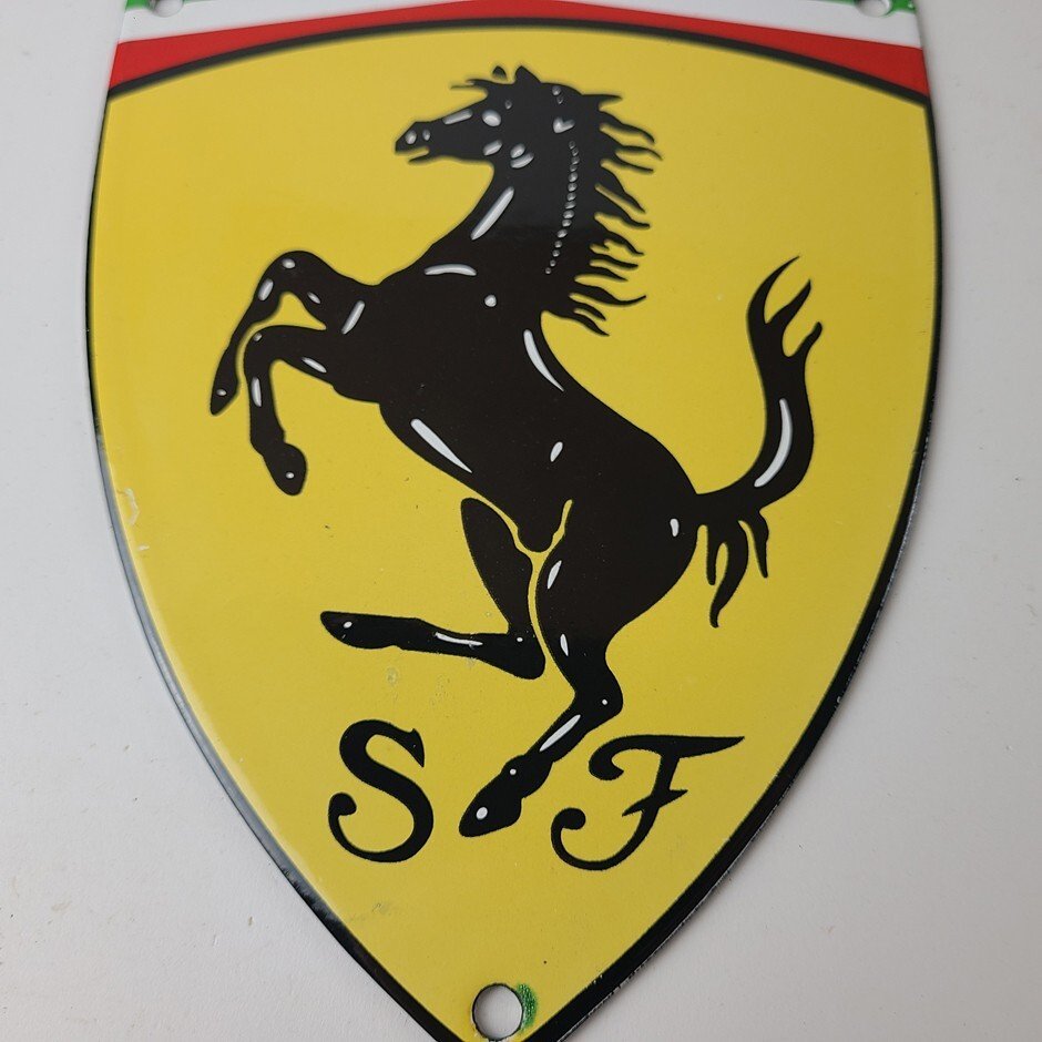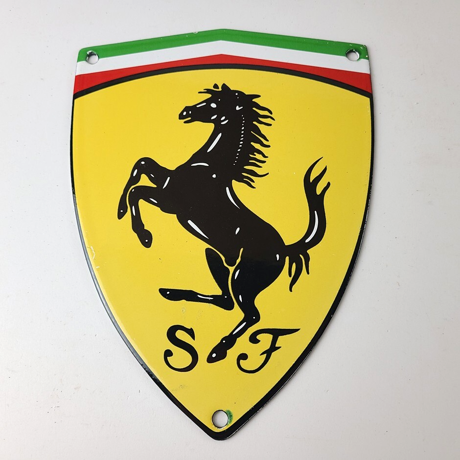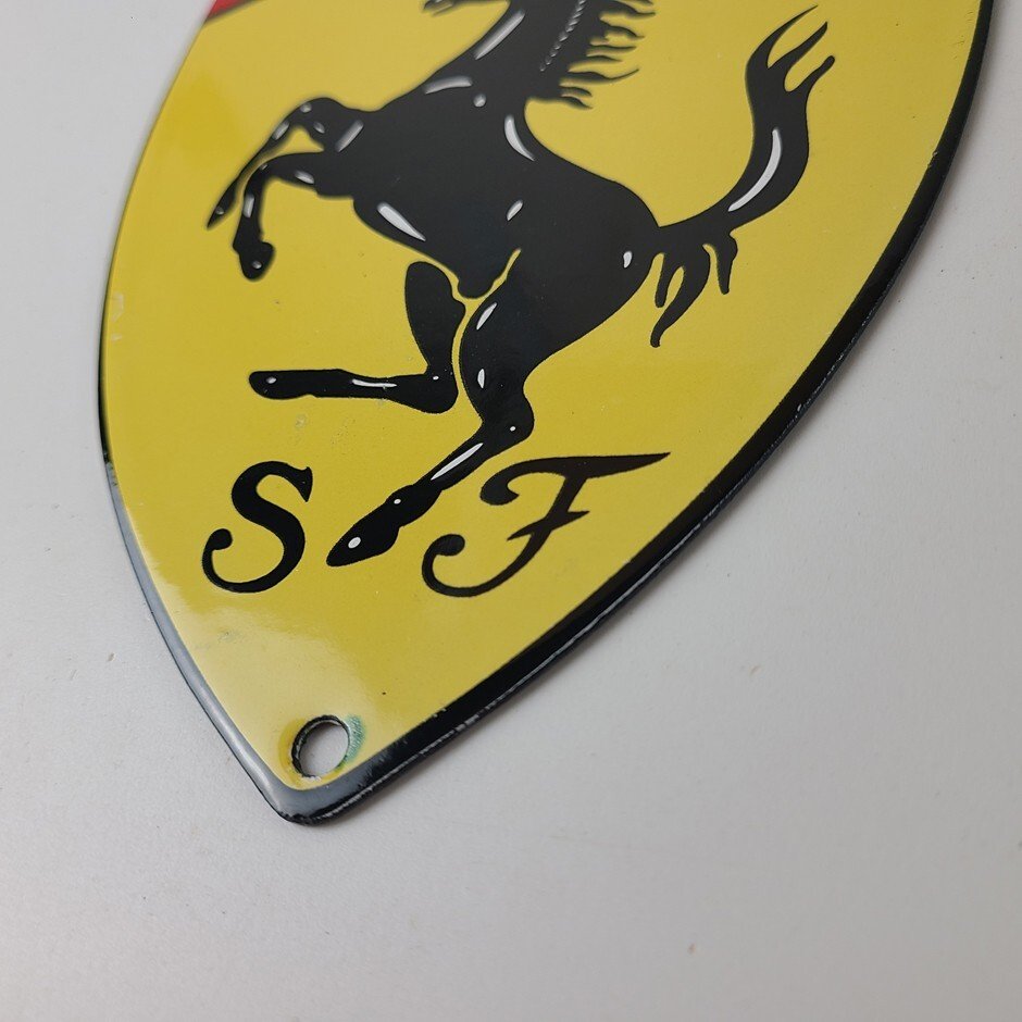 This vintage Ferrari Automobiles porcelain sign features the iconic Ferrari brand and showcases the Ferrari Stallion in the center. Measuring at 5 7/8″ x 7 7/8″, this porcelain gas sign is perfect for collectors and enthusiasts of gas & oil themed merchandise and memorabilia.