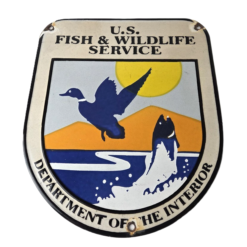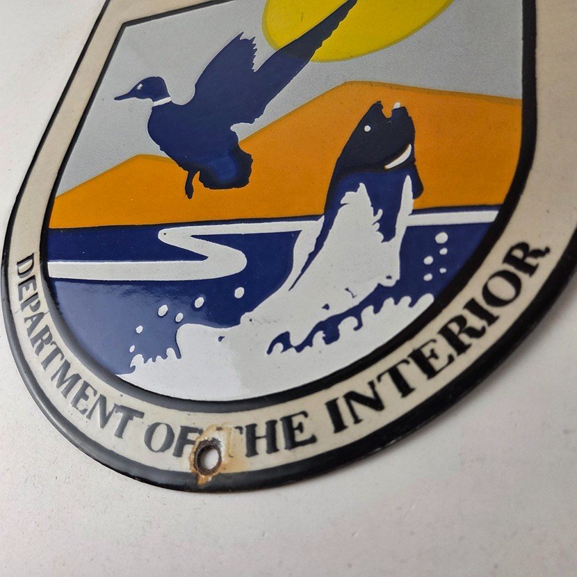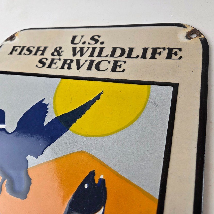 This vintage US Fish & Wildlife porcelain sign is a must-have for any collector of forest service, gas and oil memorabilia.