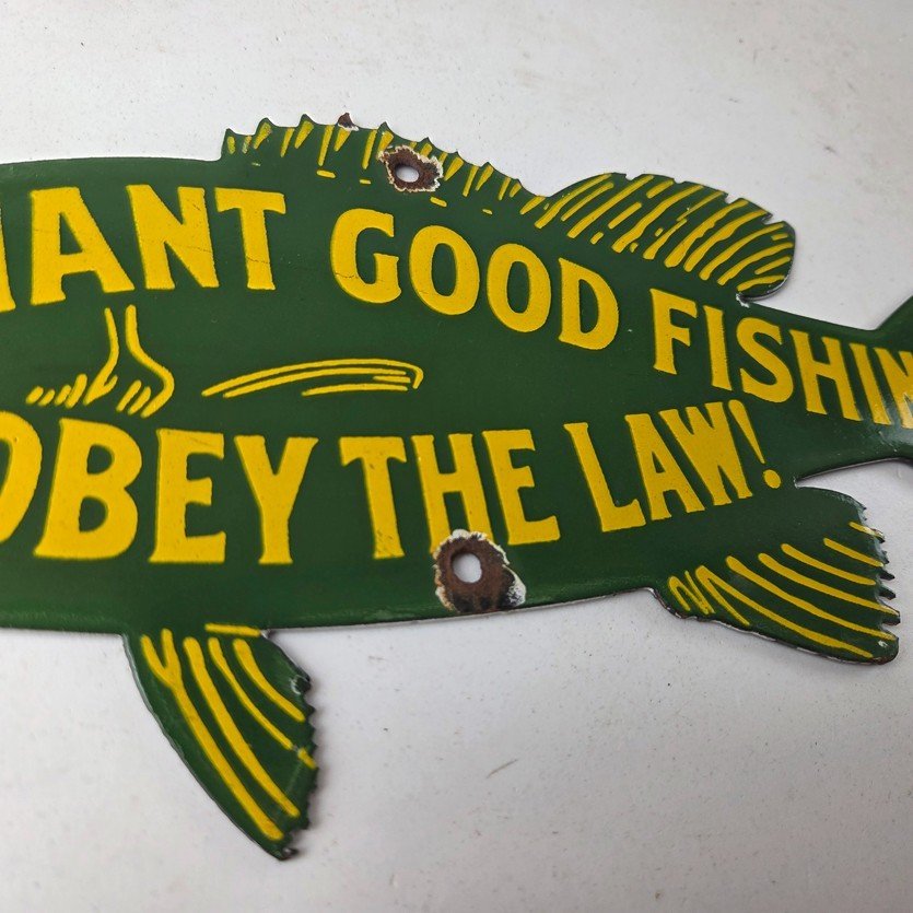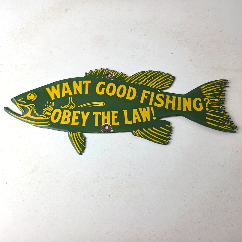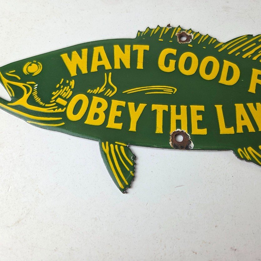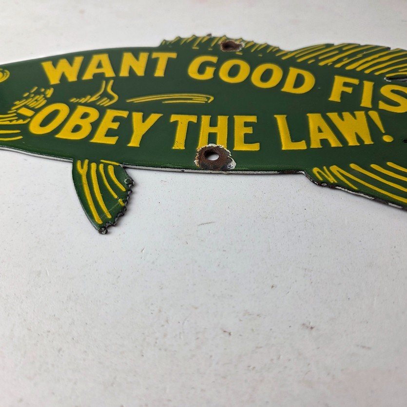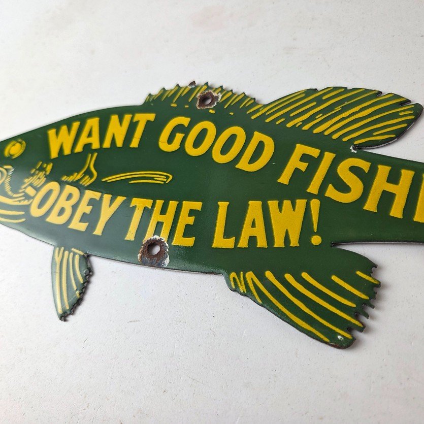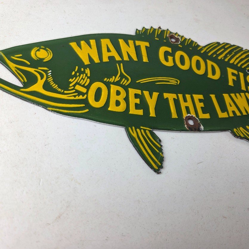 This vintage Obey the Law porcelain sign features the most iconic lure. The sign measures 12″ by 5″ and features excellent porcelain on both sides.