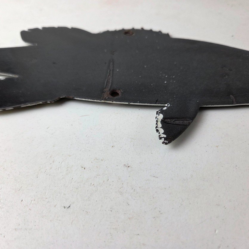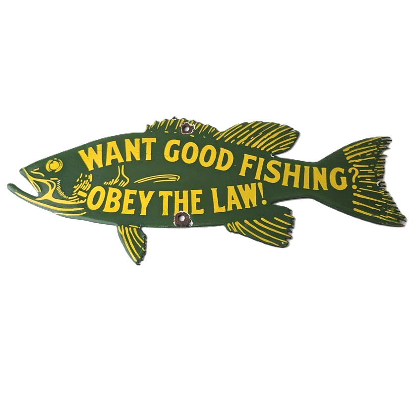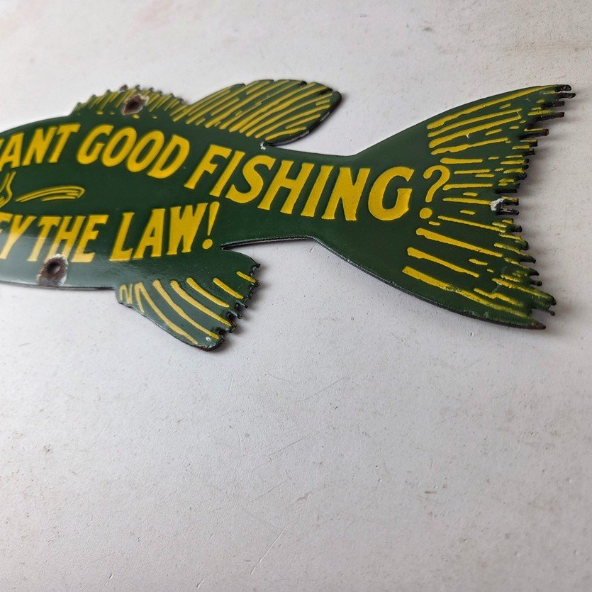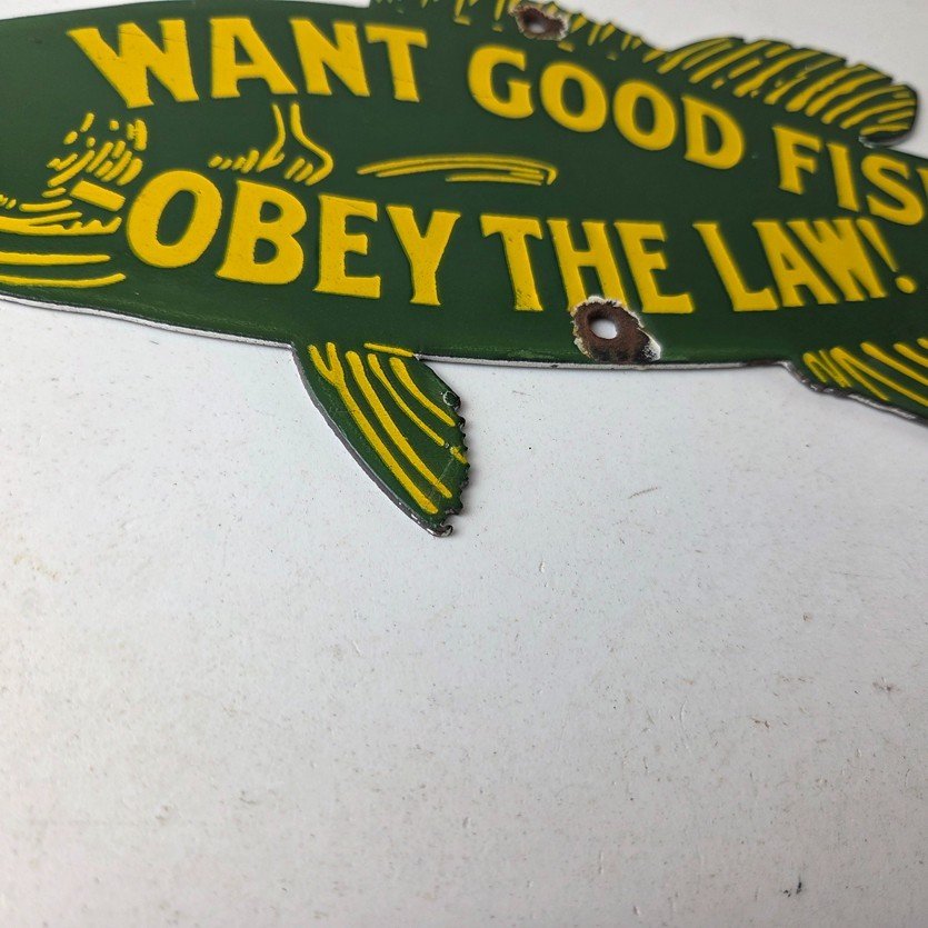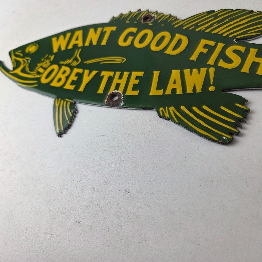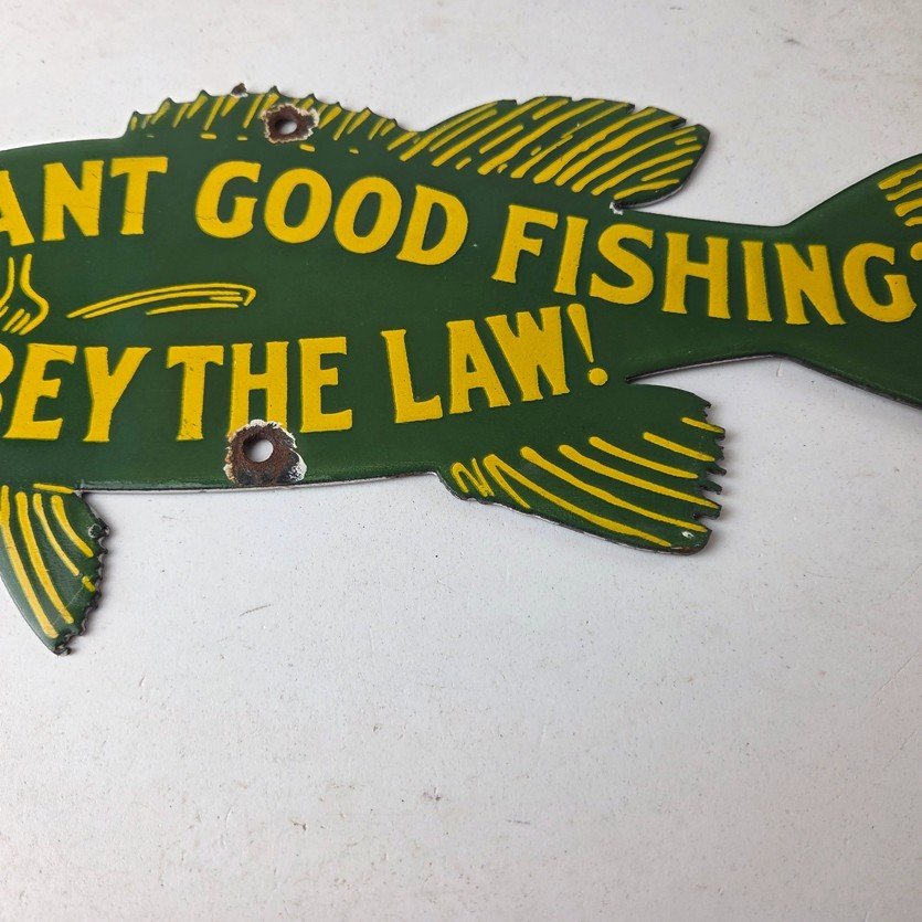 This vintage Obey the Law porcelain sign features the most iconic lure. The sign measures 12″ by 5″ and features excellent porcelain on both sides.