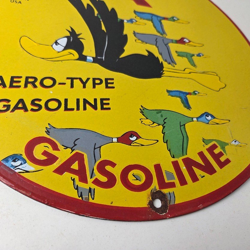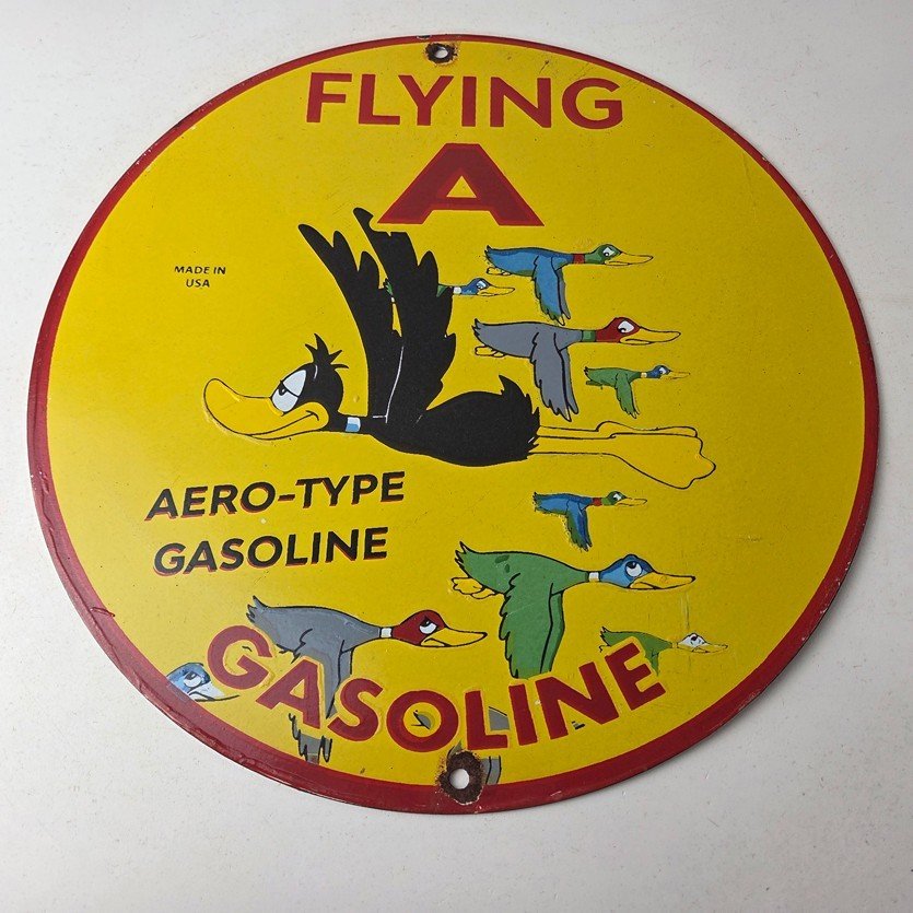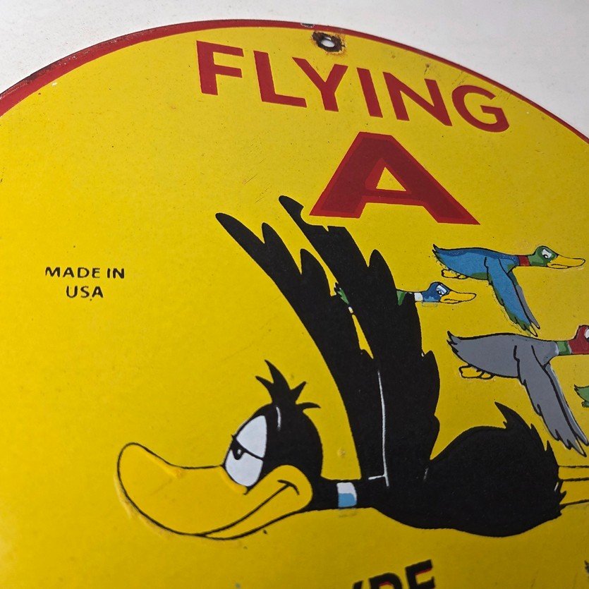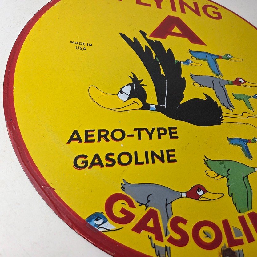 This vintage Flying A Gasoline porcelain sign features the iconic Flying A Gasoline brand and a colorful graphic of ducks in flight. Measuring at 12 inches, this sign is a must-have for any collector of gas and oil memorabilia. This Flying A Gasoline sign is sure to impress…