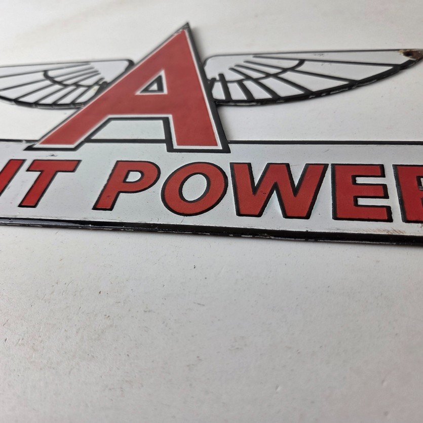 This vintage Flying A Gasoline porcelain sign is a must-have for any gas and oil advertising enthusiast. The sign features bold colors and prominently displays the Flying A brand. The sign is made of durable porcelain and would make a great addition to any service station or gas pump display.