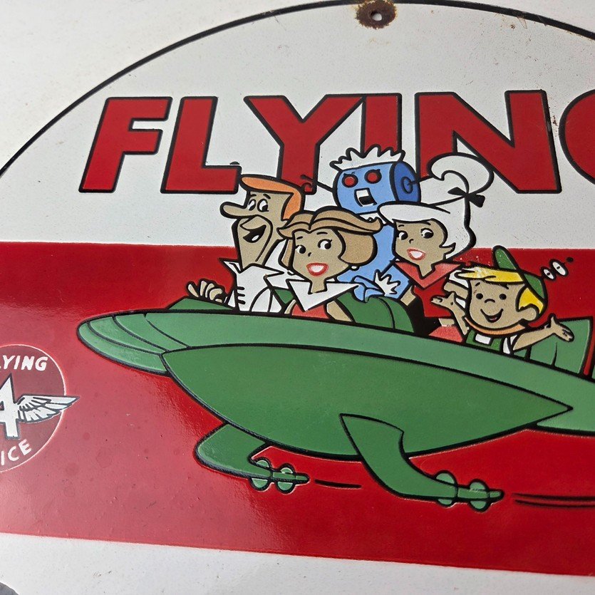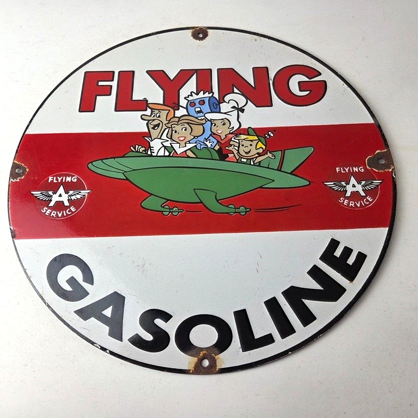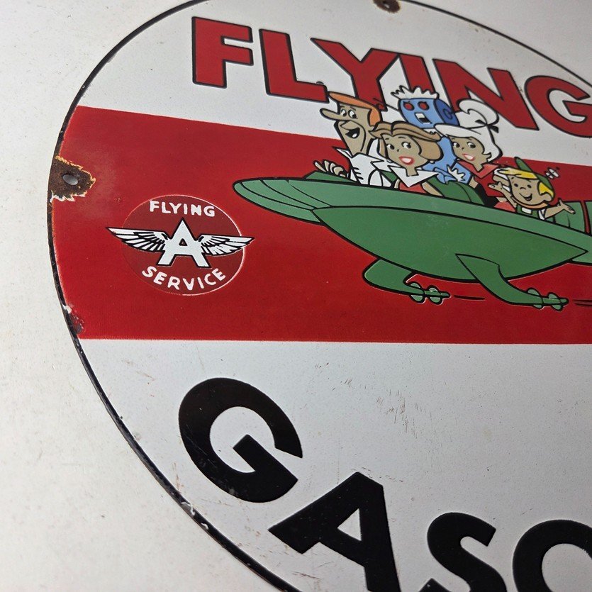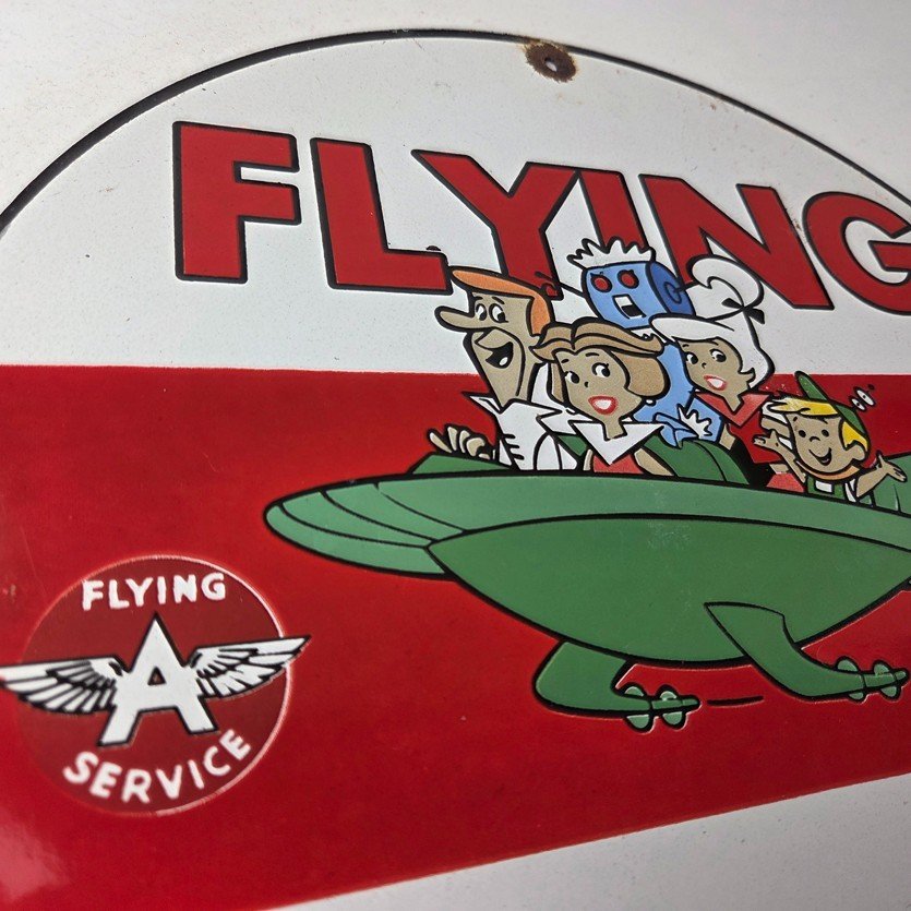This vintage porcelain sign featuring the Flying A advertising sign. The sign boasts a beautiful graphic of the Jetsons, with excellent porcelain and vivid color. The sign is in great condition and would make a wonderful addition to any collection or display.