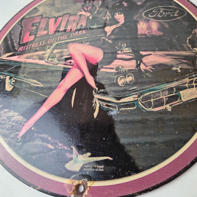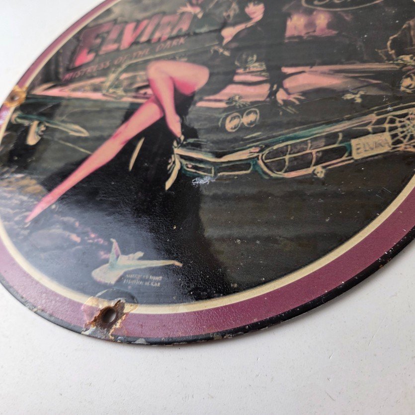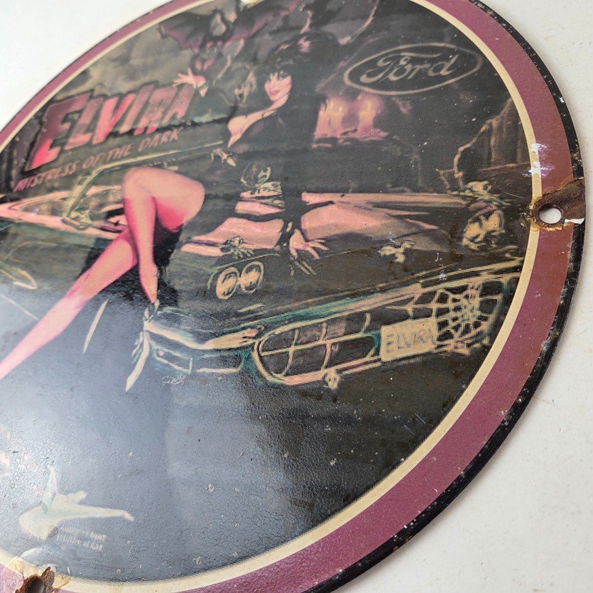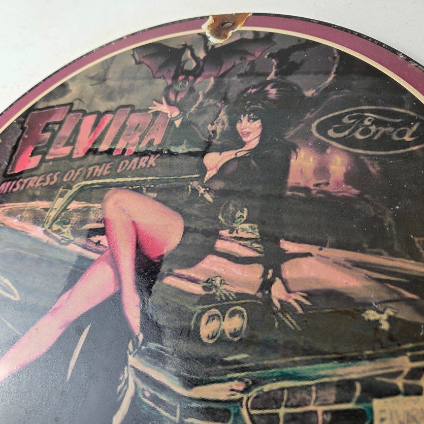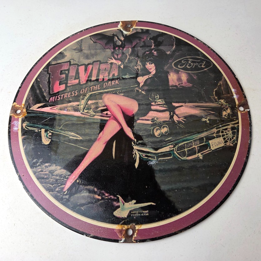 This vintage Ford porcelain sign features Elvira on top of the hood of a Ford and says Mistress of the night. This automobile sign measures 11 3/4″ across and has excellent porcelain on each side.