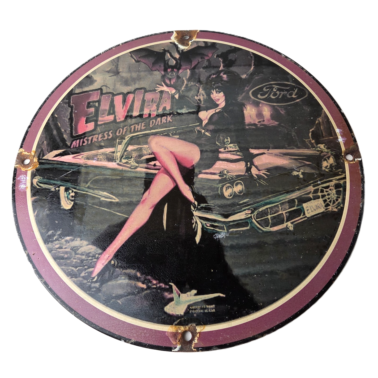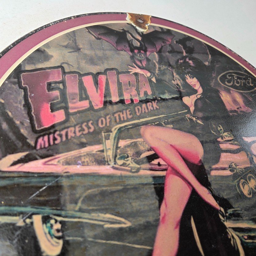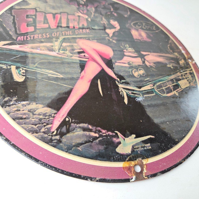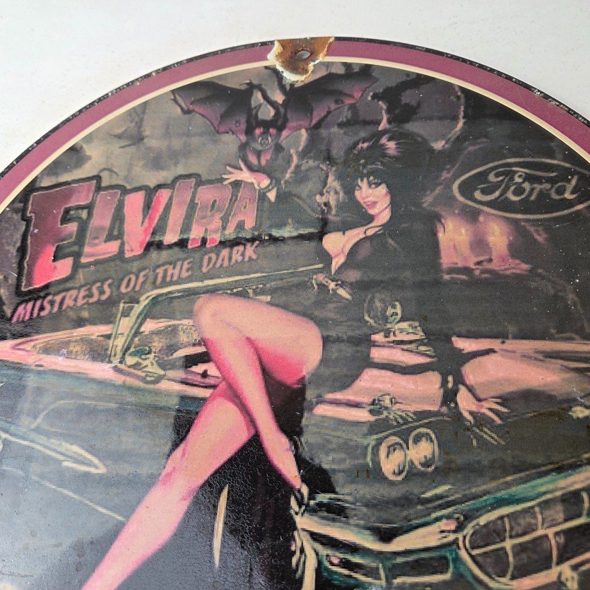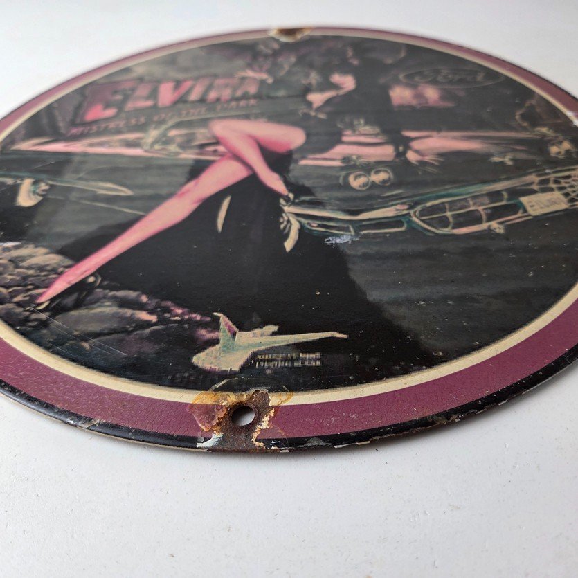 This vintage Ford porcelain sign features Elvira on top of the hood of a Ford and says Mistress of the night. This automobile sign measures 11 3/4″ across and has excellent porcelain on each side.