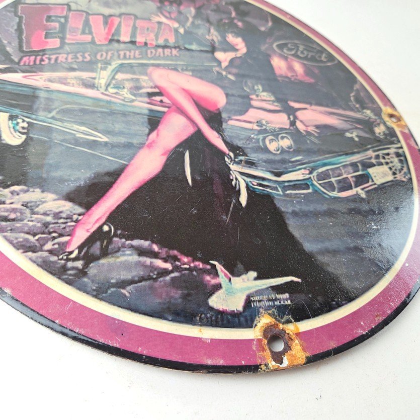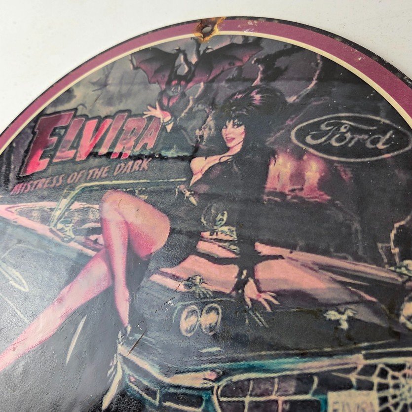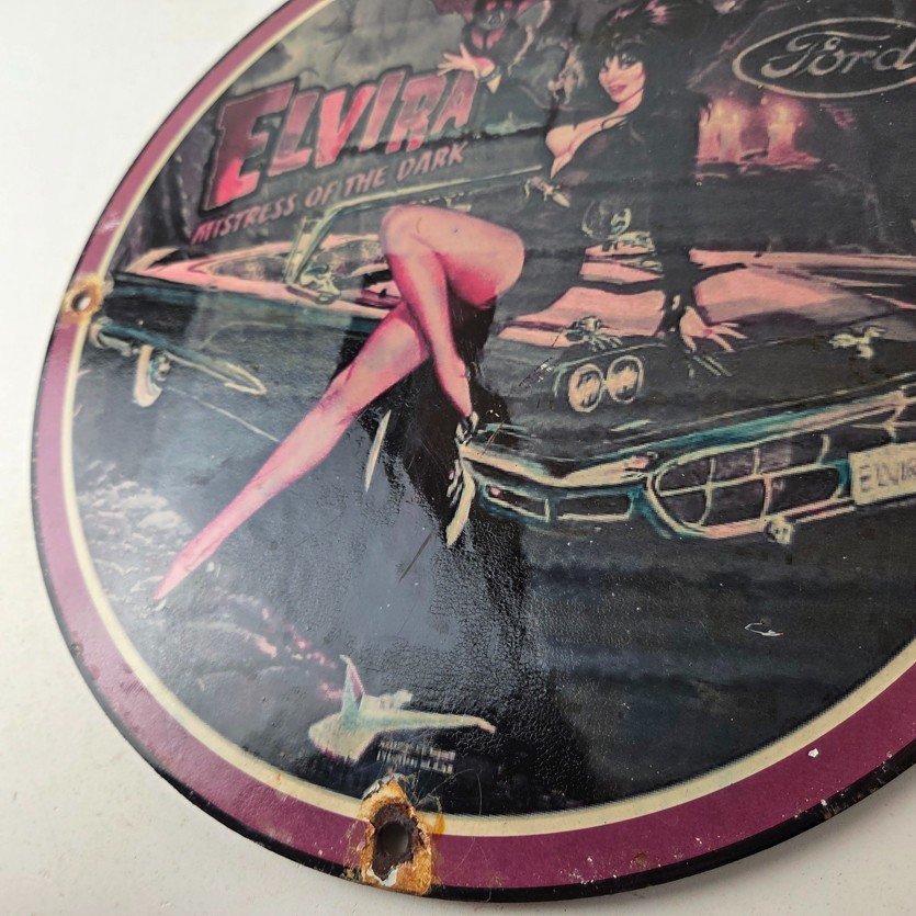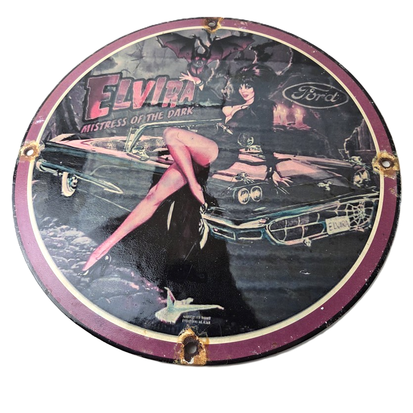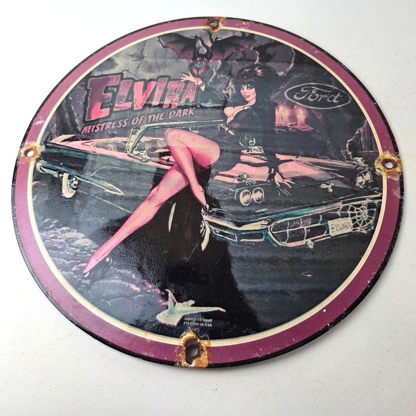 This vintage Ford porcelain sign features Elvira on top of the hood of a Ford and says Mistress of the night. This automobile sign measures 11 3/4″ across and has excellent porcelain on each side.