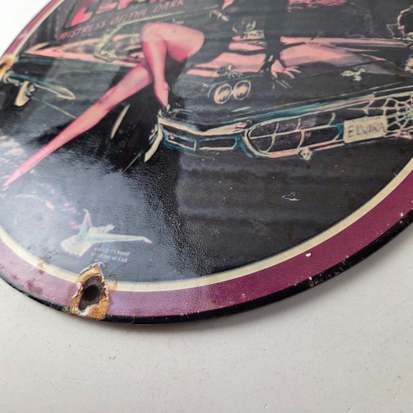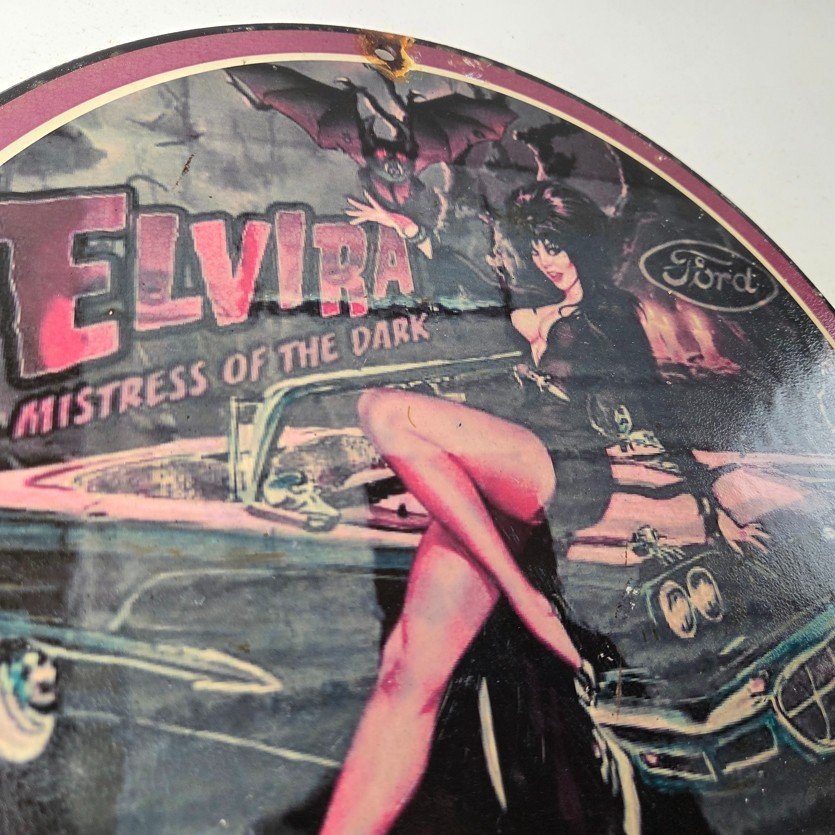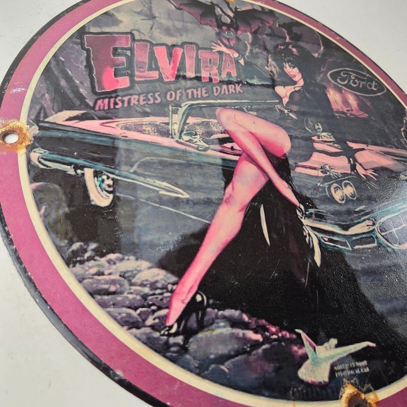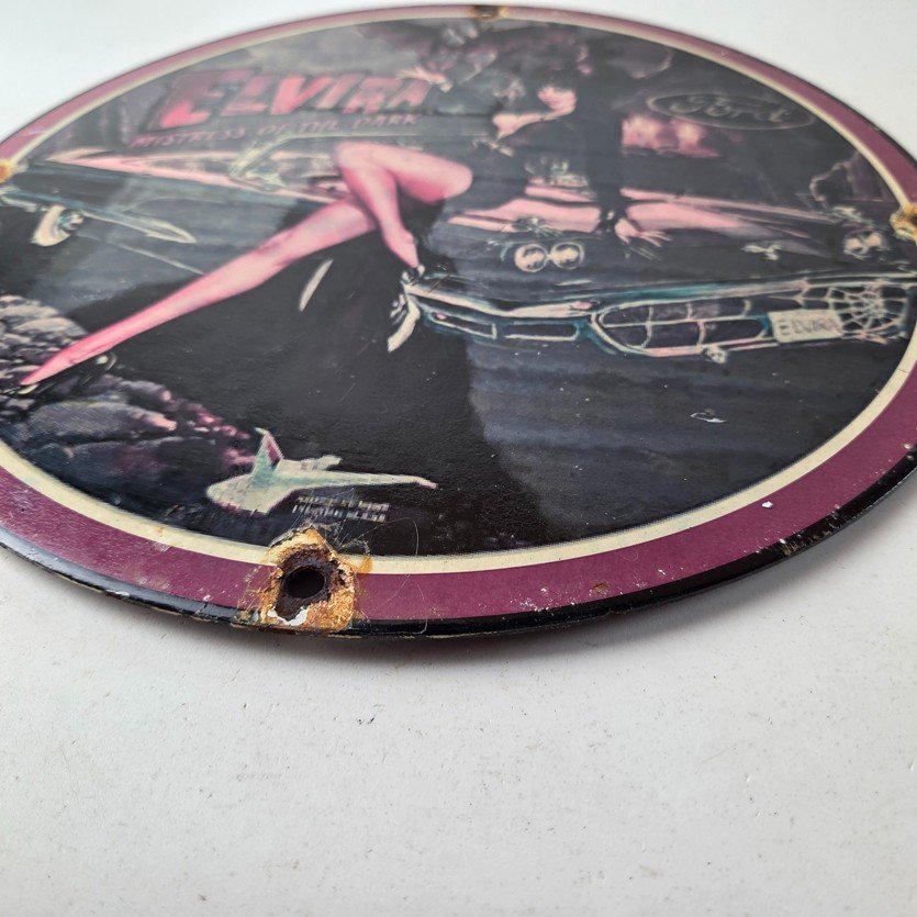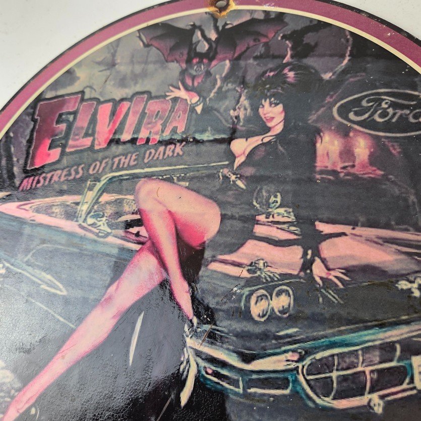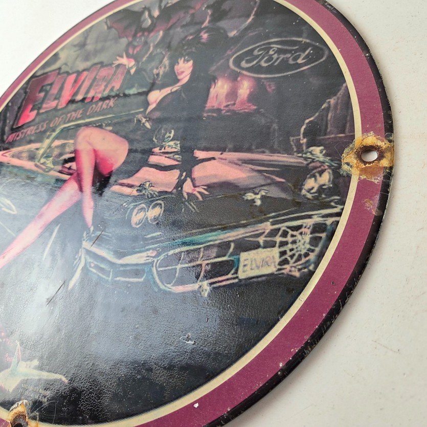 This vintage Ford porcelain sign features Elvira on top of the hood of a Ford and says Mistress of the night. This automobile sign measures 11 3/4″ across and has excellent porcelain on each side.