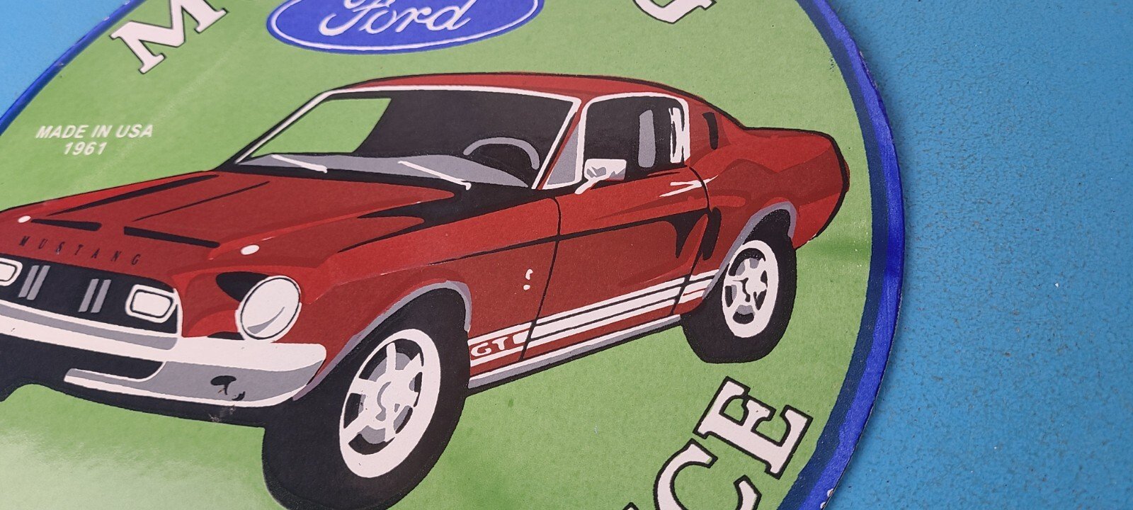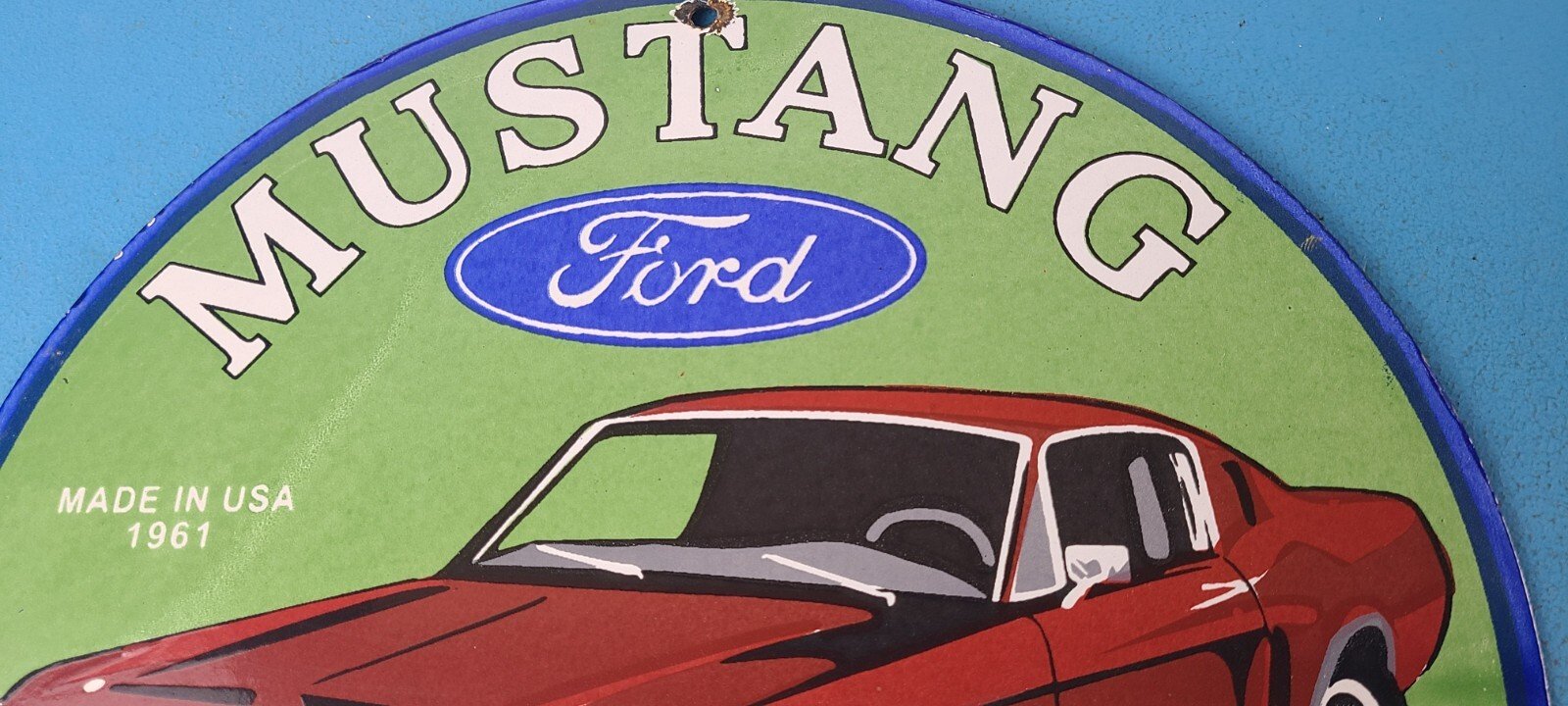 This vintage Ford porcelain sign features the old Mustang car and the Ford oval at the top. This automobile sign measures 12″ across and has excellent porcelain on each side.