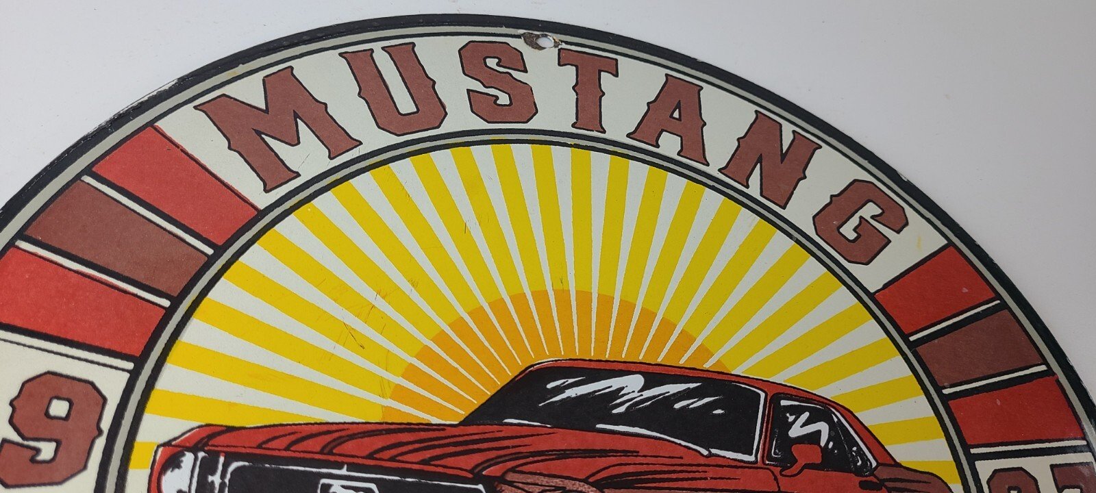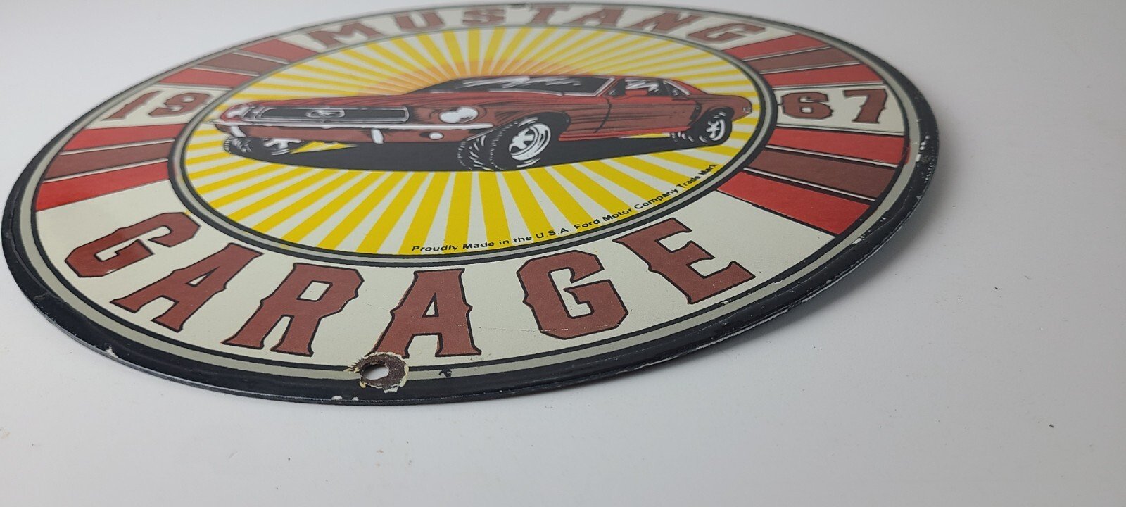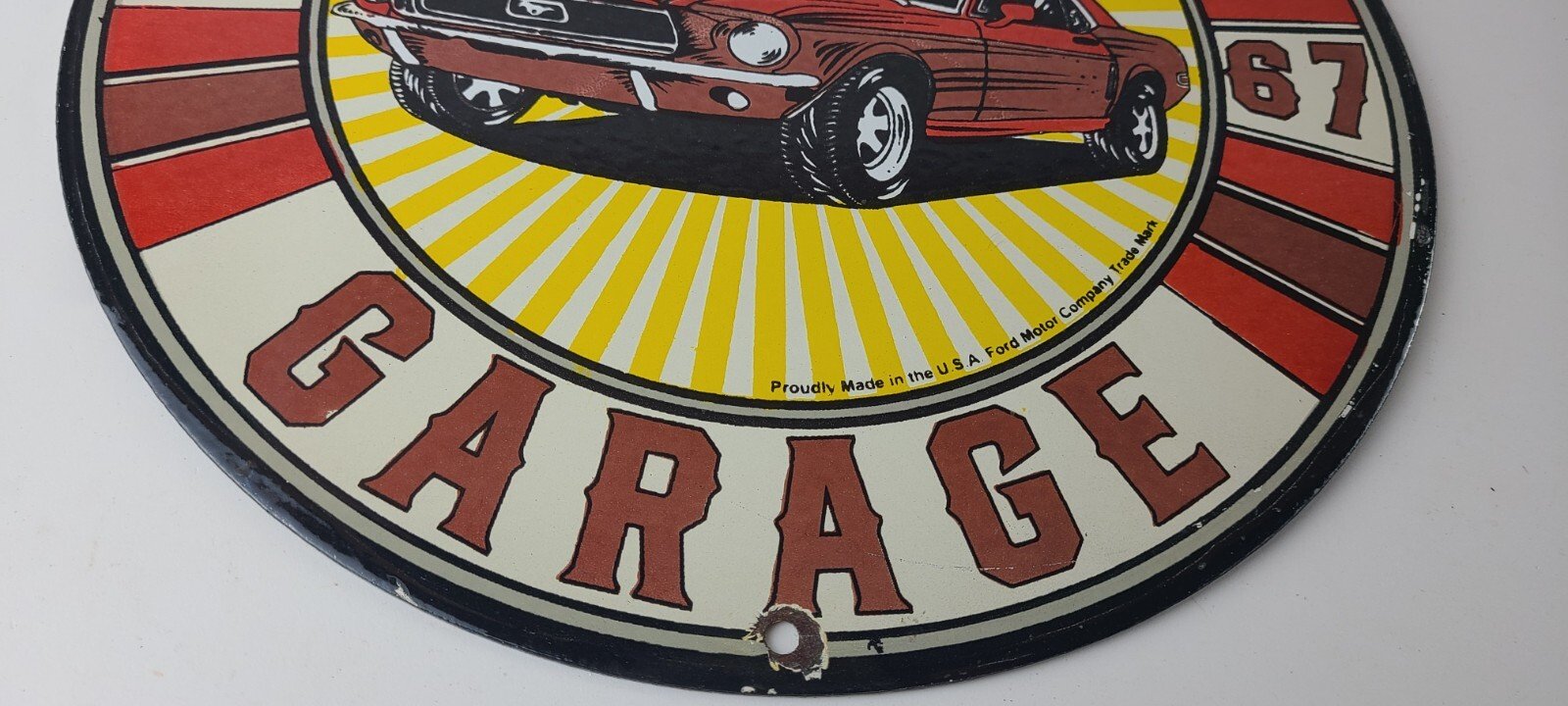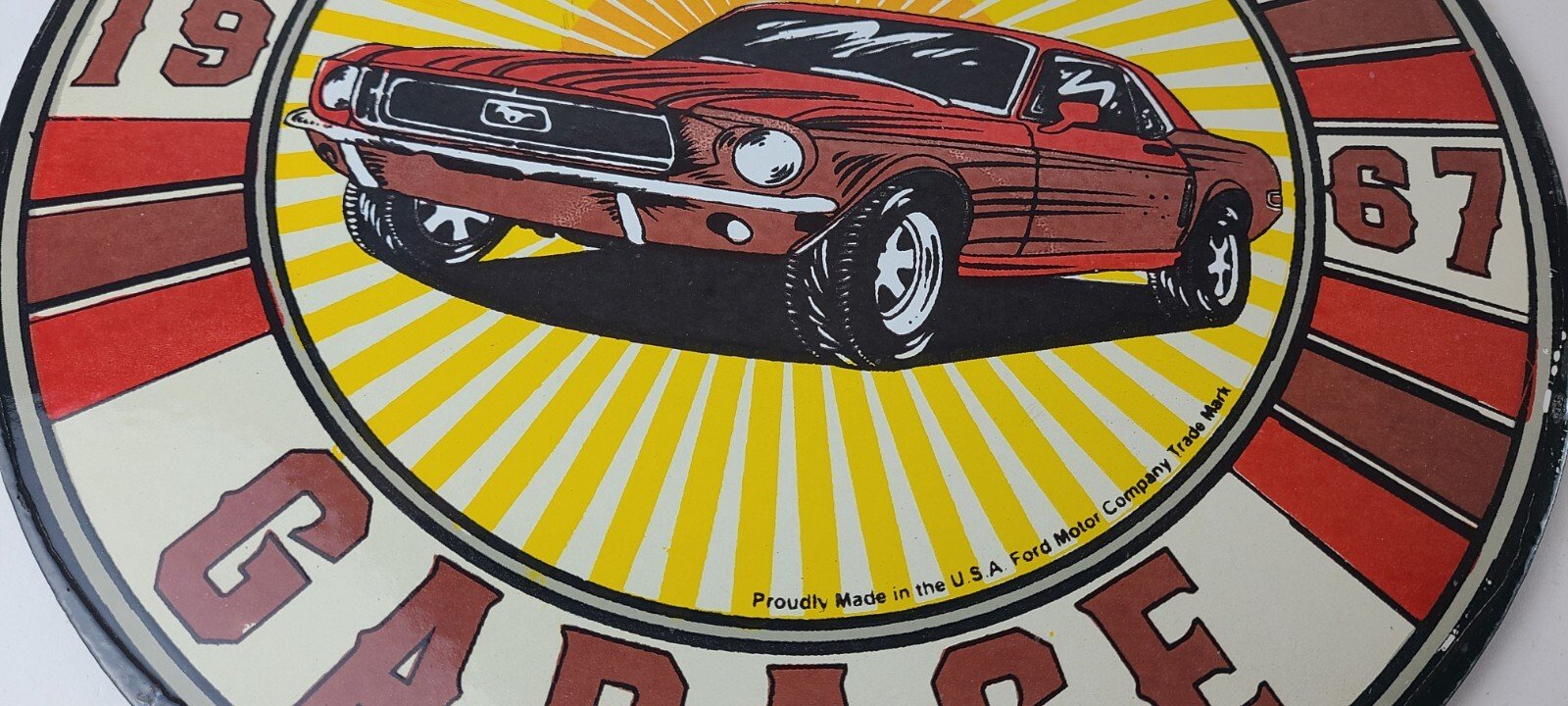 This vintage Ford porcelain sign features the old Mustang car and the large Mustang Garage lettering at the top and bottom. This automobile sign measures 12″ across and has excellent porcelain on each side.