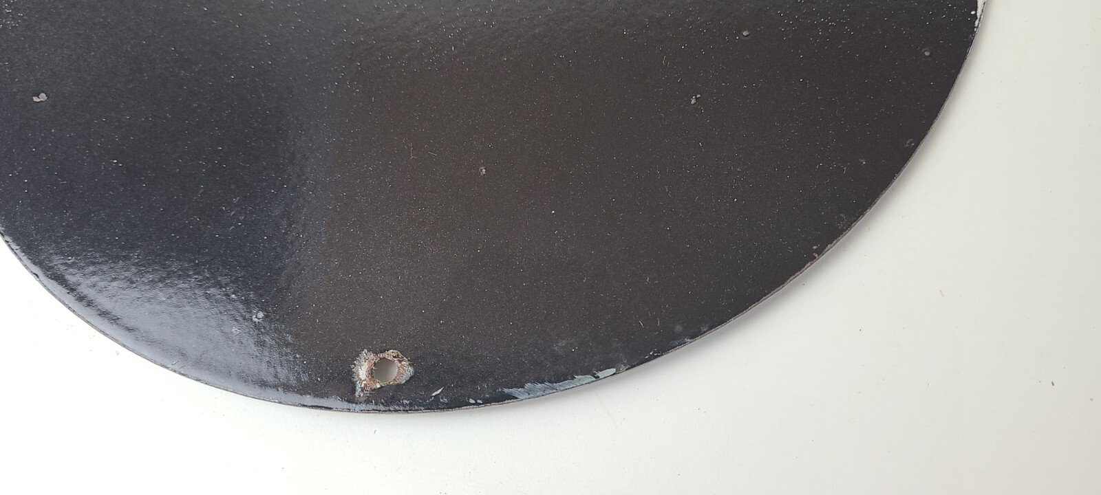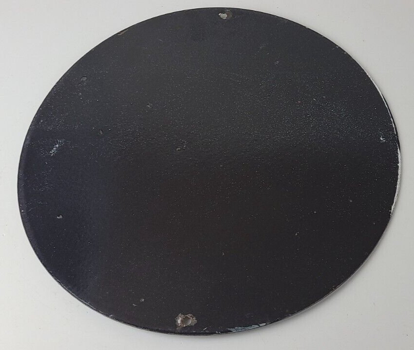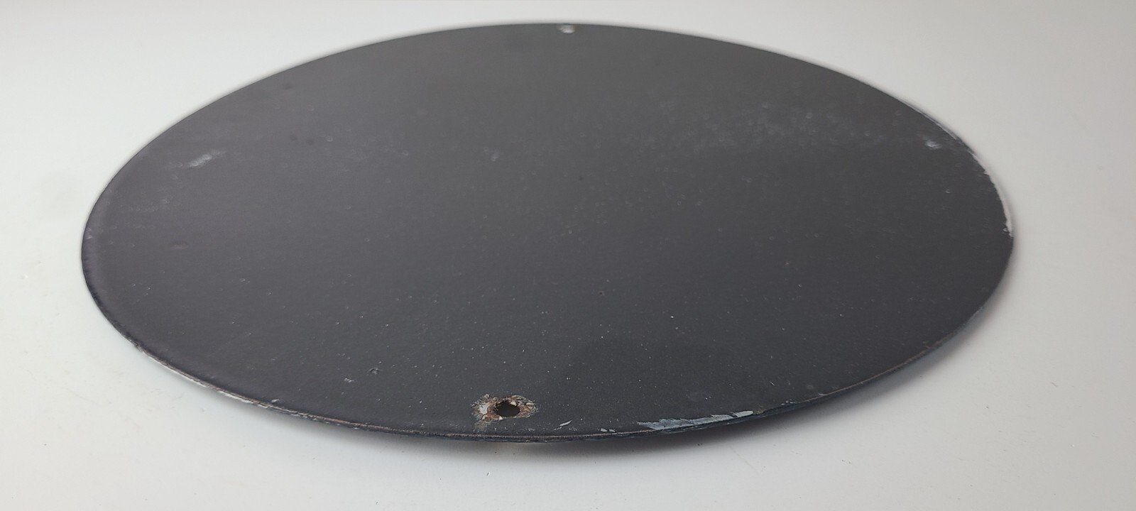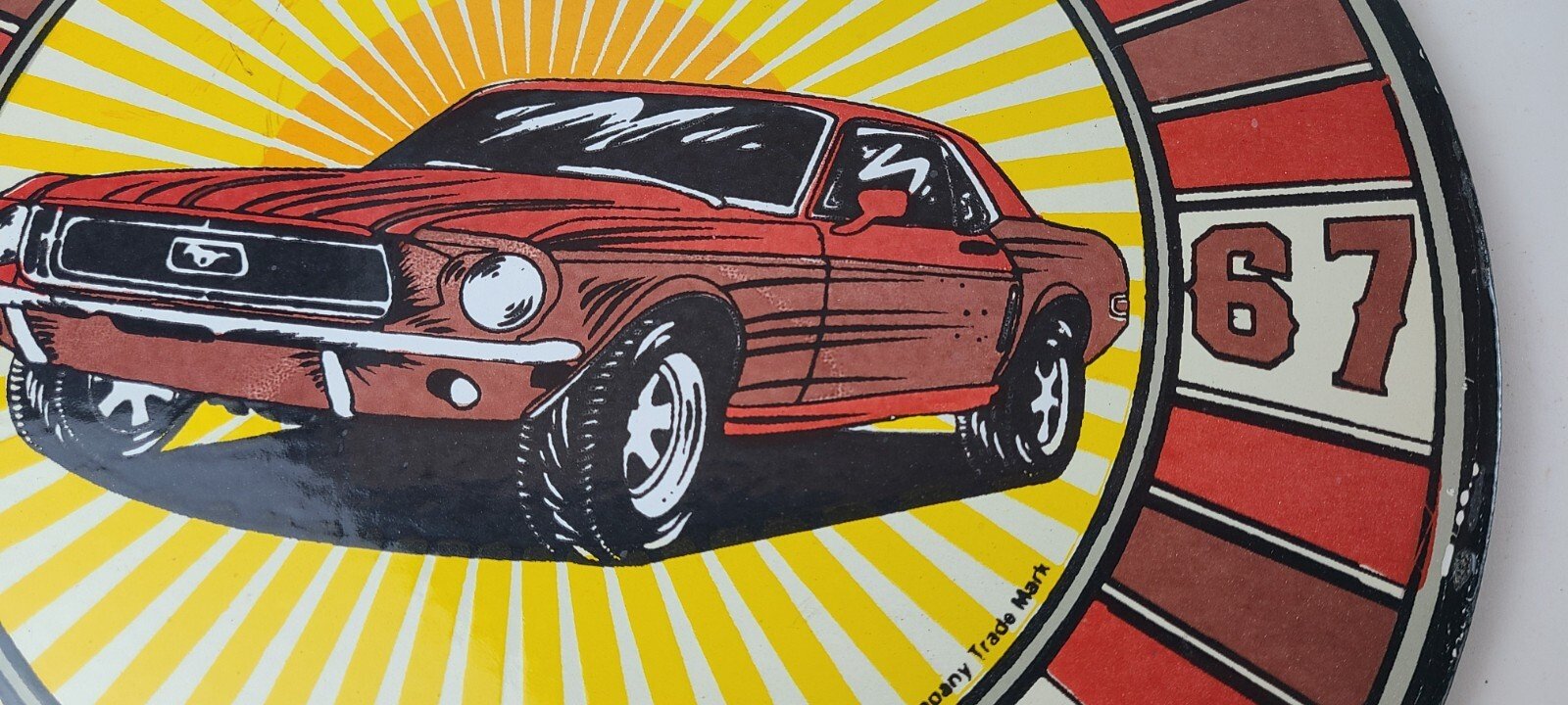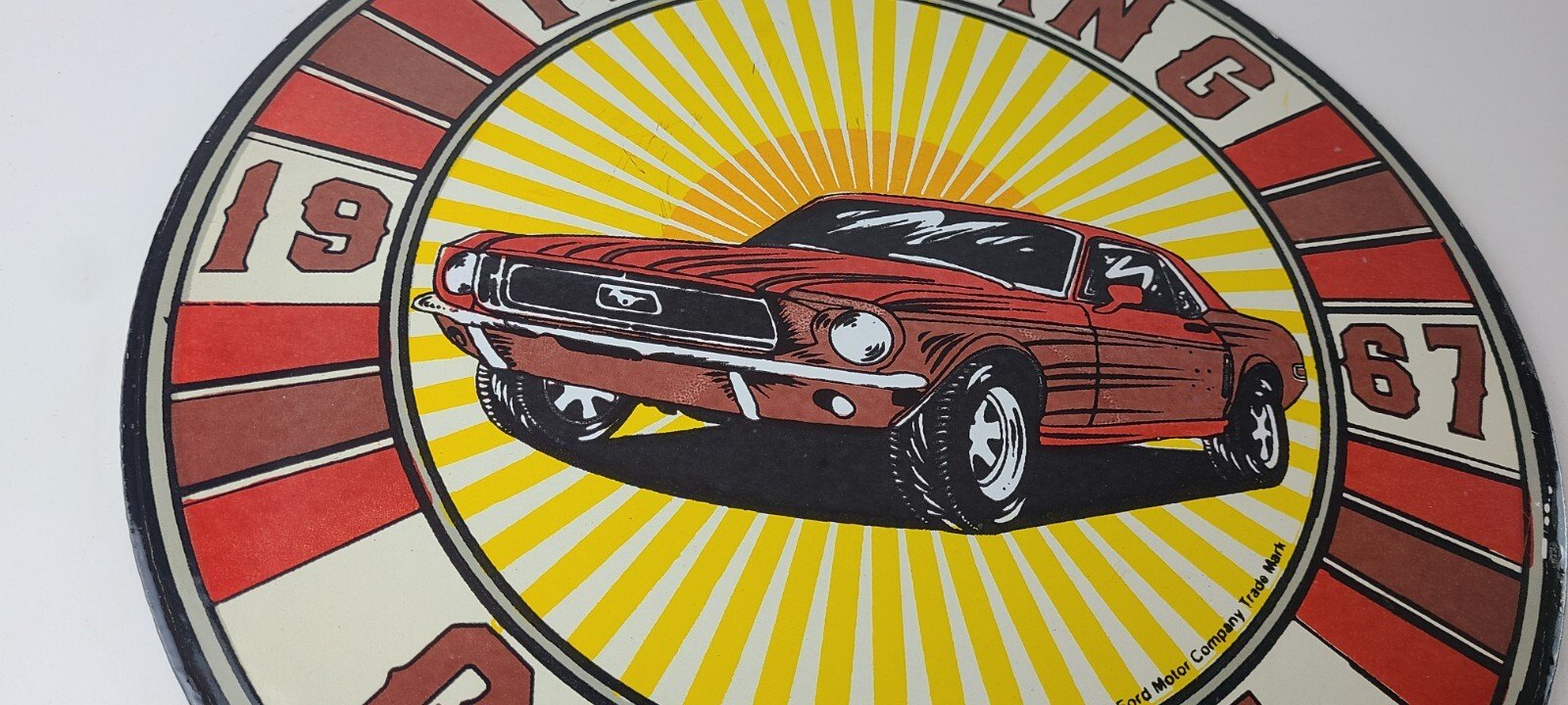 This vintage Ford porcelain sign features the old Mustang car and the large Mustang Garage lettering at the top and bottom. This automobile sign measures 12″ across and has excellent porcelain on each side.