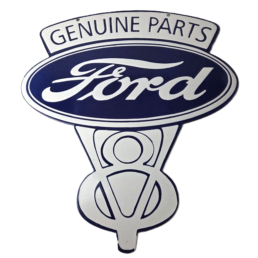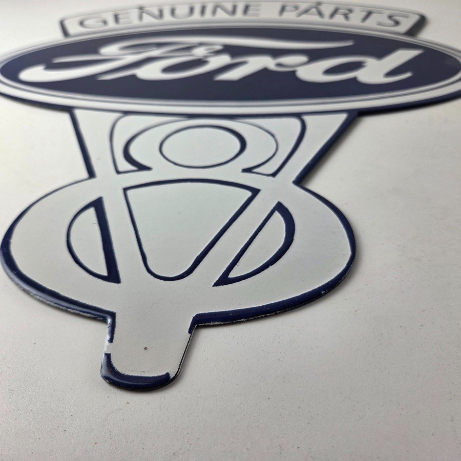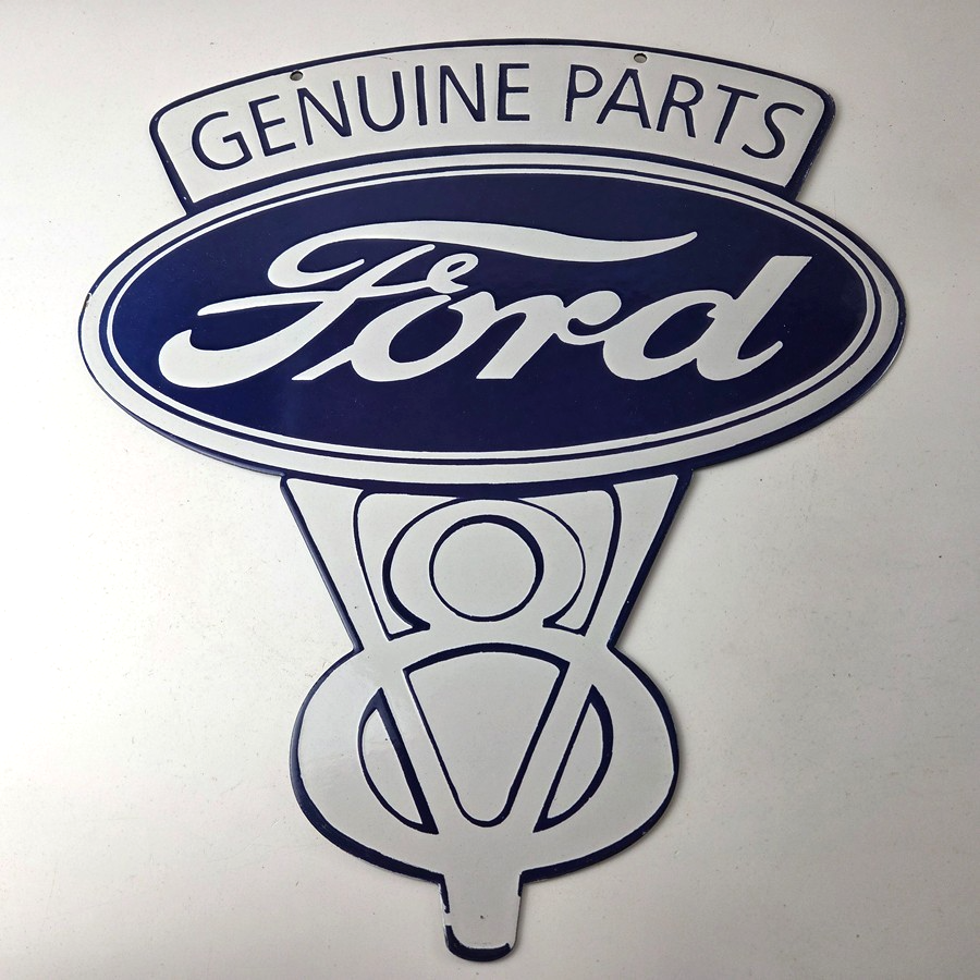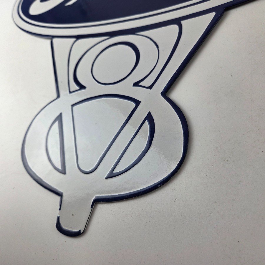 This vintage Ford porcelain sign features the large V8 lettering. This automobile sign measures 18″ across by 16″ and has excellent porcelain on each side.