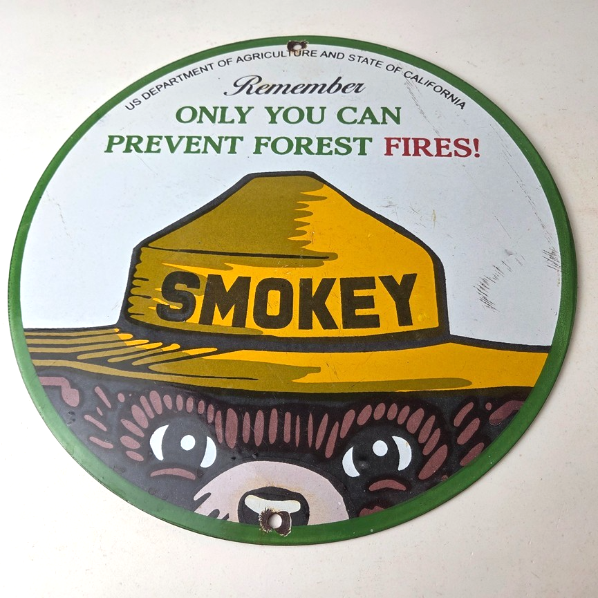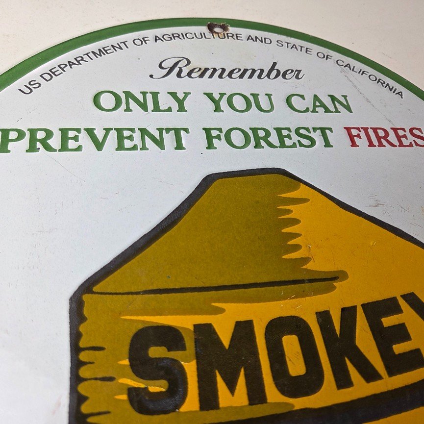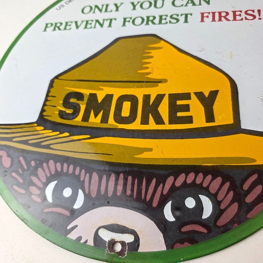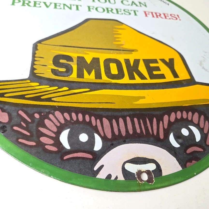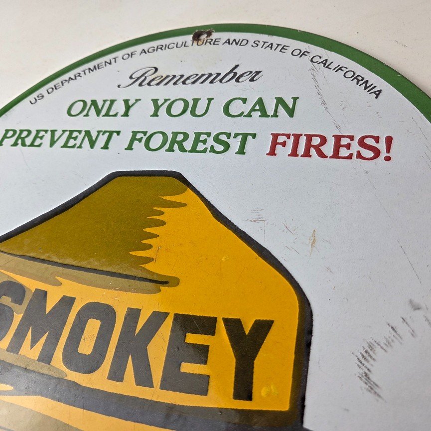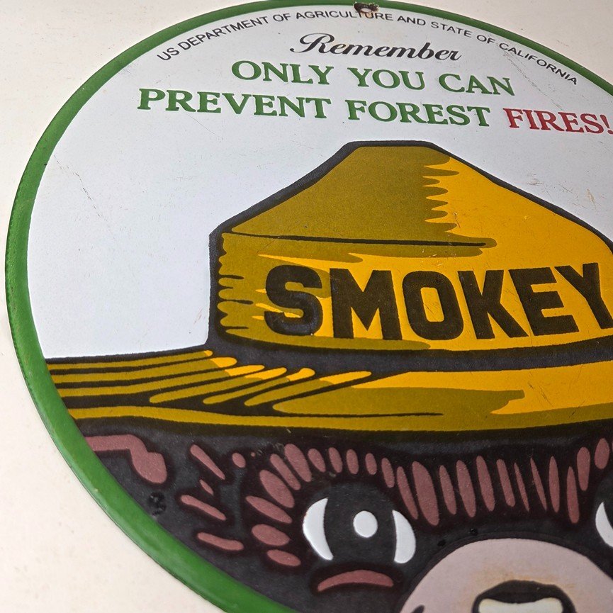 This vintage Prevent Forest Service porcelain sign features the iconic Agriculture Forest Service branding and is made of porcelain. The sign measures 12″ across and features Smokey the Bear.