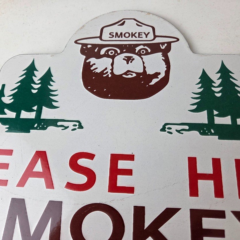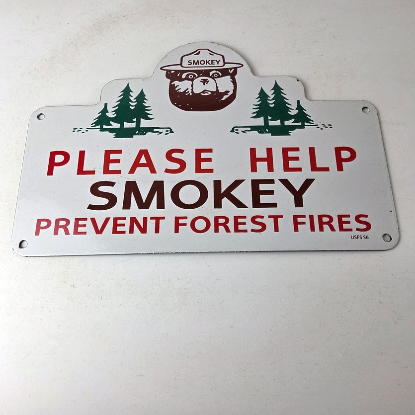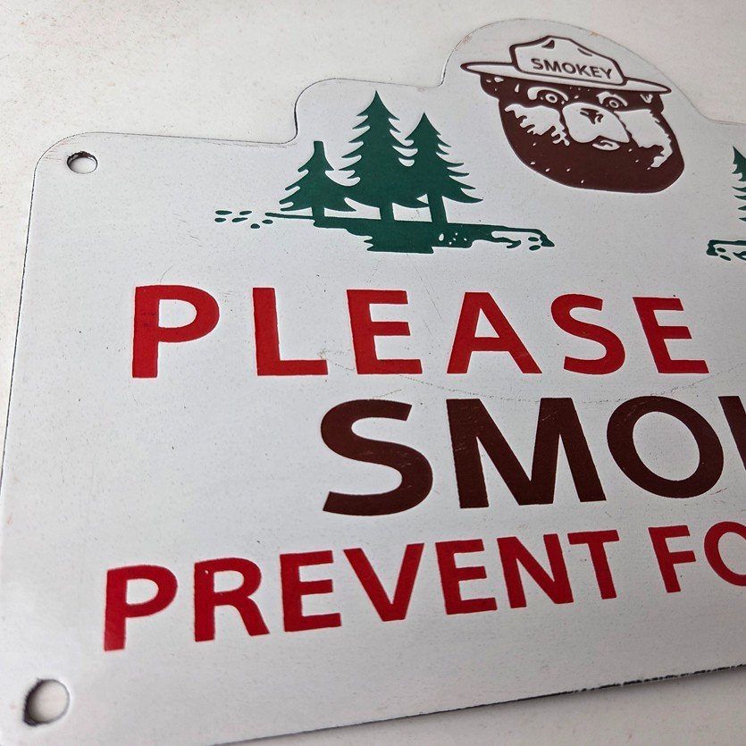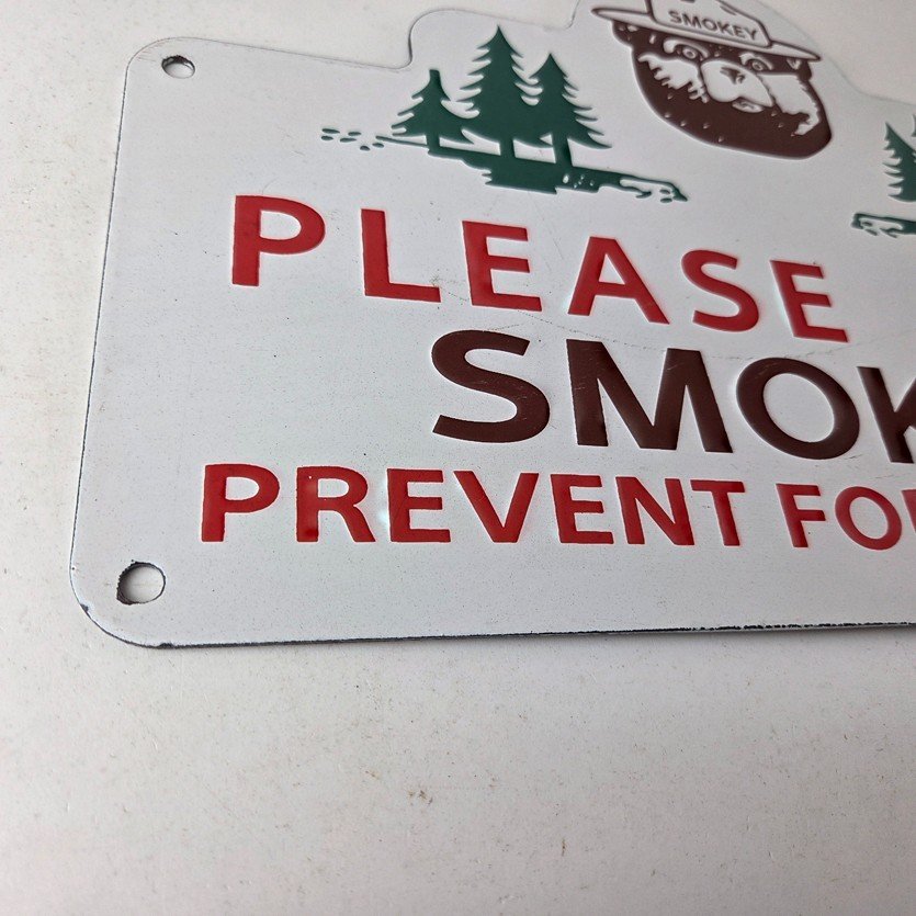 This vintage Forest Service porcelain sign features the iconic Forest Service branding and is made of porcelain. The sign measures 13″ across by 8 1/2″ tall and features Smokey the Bear and says “Please Help Smokey Prevent Forest Fires”.