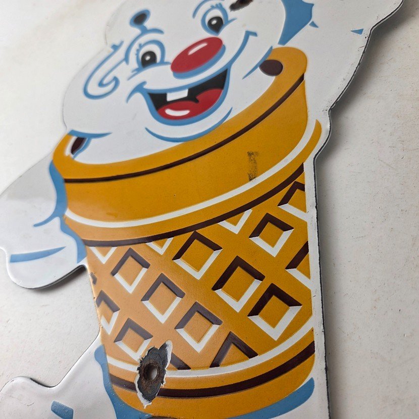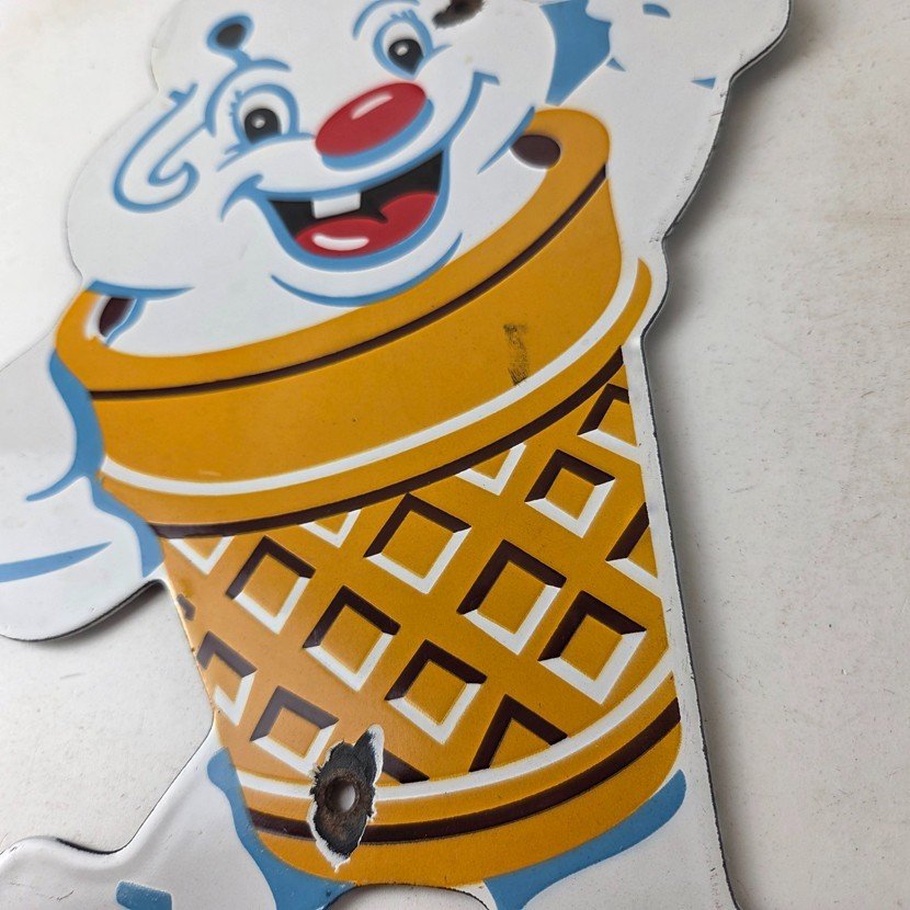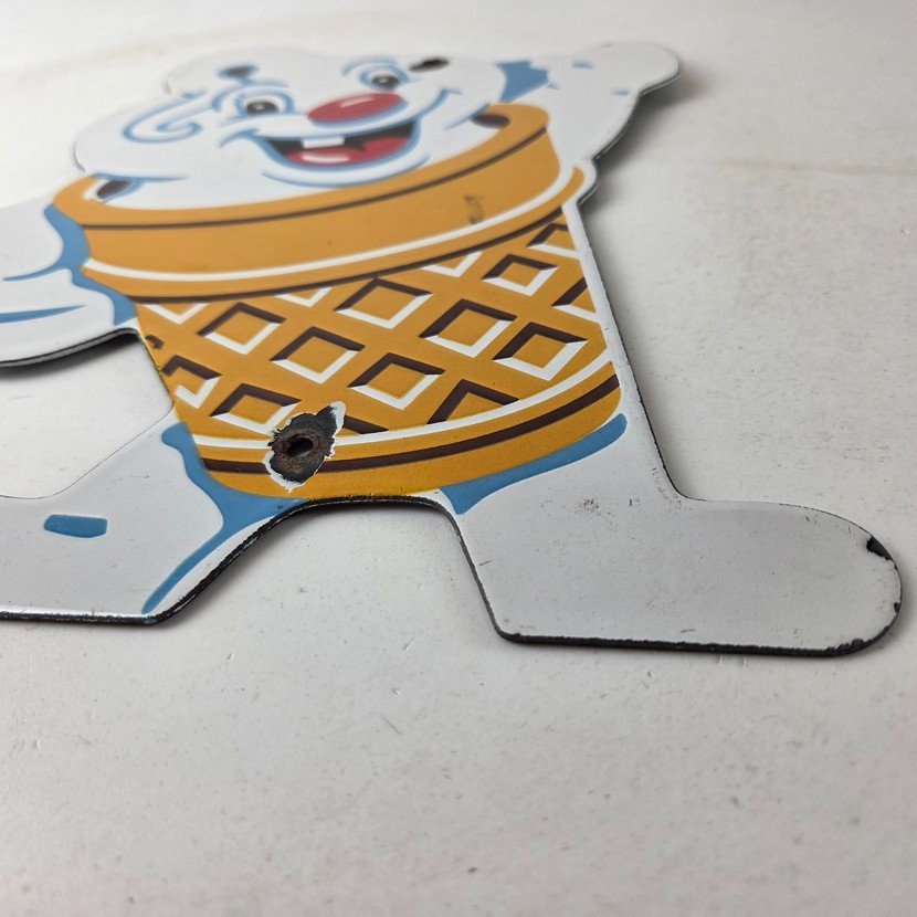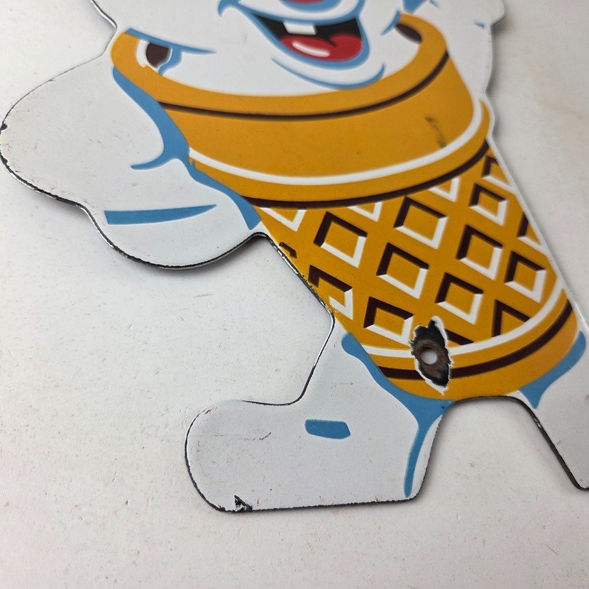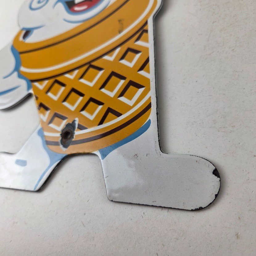 This vintage Fosters Freeze porcelain sign features the iconic Ice Cream cone. This sign is perfect for any Ice Cream cone fan or collector of memorabilia. This sign has high-quality porcelain on both sides and measures at 11″ by 8 1/2″.